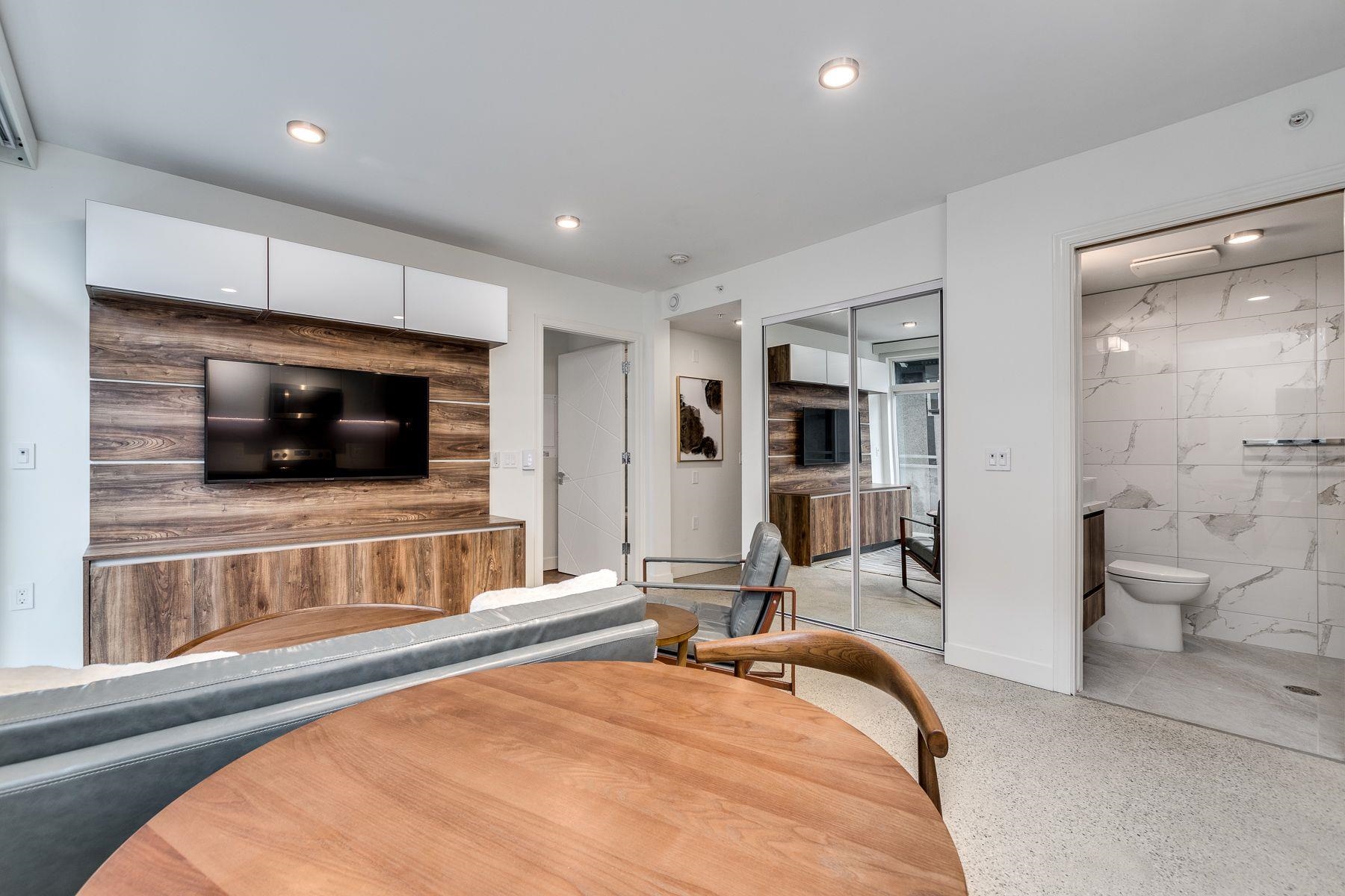 Oakwood,stained unit entry doors Touchpad smart unit entry locks Smart lighting Solid wood, noise-reducing doors throughout In-suite washers/dryers Stainless steel appliance package with OTR microwaves High-end kitchens: oak plywood cabinets, marble countertops and marble backsplashes, under counter LED lighting High-end bathrooms: oak plywood cabinets with marble backsplashes, Nuheat in-floor heating, wall tiling throughout Extensive oak plywood millwork in all units: wall-beds in all studios, custom tv ca...