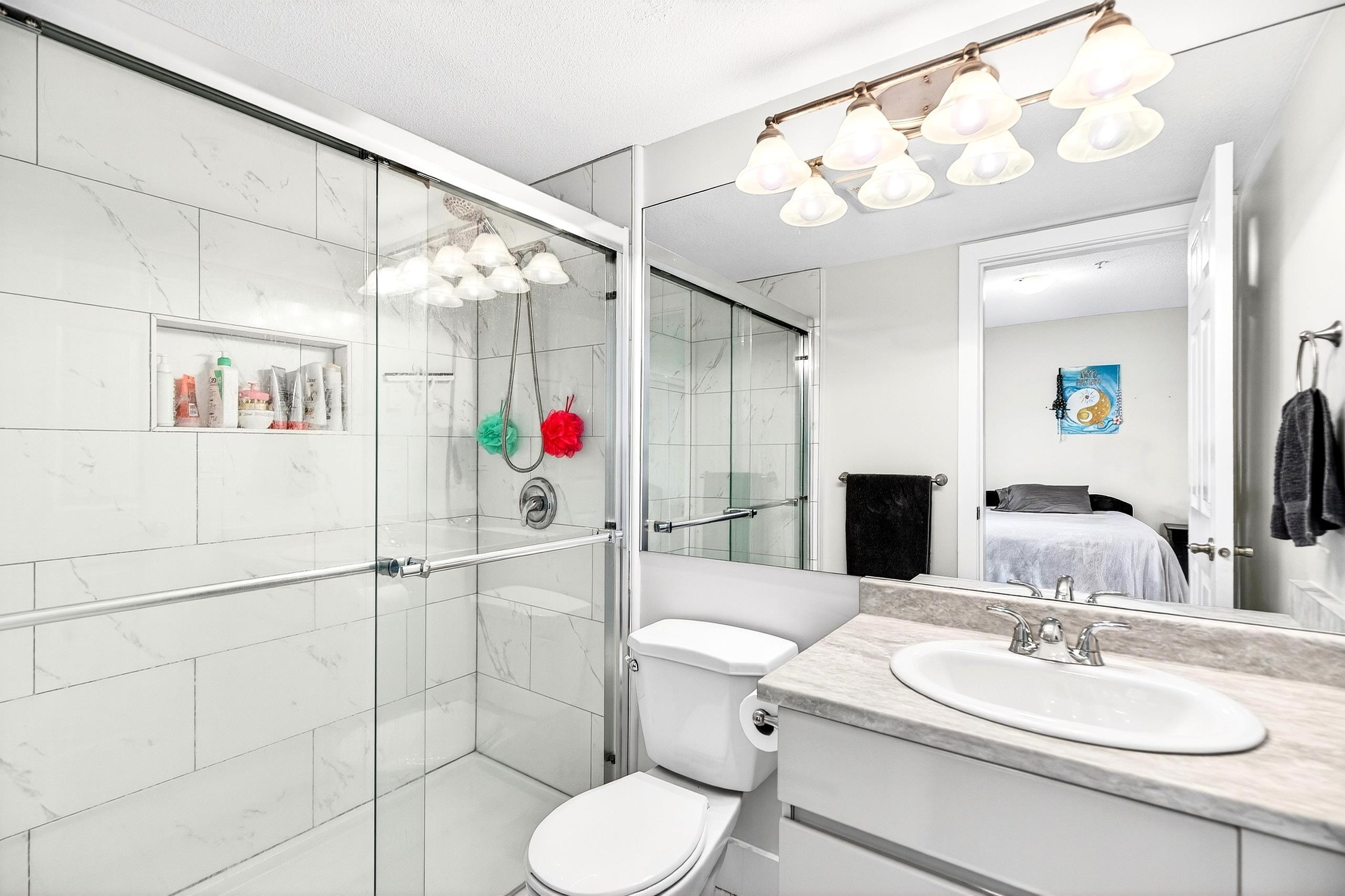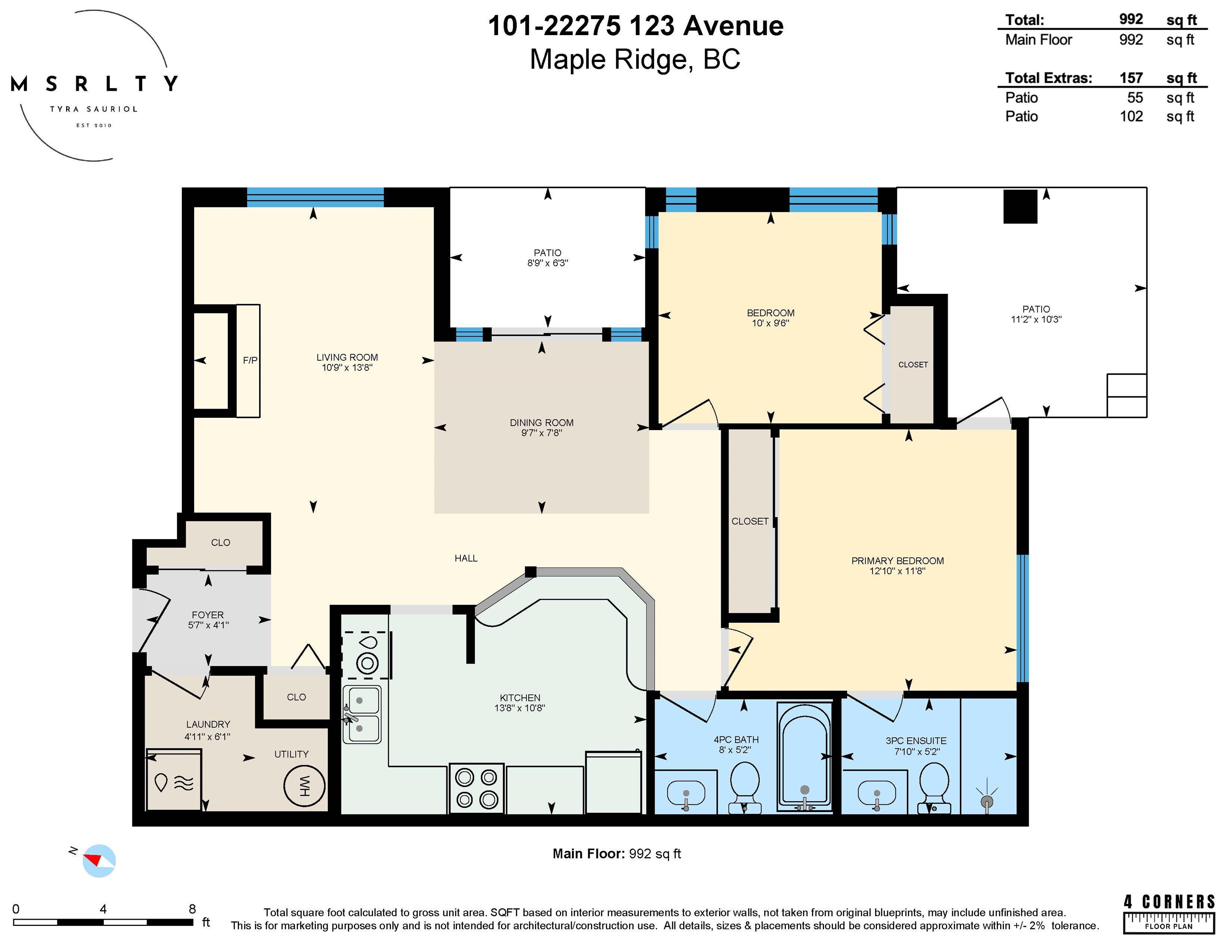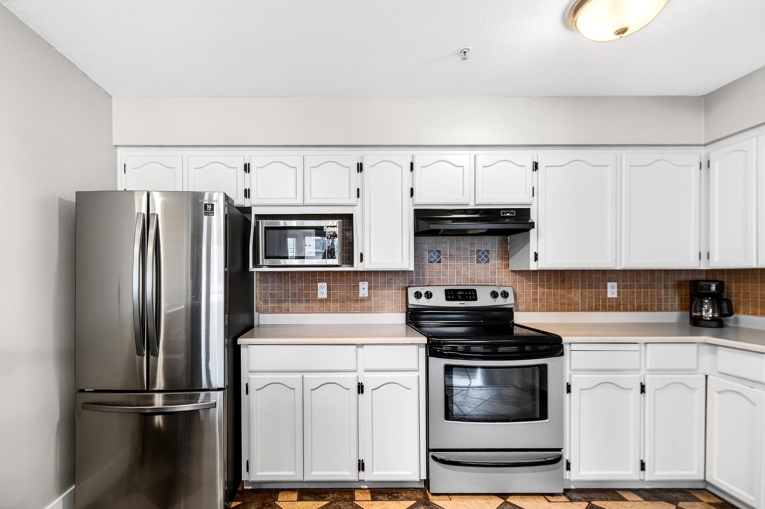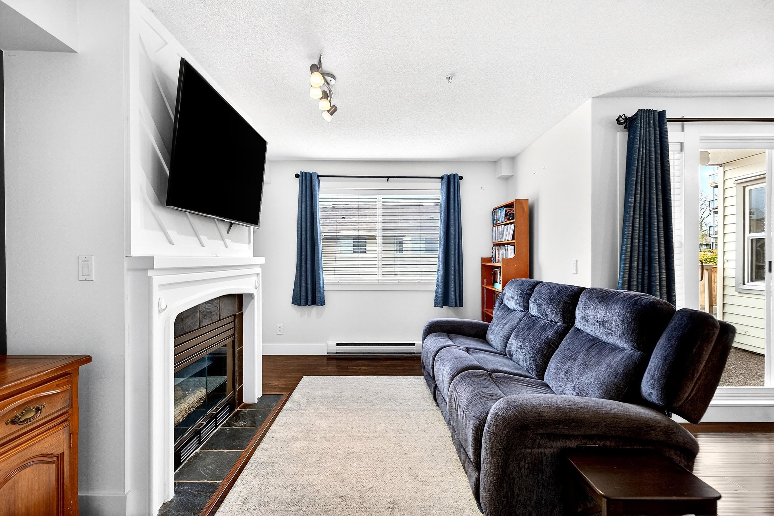 Mountain View Terrace - Welcome to this beautifully maintained 2 bed, 2 bath corner home tucked away on a quiet no through street. This raised garden level property is thoughtfully designed for seamless indoor outdoor living, featuring two generous patios for year round enjoyment, including a private retreat off the primary suite. The renovated ensuite is sure to impress, while the cozy gas fireplace adds warmth and ambiance. Enjoy the convenience of in suite laundry, 2 parking stalls, and a storage locker....