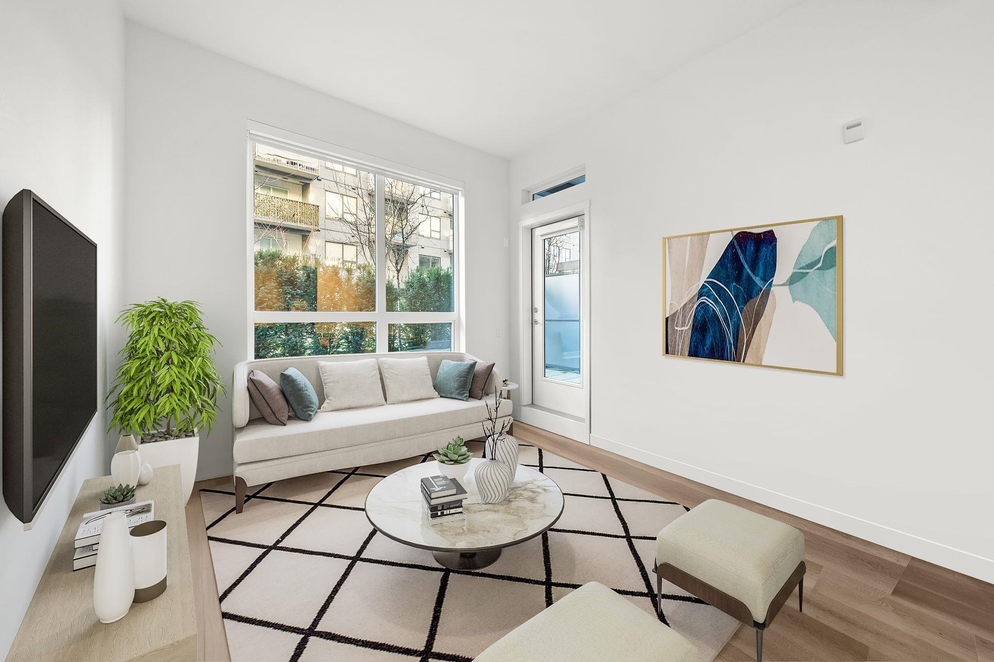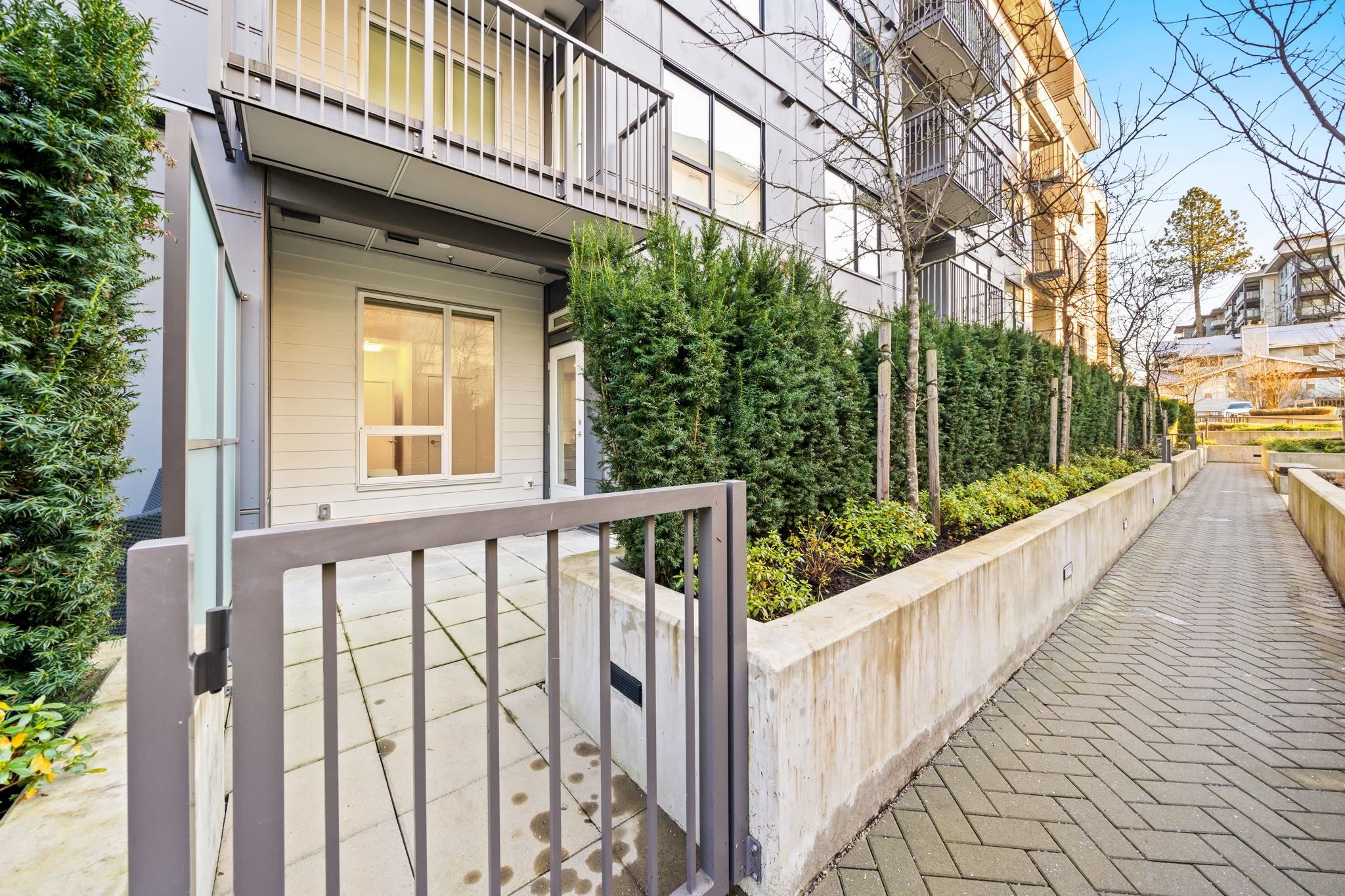 A truly unique offering at Port & Mill in West Coquitlam. This one-of-a-kind 1-bedroom home features soaring 9-foot ceilings & a sleek, functional kitchen complete w/ a gas range & ample storage. Enjoy direct access from the common courtyard—an ideal setup for pet owners, strollers, or anyone who values the ease of coming and going without relying on elevators. The expansive ground-level patio offers over 200 sq ft of private outdoor space, perfect for relaxing or entertaining. Built-in air conditioning ens...