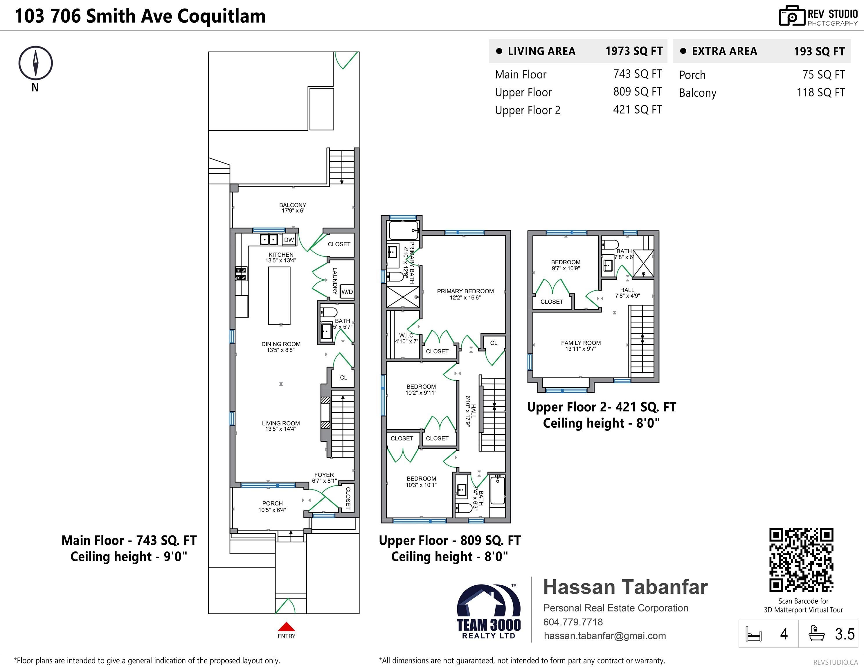 Experience the elegance of this high-quality, new-built 4 bed/3.5 bath, 1973 sq ft Side By Side Triplex Unit 103 This sunny, south-facing home offers 3 levels of well-designed luxury living on Smith Ave, Coquitlam. Main floor features hardwood, 9 ft ceilings, open living/dining, a high-end kitchen with quartz counters, pantry, and a large balcony. The second level offers a primary bedroom with luxe ensuite + 2 bedrooms and a full bath. The top level includes a family/office space + 1 bedroom plus full bath....