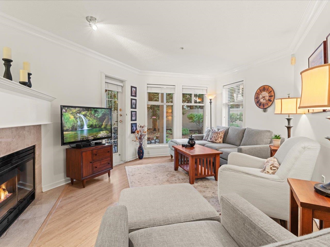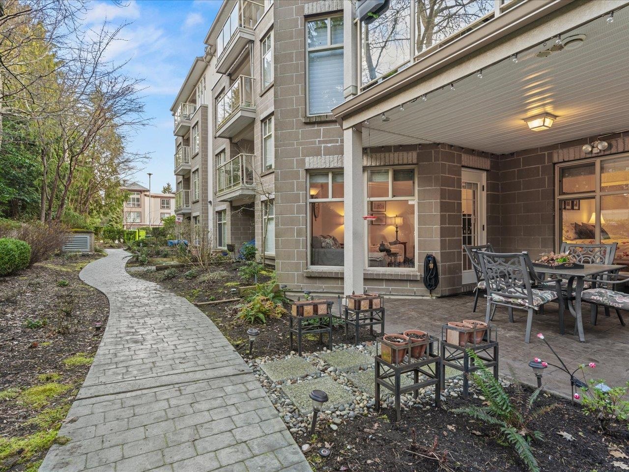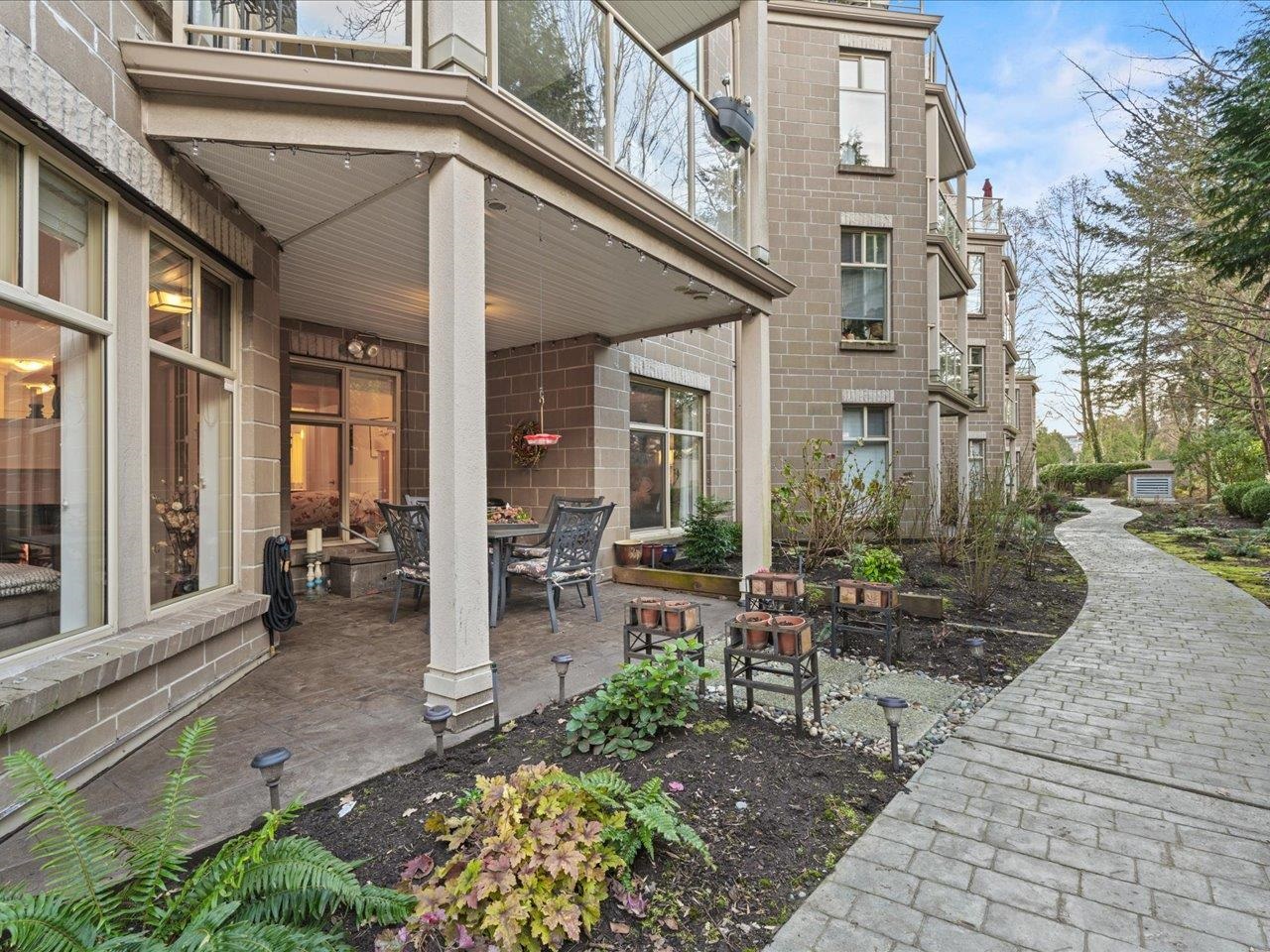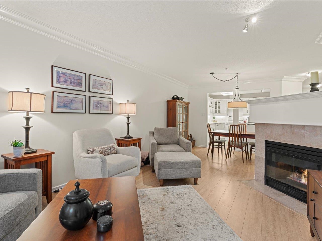STRATFORD GARDENS - Sought-after ground-level suite on the quiet side of the complex. Meticulously cared for, this spacious 1120sqft 2 bed/2 bath home offers a thoughtful layout and inviting living space with the added bonus of a private, west-exposed patio. Crown moldings and a cozy gas fireplace add timeless character. The generous primary bedroom features a full ensuite with soaker tub and separate shower. Beautifully maintained grounds with serene fountains and manicured gardens create a peaceful, relax...