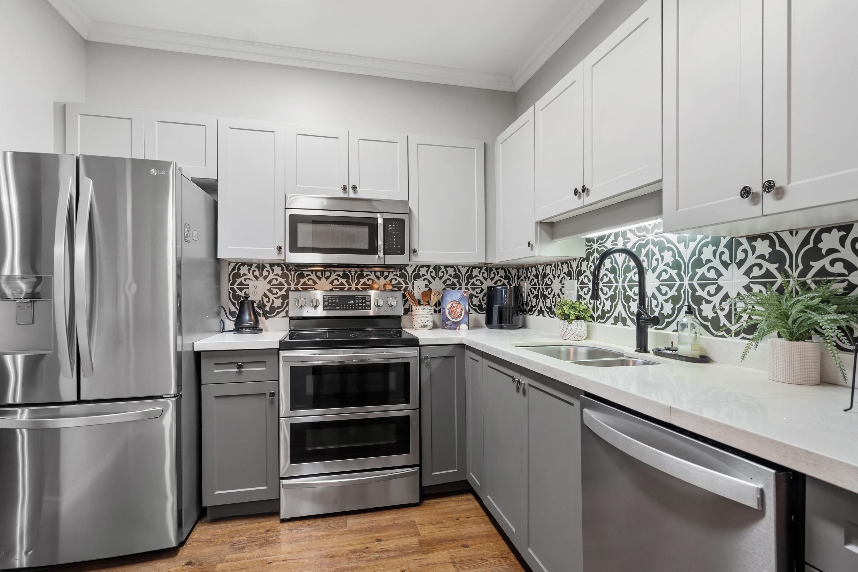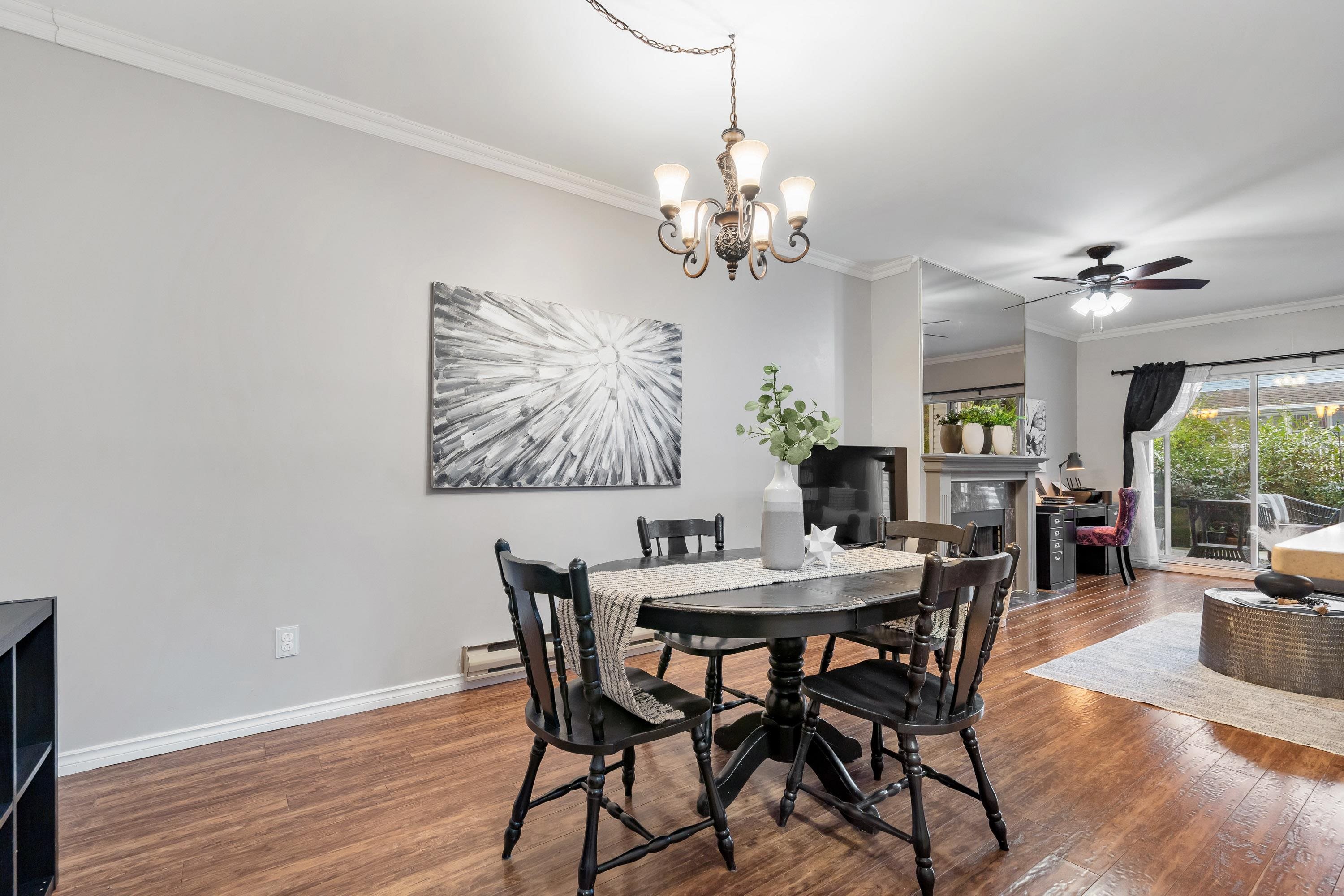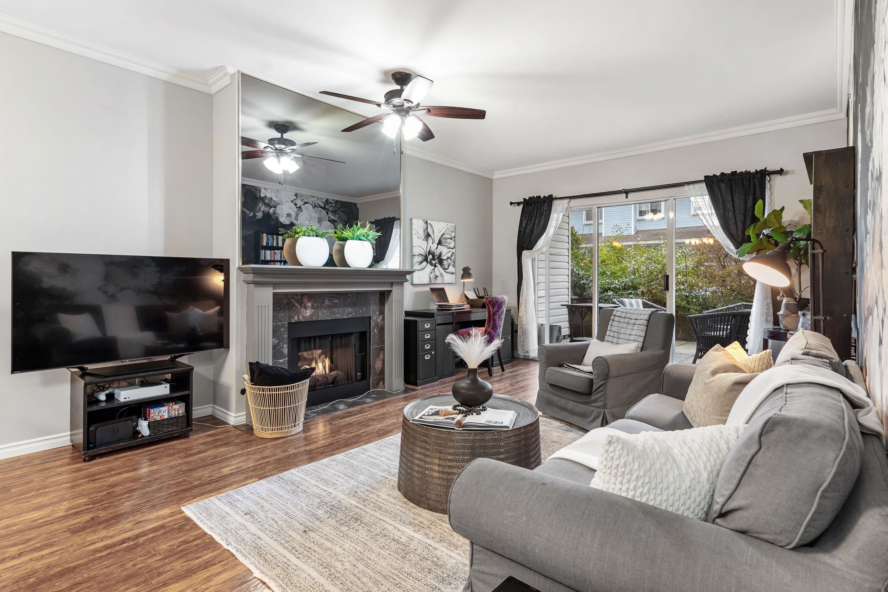 Large 2 bedroom/2 bath condo at Tudor Park In East Newton. Over 1200 square feet on the ground level and walk out to your private quiet patio looking out to the south facing garden area. Good size kitchen w/granite counters, stainless steel appliances. Extra large living room and separate dining space. Cozy gas fireplace w/ gas included in strata fee. Very well maintained complex with resort living amenities: outdoor swimming pool, hot tub, exercise centre, tennis courts, party room and guest suite. Walking...