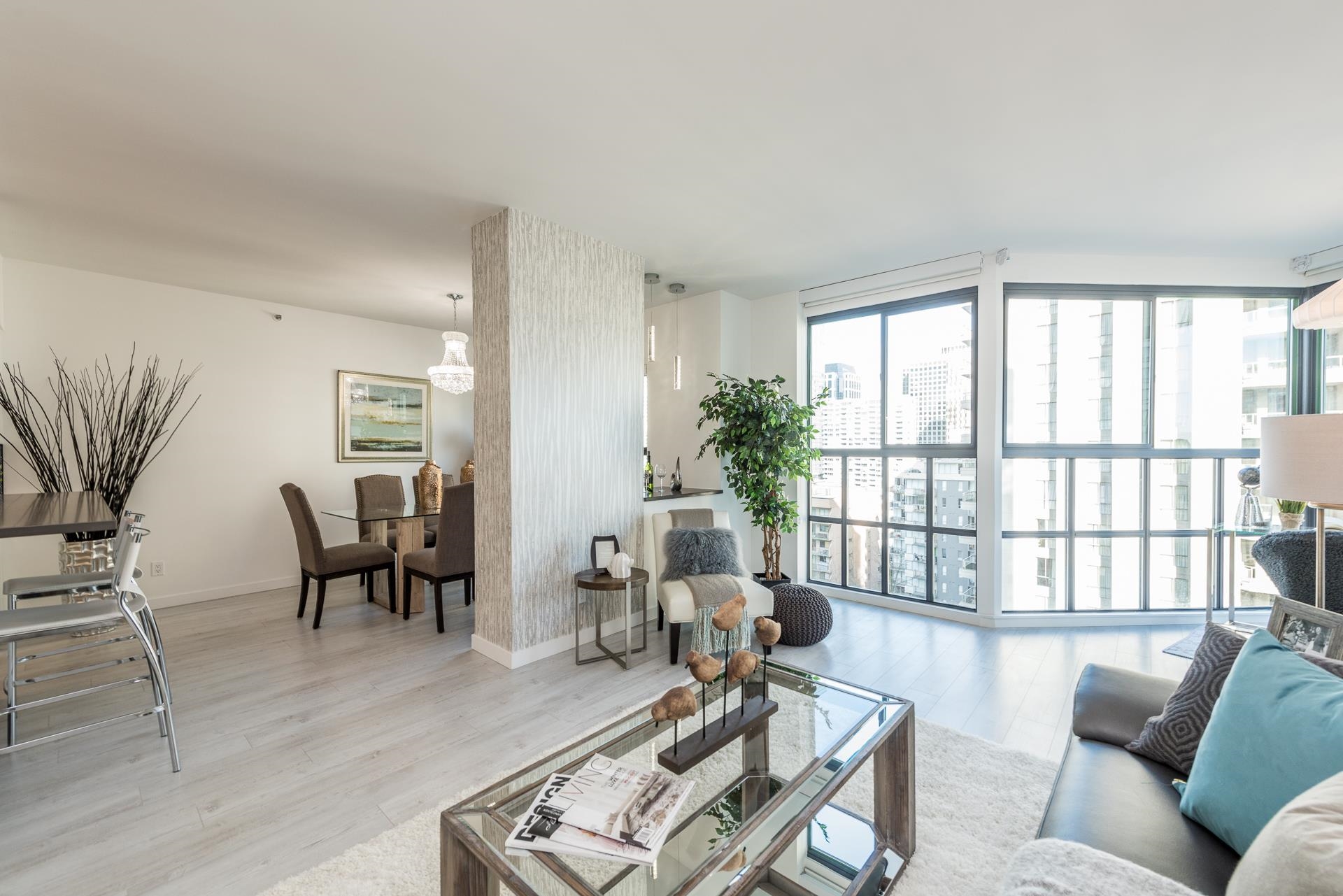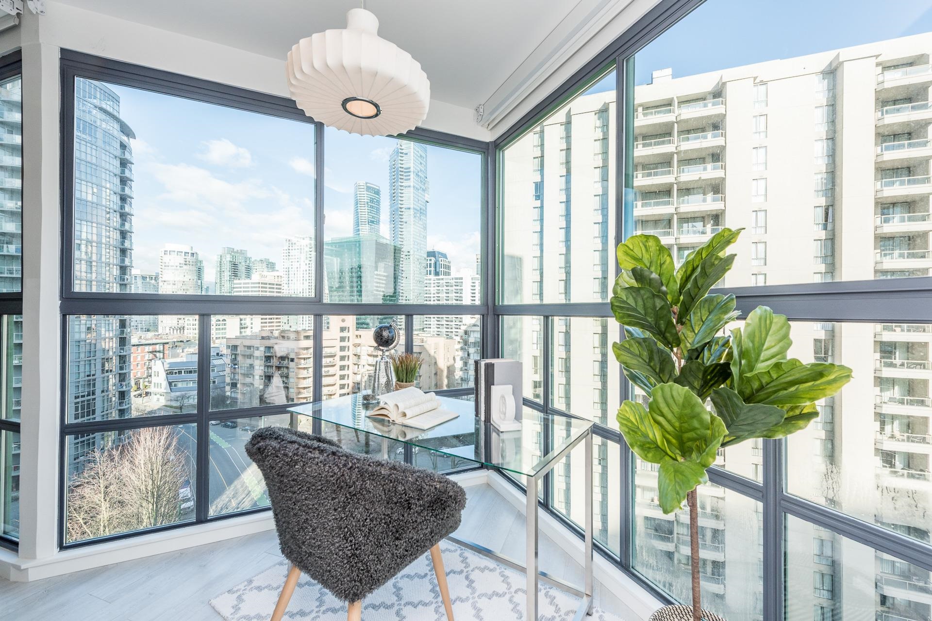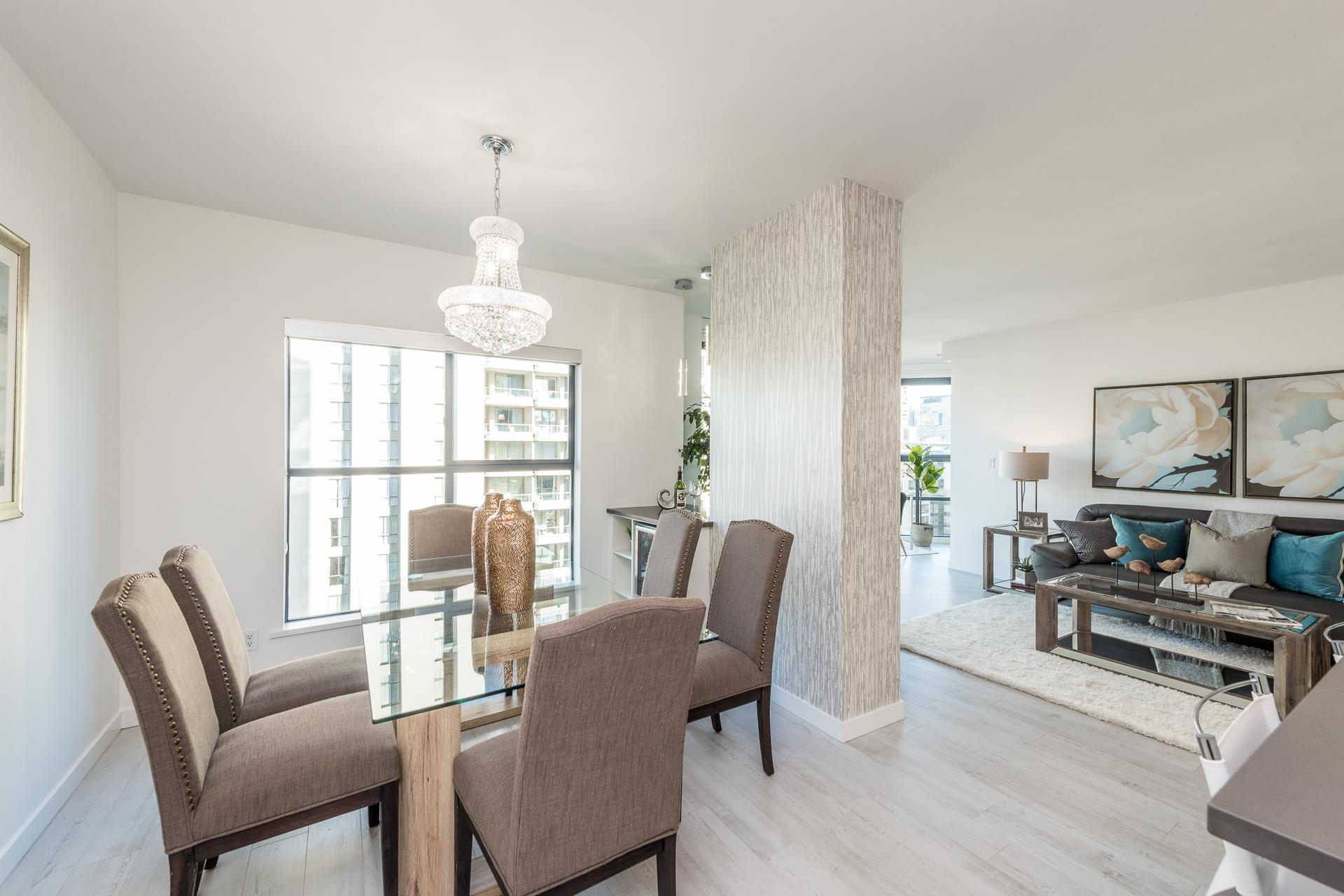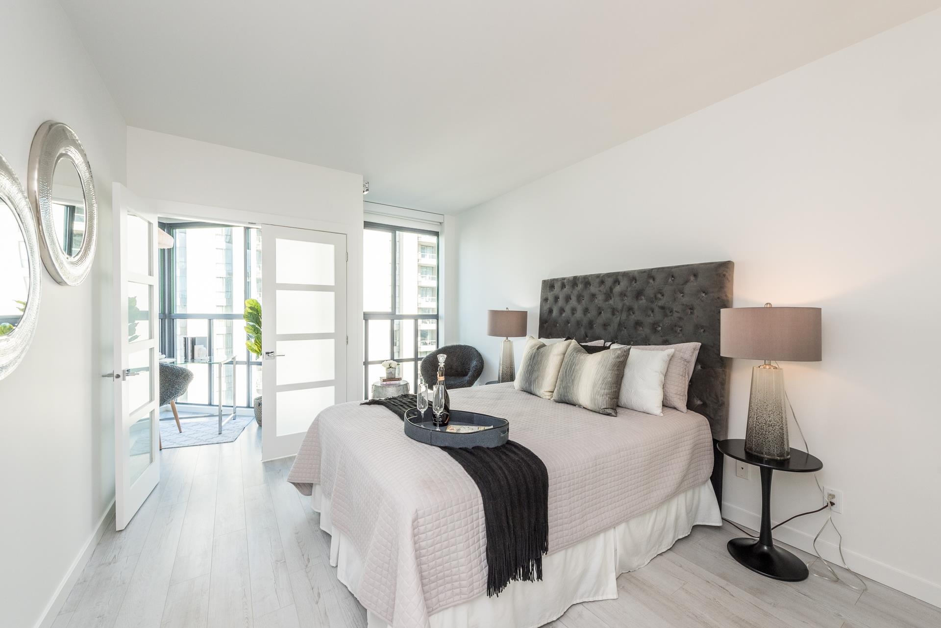 Welcome to this beautifully renovated home at Vancouver Tower in the heart of downtown Vancouver. This bright 1,270 sq.ft. residence features a spacious open-concept layout with two bedrooms, two full bathrooms, and a versatile den—perfect for a home office or extra storage. The unit is tastefully updated with laminate flooring, LED lighting, quartz countertops, and a built-in bar with a bar fridge. Large windows bring in abundant natural light and offer stunning city views, while air conditioning ensures y...
