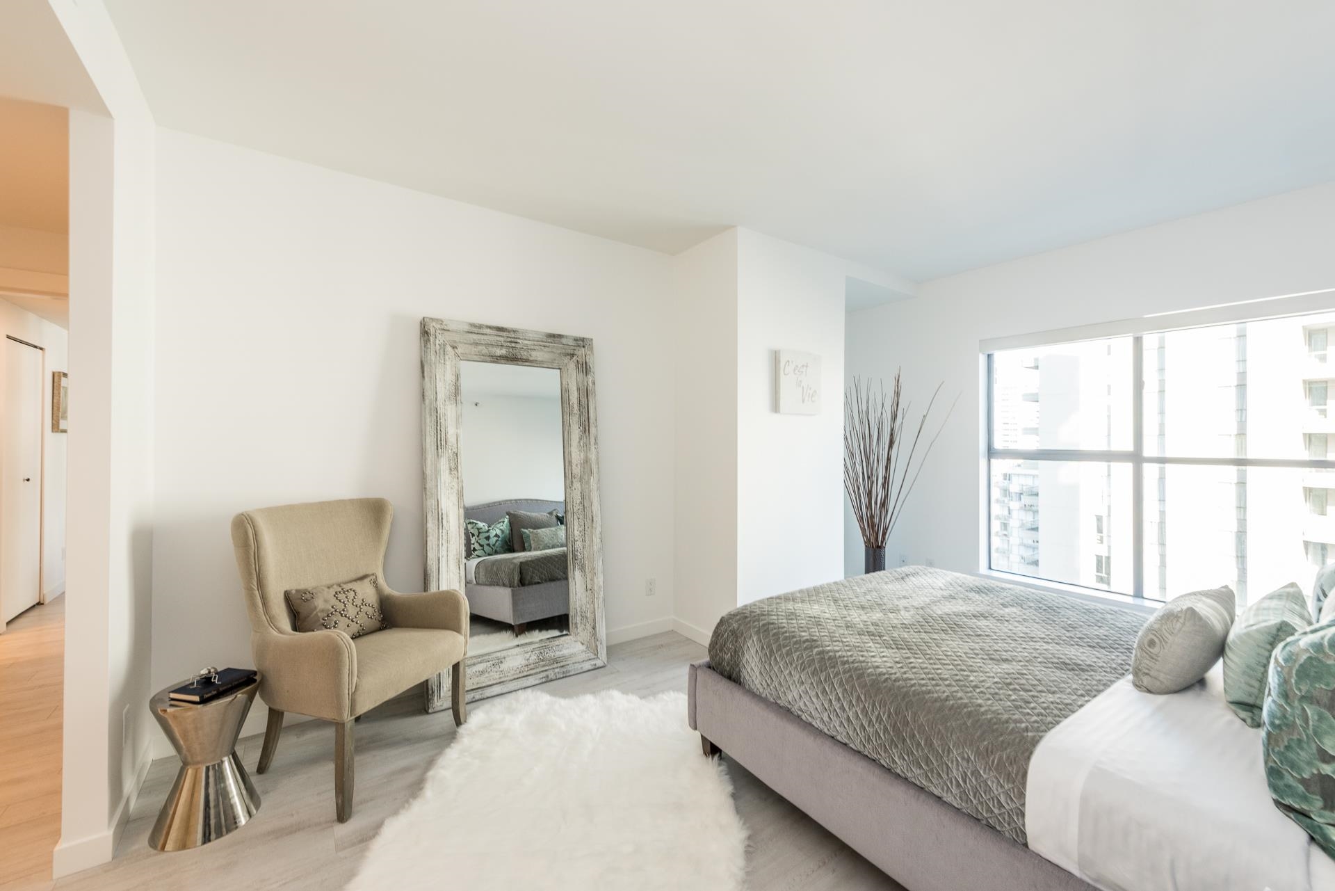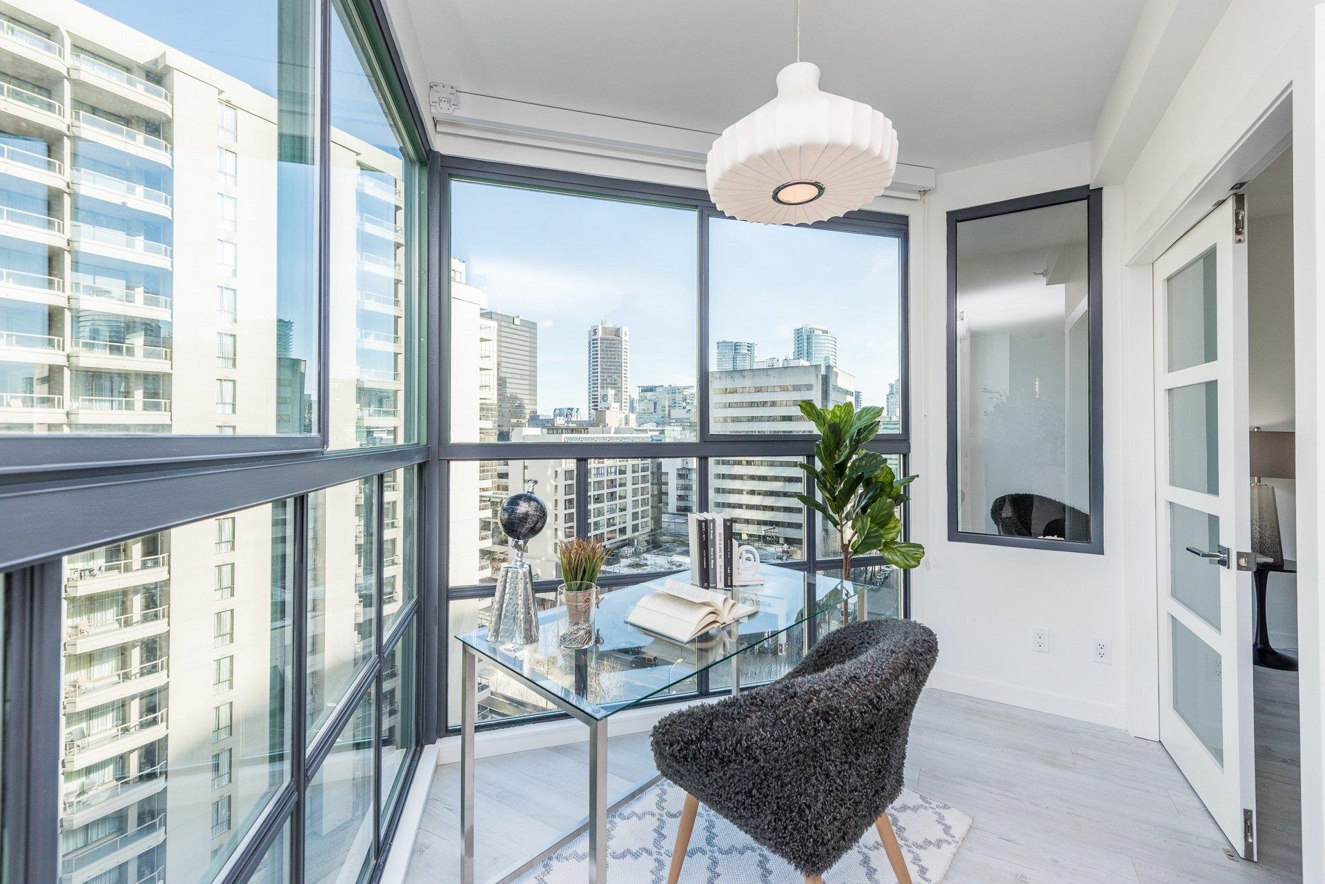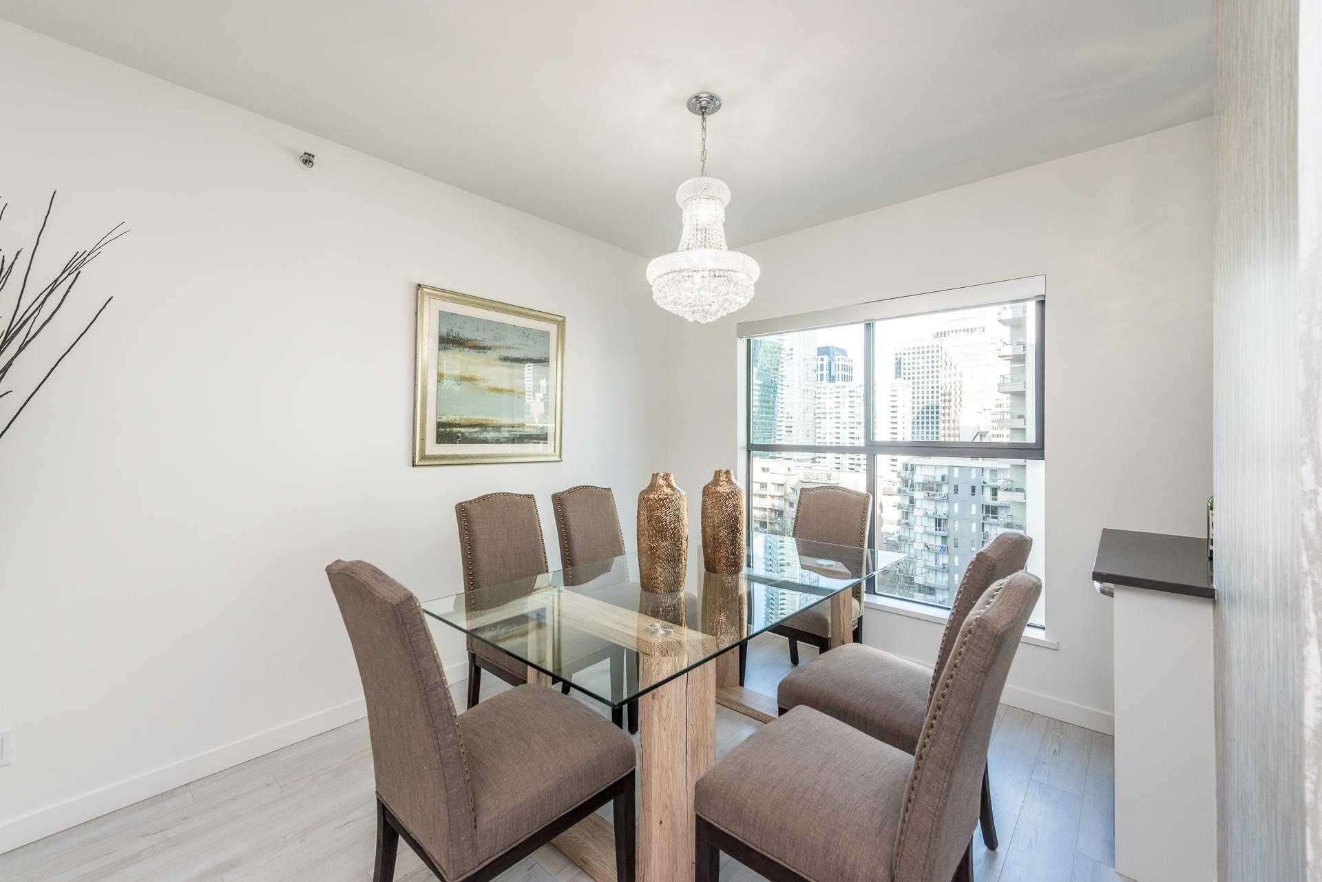 Welcome to this beautifully renovated home at Vancouver Tower in the heart of downtown Vancouver. This bright 1,270 sq.ft. residence features a spacious open-concept layout with two bedrooms, two full bathrooms, and a versatile den—perfect for a home office or extra storage. The unit is tastefully updated with laminate flooring, LED lighting, quartz countertops, and a built-in bar with a bar fridge. Large windows bring in abundant natural light and offer stunning city views, while air conditioning ensures y...