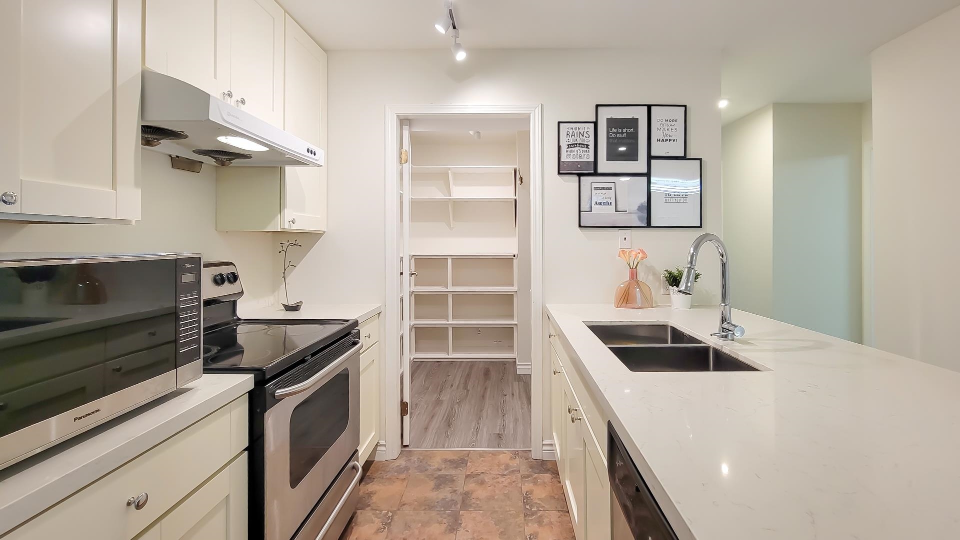 Beautiful and comfy inner ground unit in this private townhouse style condo community, spacious 2 bedrooms with cheater bathroom, laminate floor throughout, in-suite laundry and new hot water tank, Lots of renovations in last 2 years, including new kitchen, bath, floor, lighting, window drapes, organizers and full painting. Central location, close to Walmart, No Frill, Shopping malls and hospital, easy access to highway. Lots of potentials.