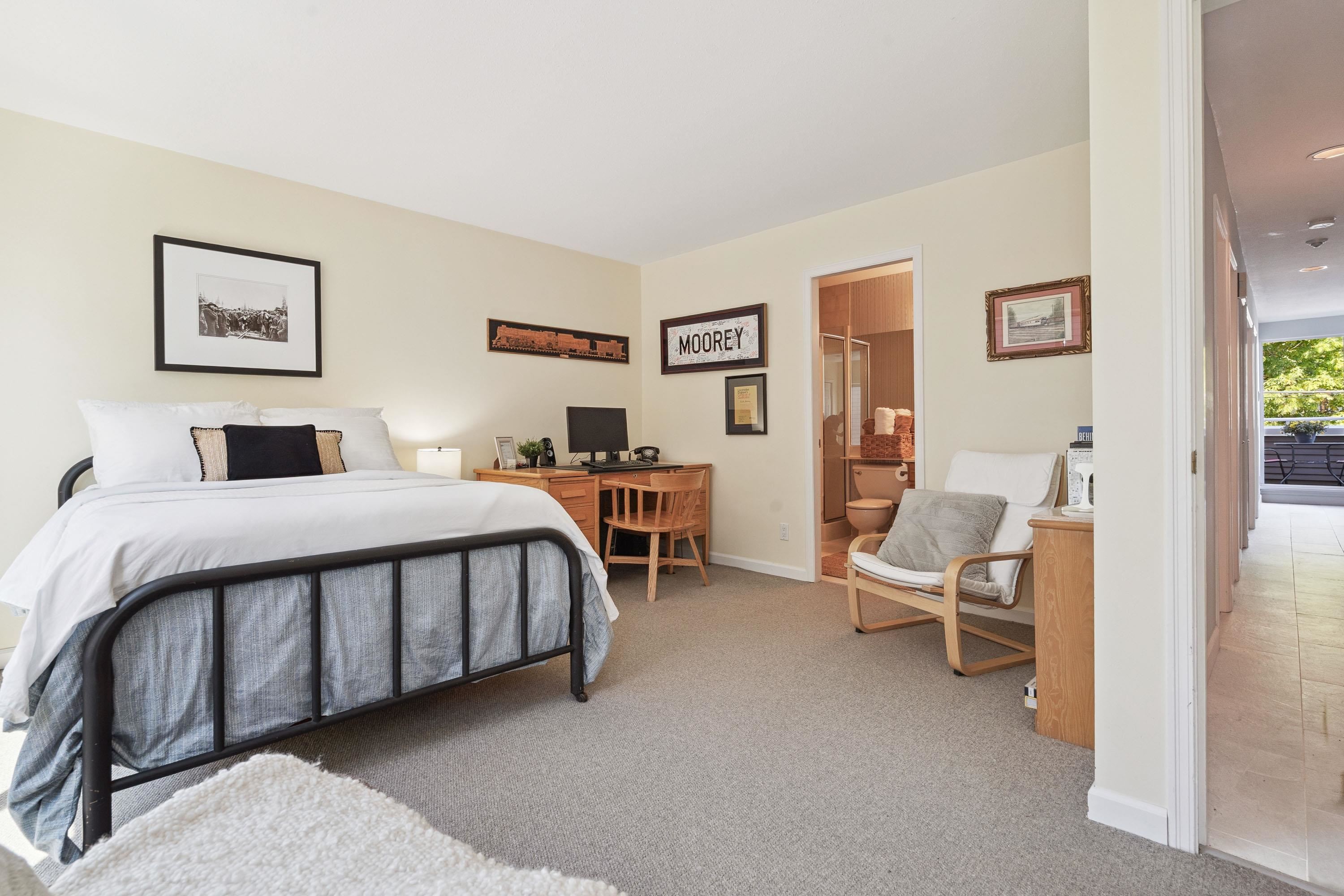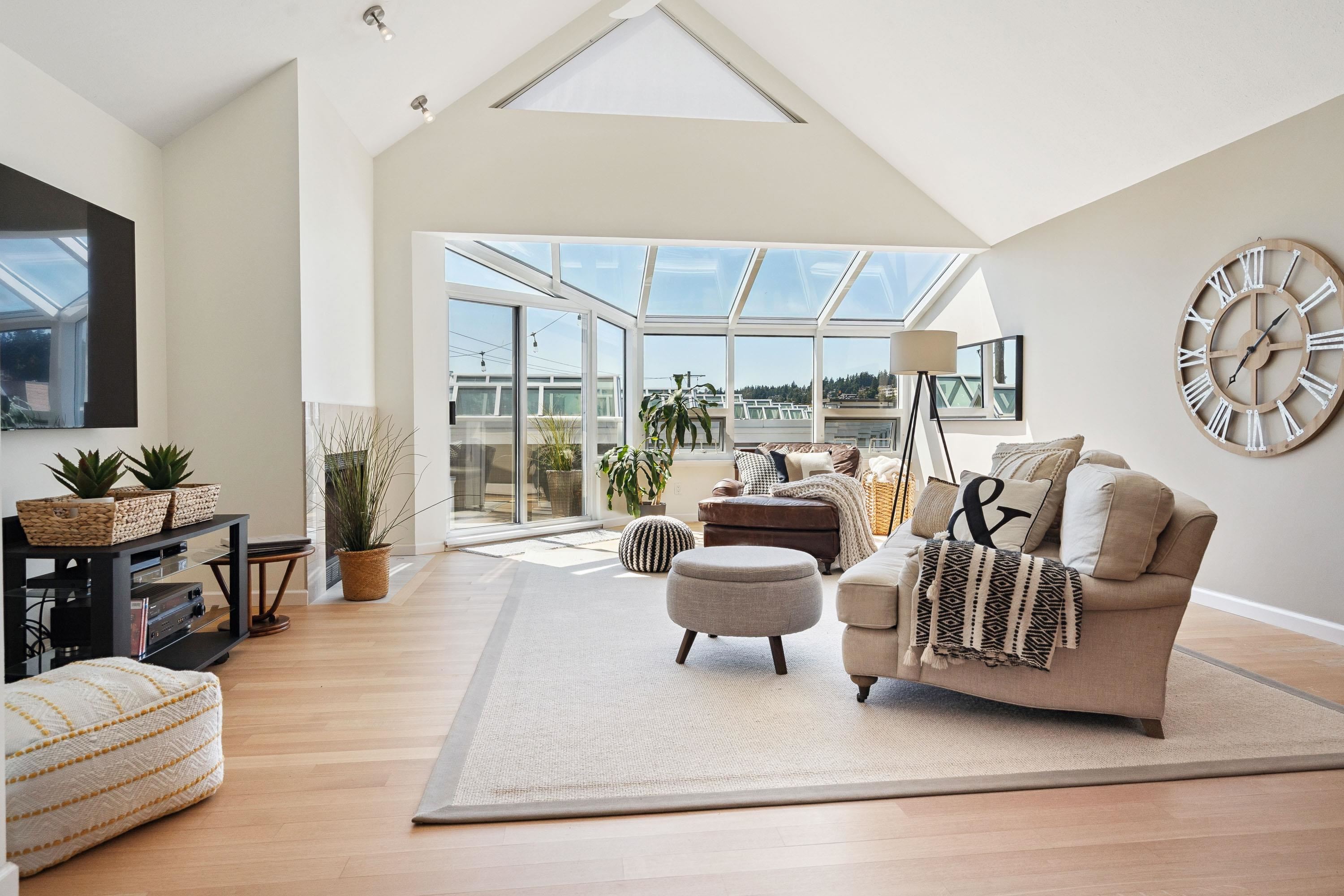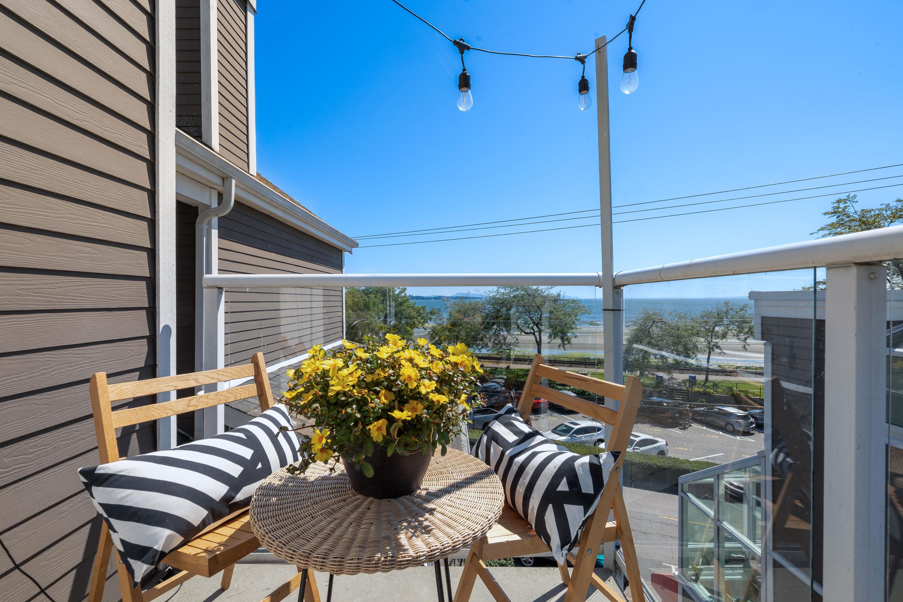 Live by the beach! Ocean views throughout this two storey townhouse across from White Rock beach. Bright & airy w soaring vaulted ceiling, skylights & large windows to capture the views. Almost 1,600 sq ft w generously sized rooms for house sized furniture. 2 sea view balconies to relax & bbq. Reverse floorplan w two large bedrooms & two full ensuite bathrooms on main; living room, dining, kitchen & powder room above. Respected Marine Court, updated w full rainscreen, hardi-plank exterior, vinyl windows, de...