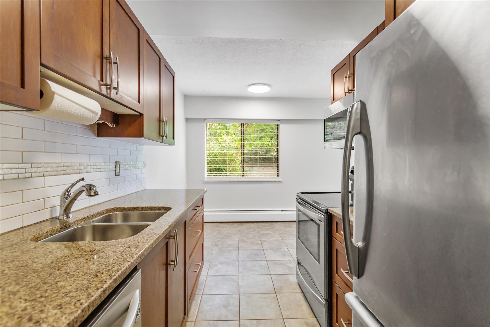 FANTASTIC ground floor updated 2 bed/2 bath spacious home (950 SQFT)! Galley kitchen includes custom cabinets, quartz countertops, tile backsplash, S/S appliances & tile flooring. You will be impressed! Brand new flooring, all new lighting & fresh paint thru out. Large primary bdrm w/enste (soaker tub), 2nd bdrm is a good size too. Both bathrooms have been updated w/countertops, fixtures & backsplash. OUTDOOR SPACE GALORE which includes private 30x25 patio, great for entertaining, BBQ'NG & there's a bonus 9...