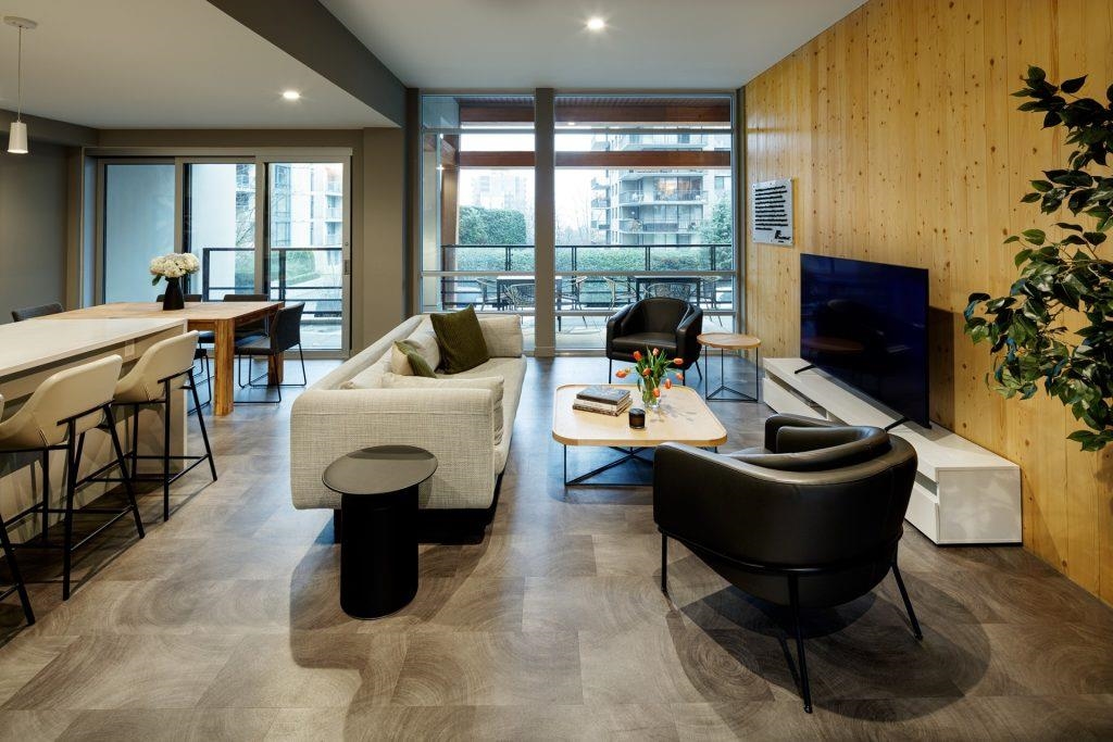 896 sqft TOTAL LIVING. This stunning 1 Bed + Den features a rare 277 sq. ft. wraparound patio with private exterior access and BBQ hookup, perfect for indoor-outdoor entertaining. Bright open interiors offer wide-plank flooring, radiant in-floor heating, and a gourmet kitchen with quartz countertops. Built by Adera with Quiet Home™ technology for enhanced soundproofing and sustainability. Includes 1 parking, 1 storage locker, and in-suite laundry. Enjoy the West Coast Club amenities: party room, gym, dog wa...