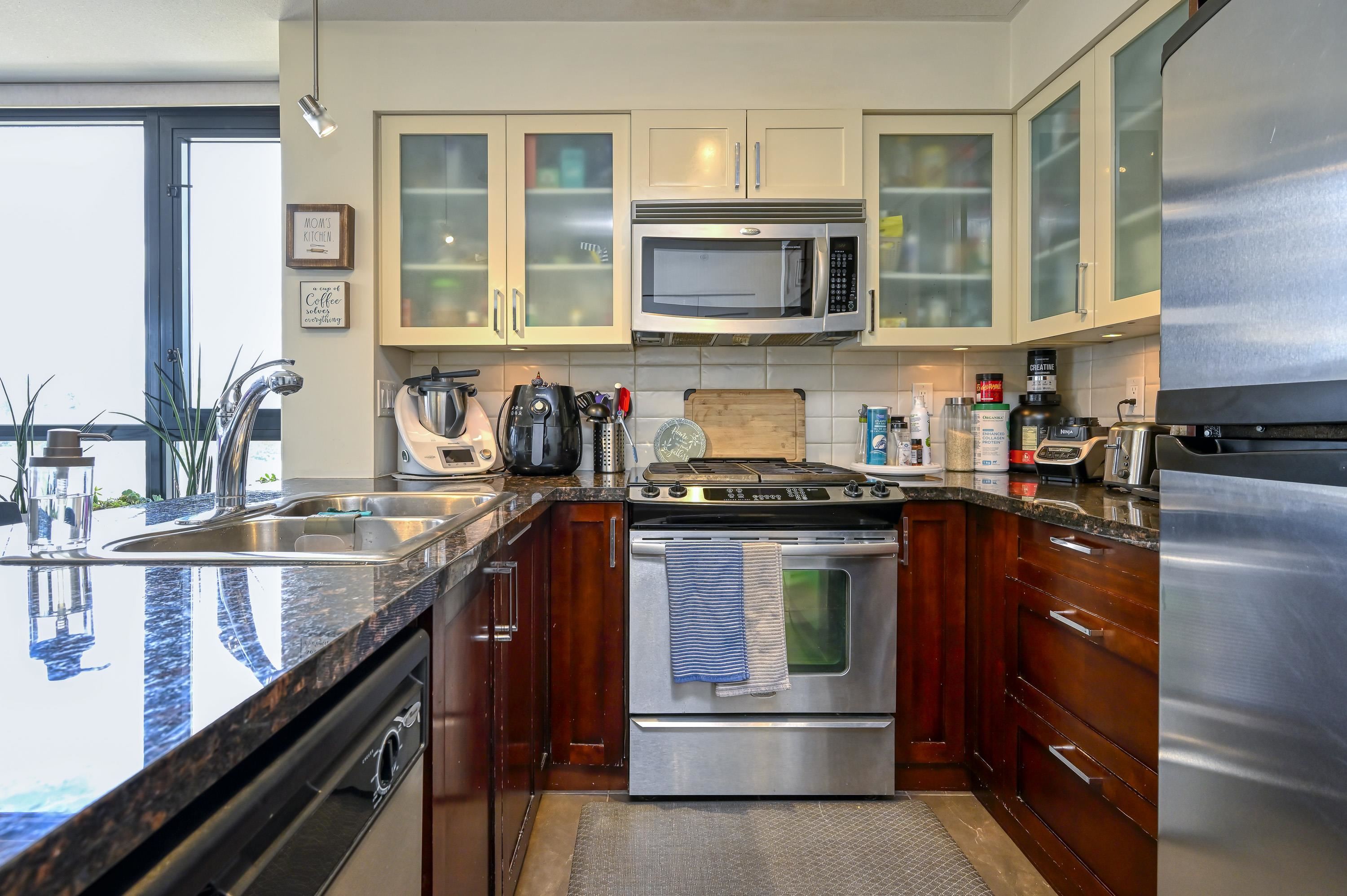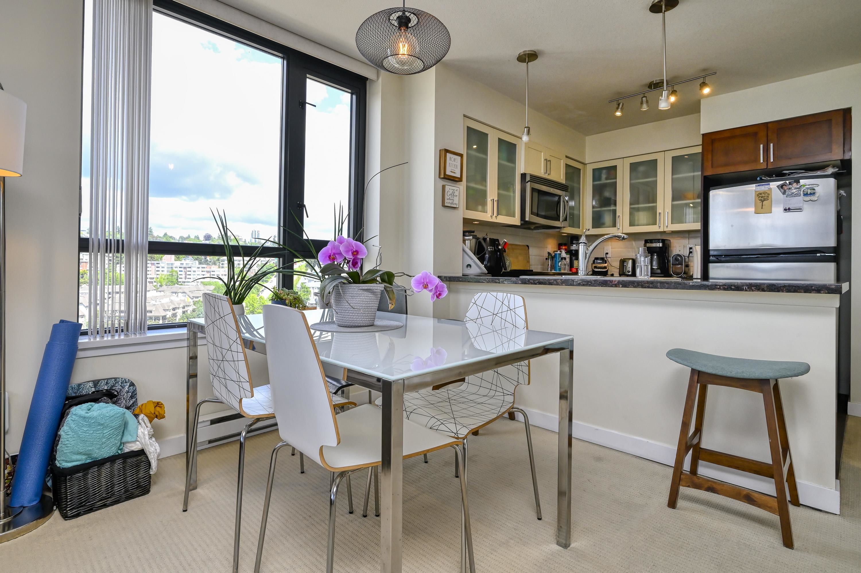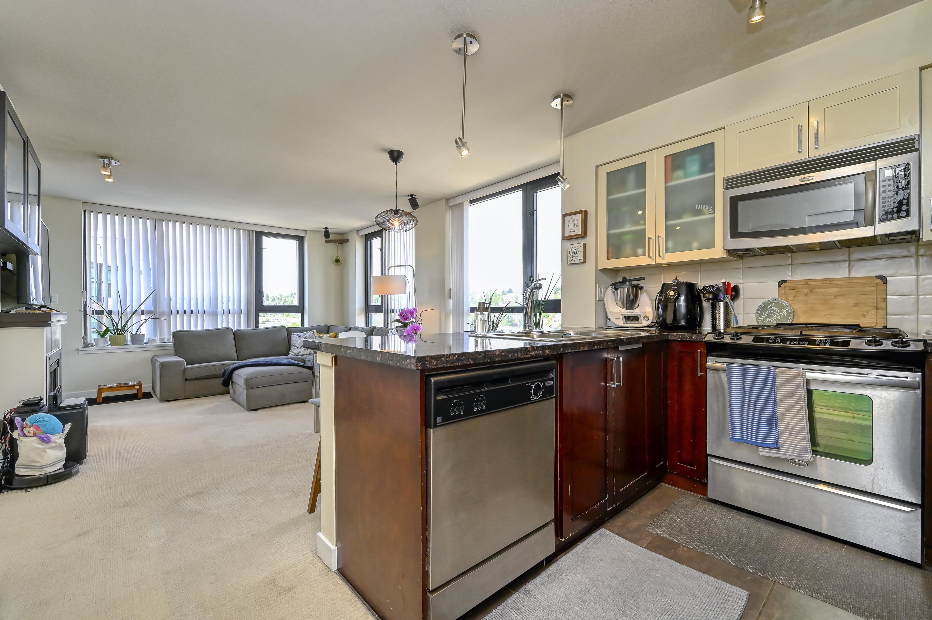 Bright and spacious 2 bed/2 bath corner home with water views at The Q, a concrete building in New West Quay. Functional layout with separated bedrooms, open kitchen/living/dining area, and a large balcony. The king-sized primary features double closets and a 4-piece ensuite. Kitchen offers granite counters and stainless appliances. Well-managed strata with strong contingency. Amenities include a gym, clubhouse, and 4th-level patio. 1 parking included. Pets and rentals allowed. Steps to SkyTrain, River Mark...