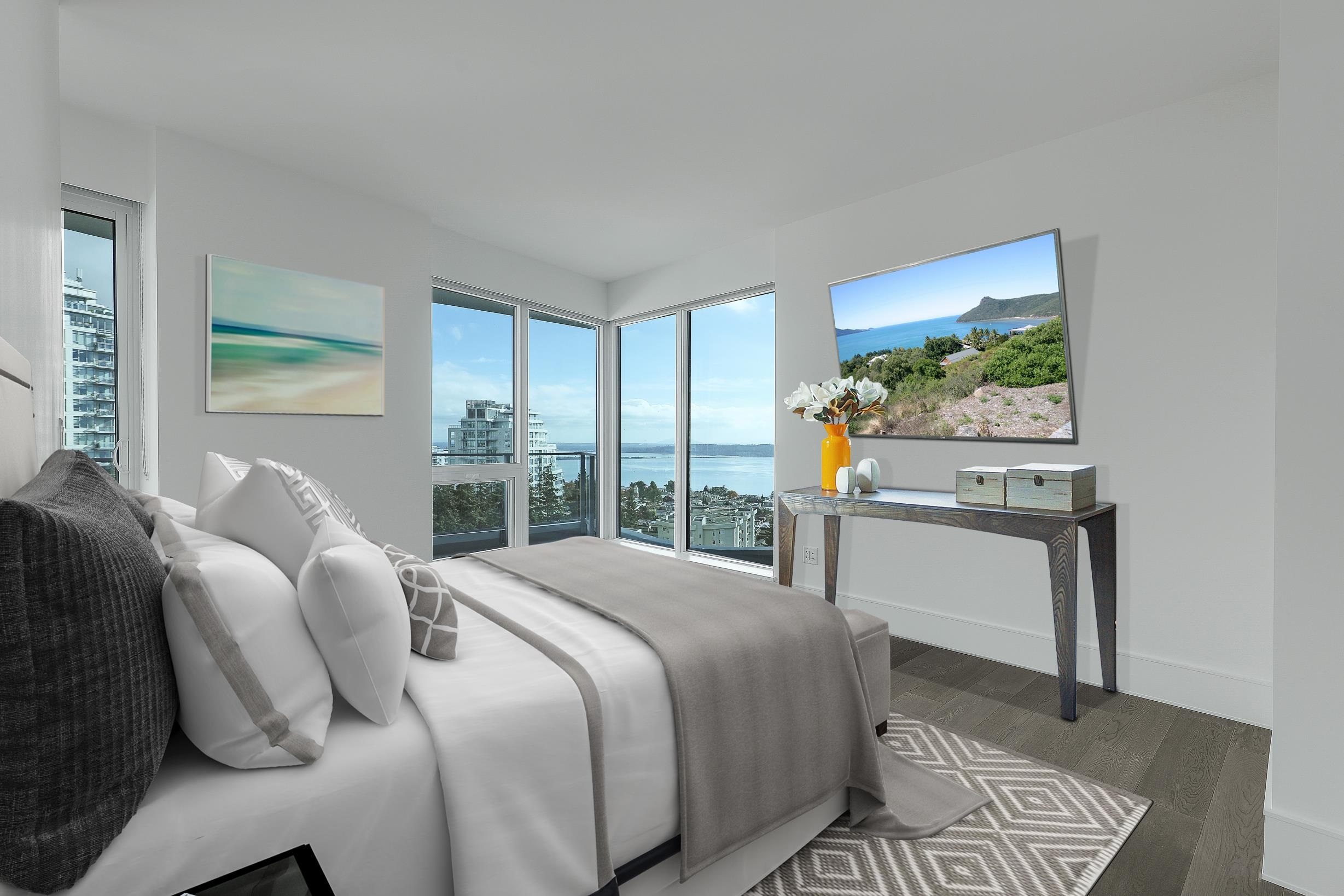 A rare offering at Foster & Martin – two premier units combined into one stunning 2,258 sq. ft. 3 bed, 3 bath + den residence. Enjoy panoramic 180° ocean, Mt. Baker & North Shore Mountain views from every room and a 419 sq. ft. wrap-around balcony. Features floor-to-ceiling windows, hardwood floors, A/C, gas fireplace, and a chef’s kitchen with Miele appliances and large island. Includes 4 parking spaces, 2 lockers, and access to a 10,000 sq. ft. Health & Wellness Centre with pools, gym & concierge.