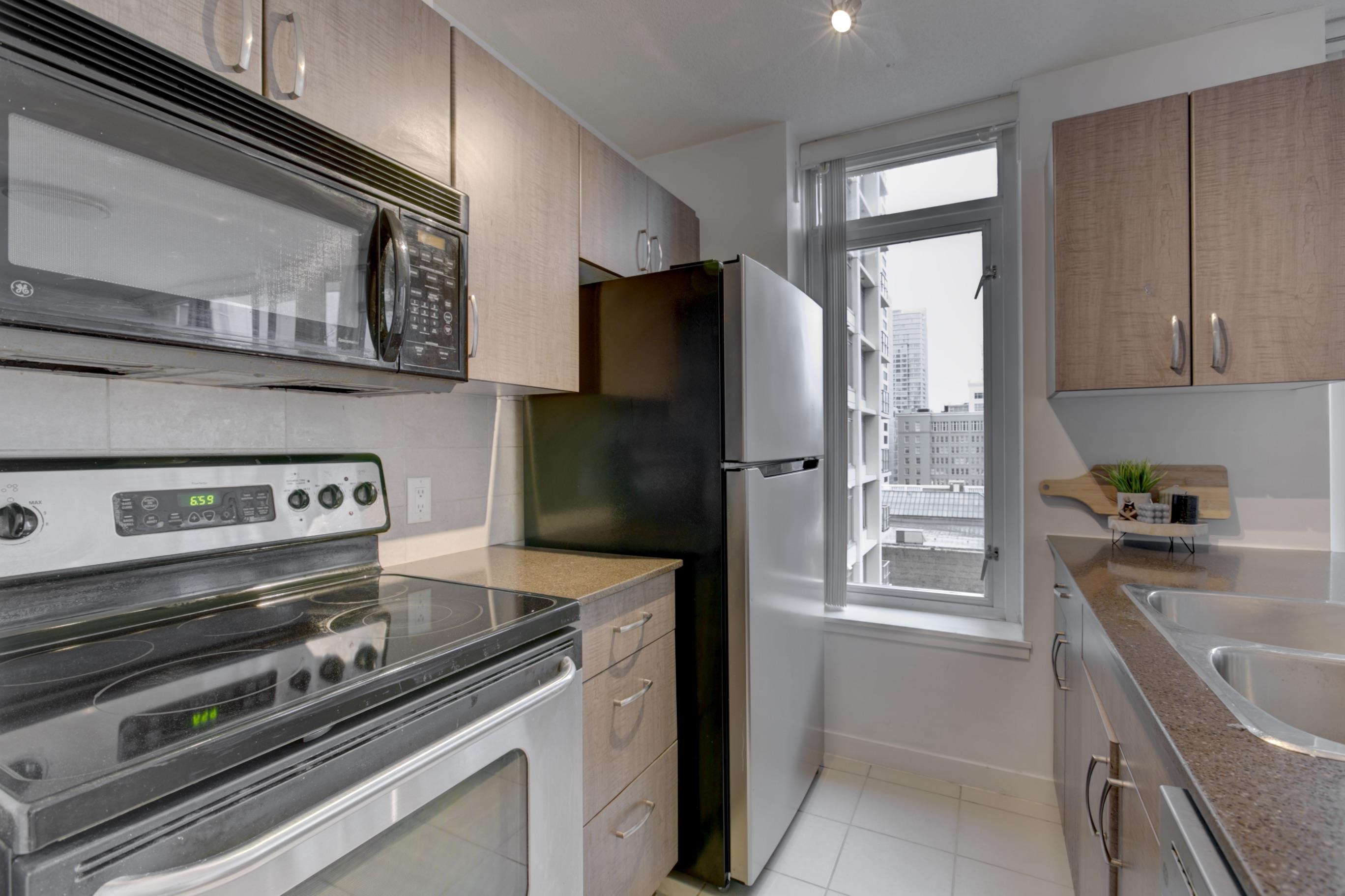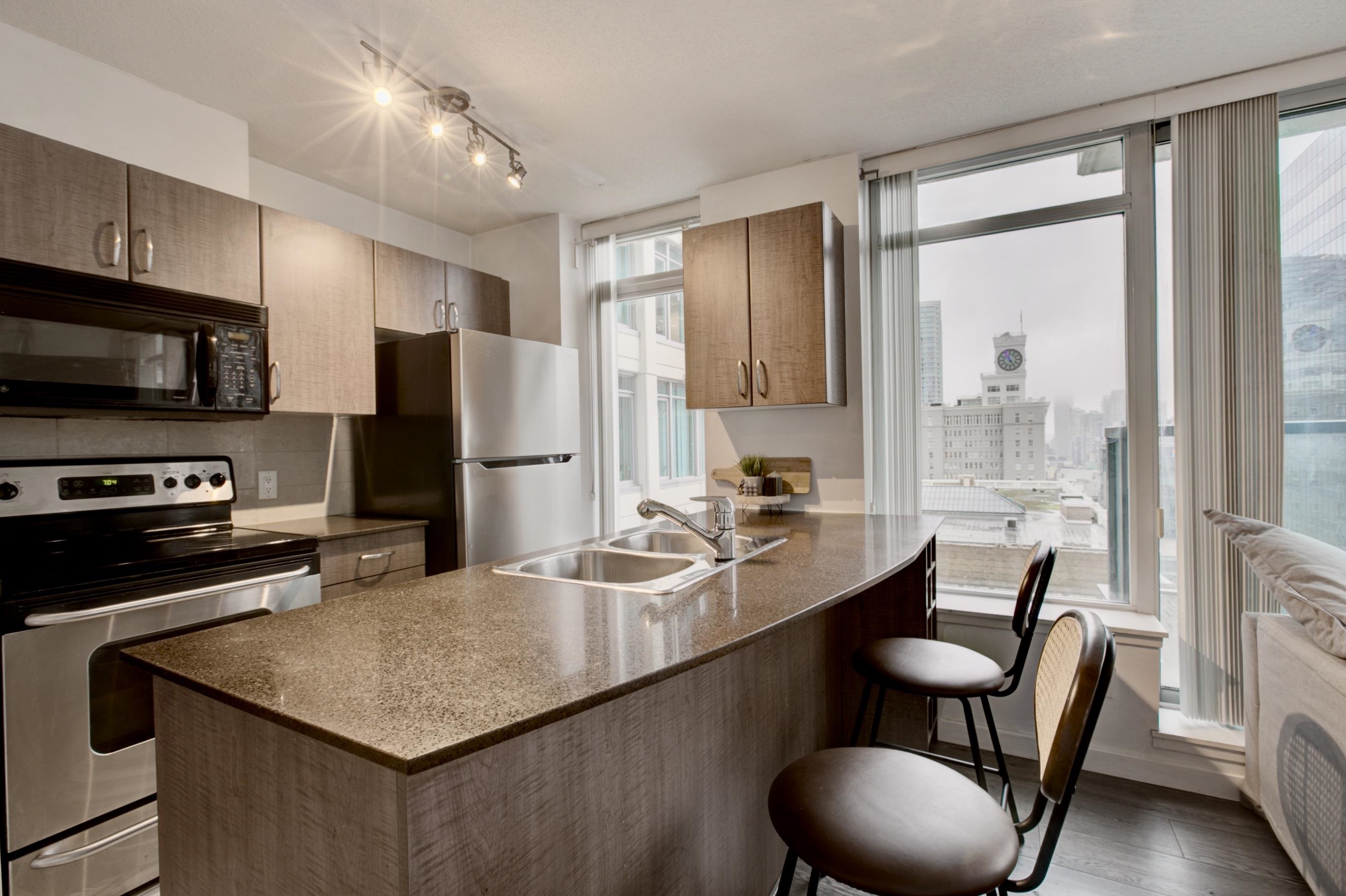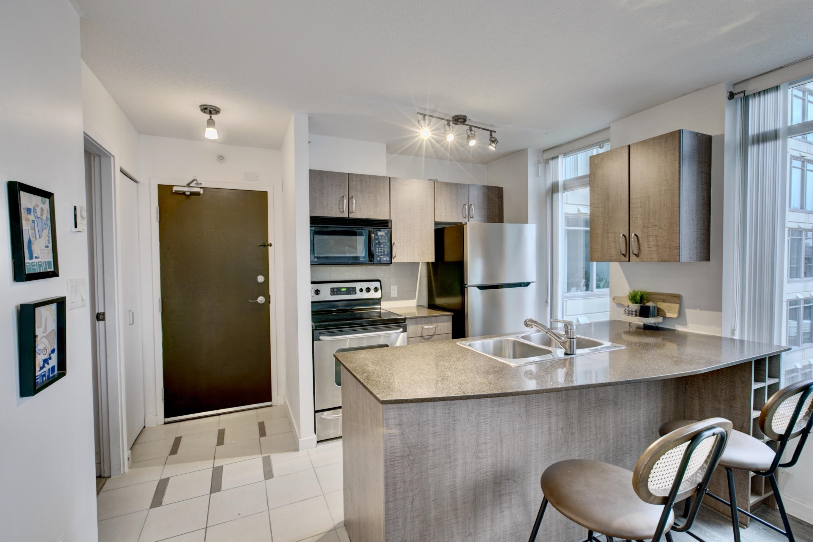 This beautiful one-bedroom apartment features an open-concept living area filled with abundant natural light and is maintained in immaculate condition. Floor-to-ceiling windows provide a bright, private exposure and enhance the spacious feel of the home. The kitchen is equipped with stainless steel appliances, granite countertops, and ample storage space. As part of The Hudson building, residents enjoy direct private access to the Granville SkyTrain Station, along with premium amenities including a concier...