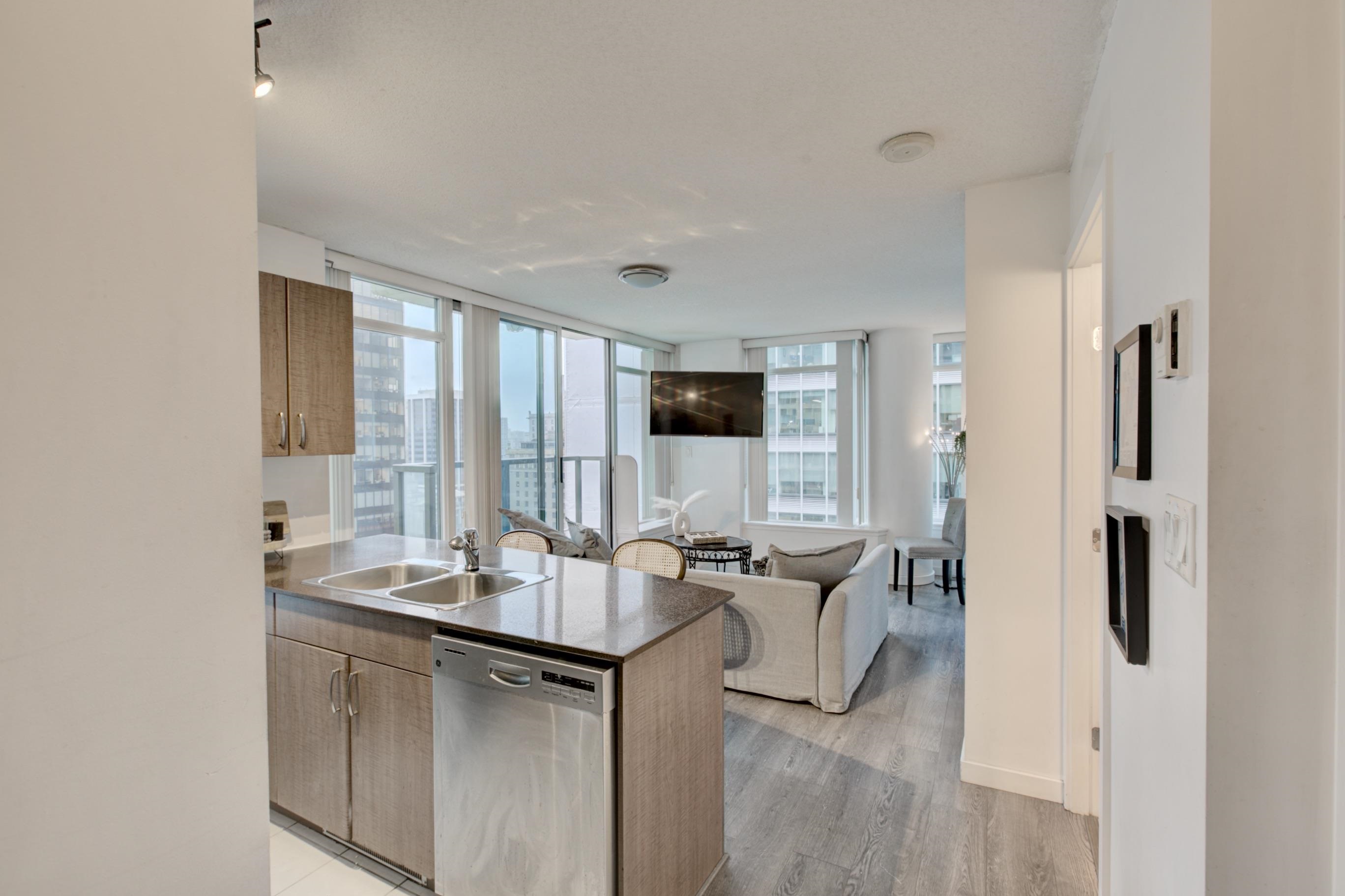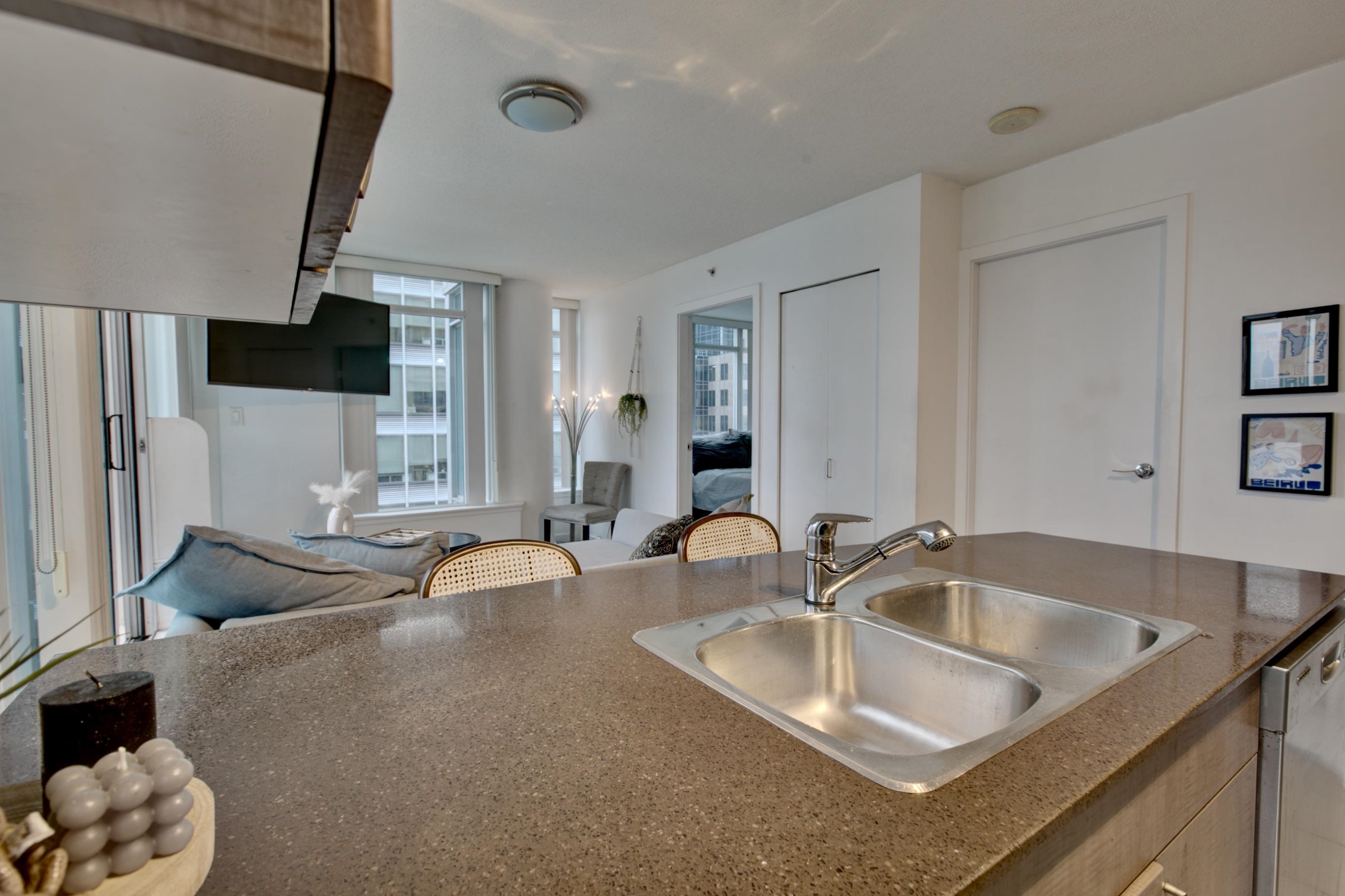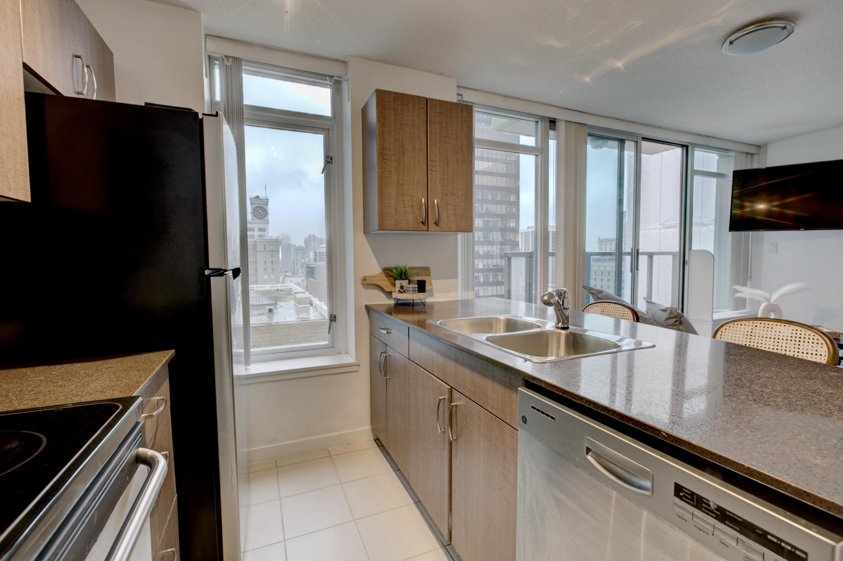 This beautiful one-bedroom apartment features an open-concept living area filled with abundant natural light and is maintained in immaculate condition. Floor-to-ceiling windows provide a bright, private exposure and enhance the spacious feel of the home. The kitchen is equipped with stainless steel appliances, granite countertops, and ample storage space. As part of The Hudson building, residents enjoy direct private access to the Granville SkyTrain Station, along with premium amenities including a concier...