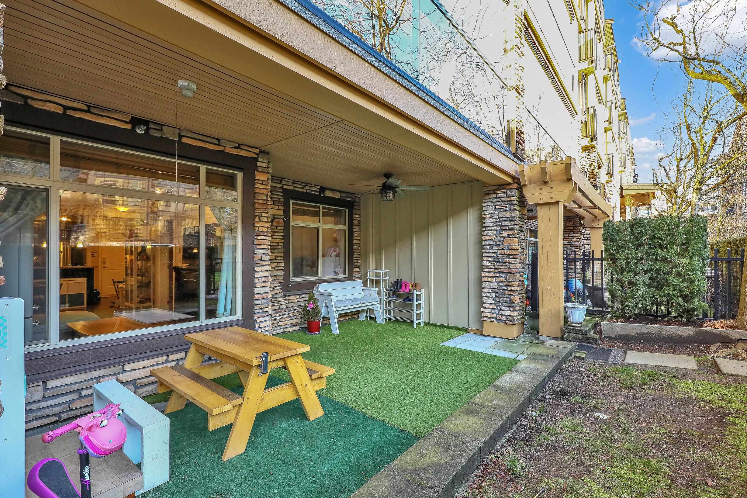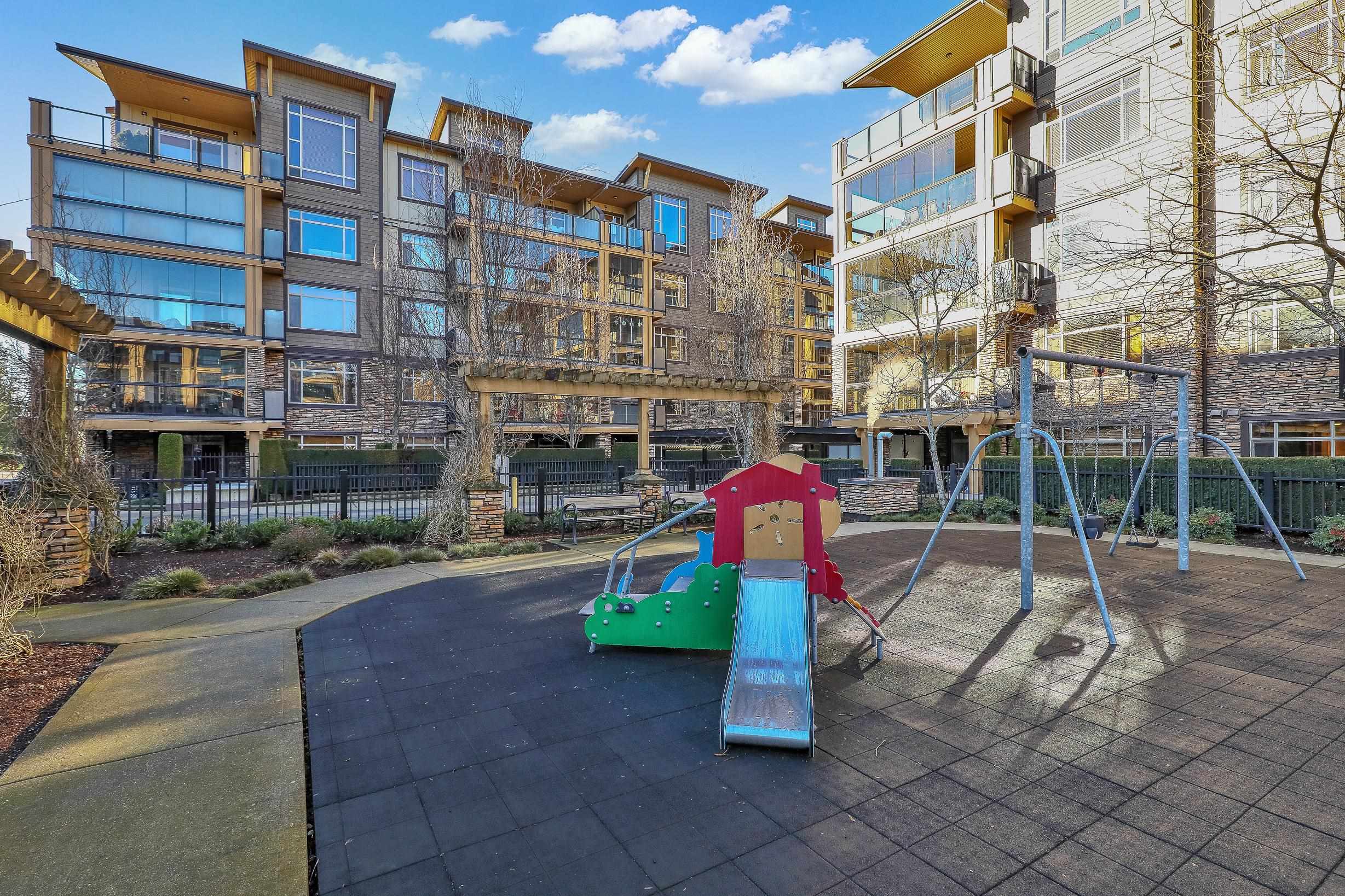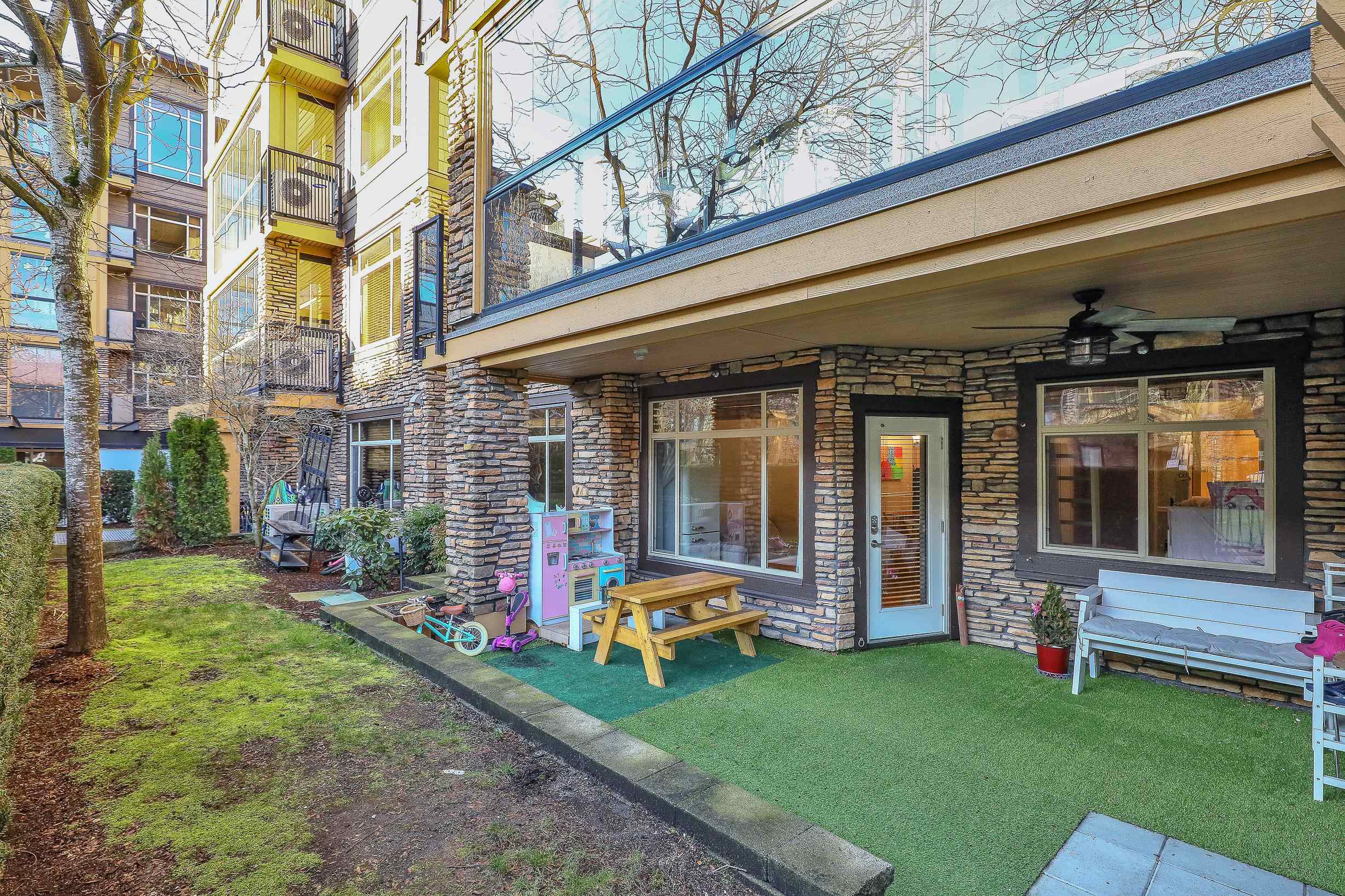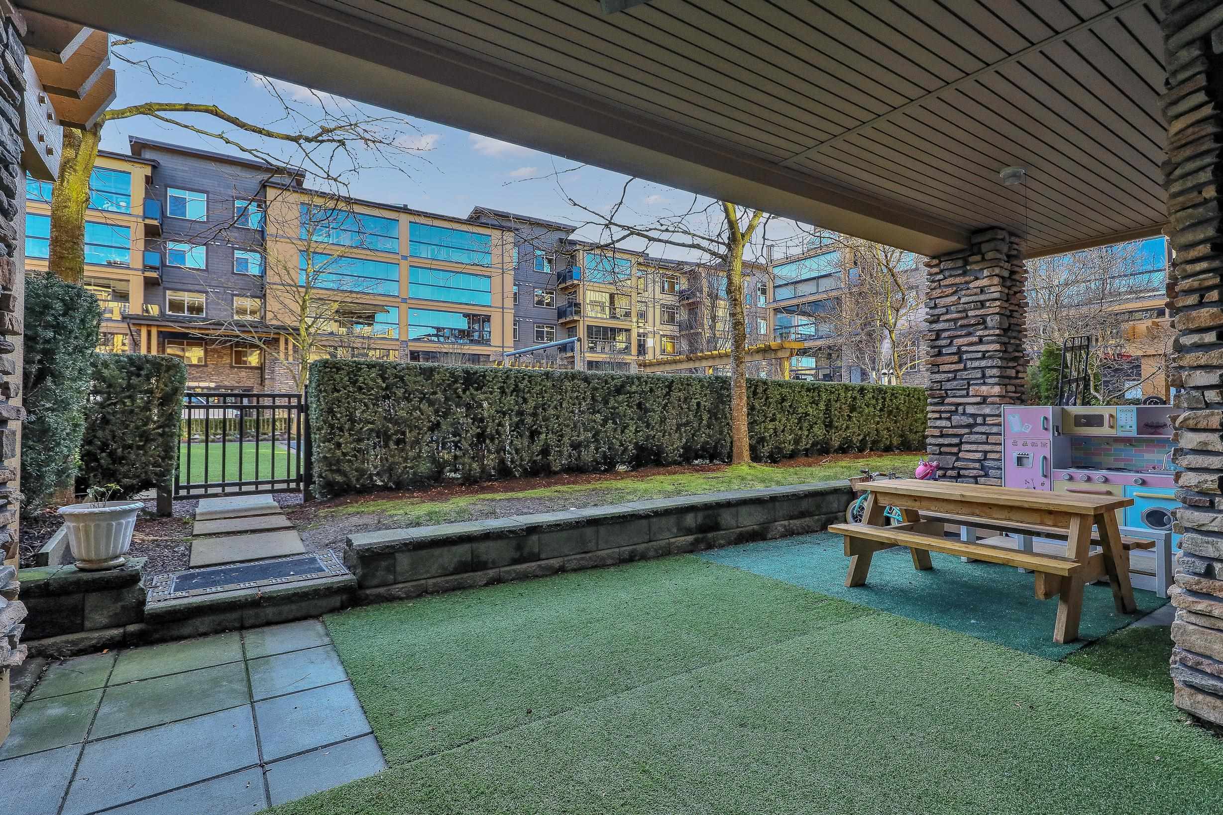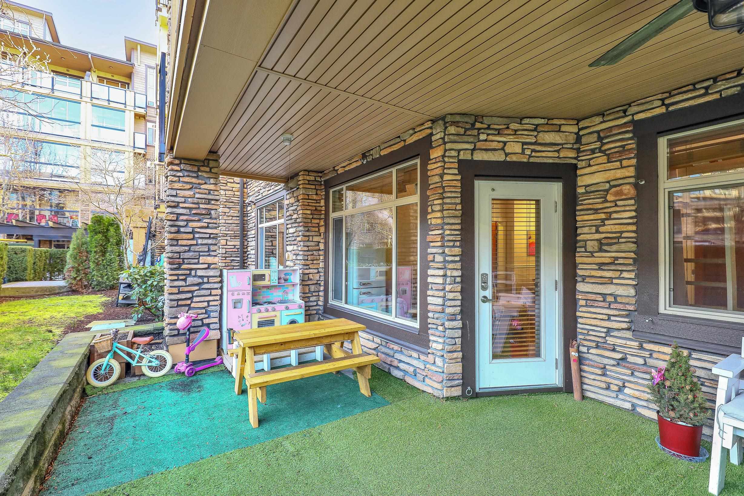 An ideal family home for young children, featuring direct access to a safe, fenced playground and a large patio! Spacious and bright south-facing ground-level 2 bedroom + DEN home (den can be used as a 3rd bedroom). Located in the fast-growing Willoughby Heights neighborhood, close to schools, shopping, restaurants, parks, Carvolth Rapid Bus, and easy highway access. Excellent layout with bedrooms on opposite sides for added privacy. Features include built-in A/C, laminate flooring throughout, granite count...