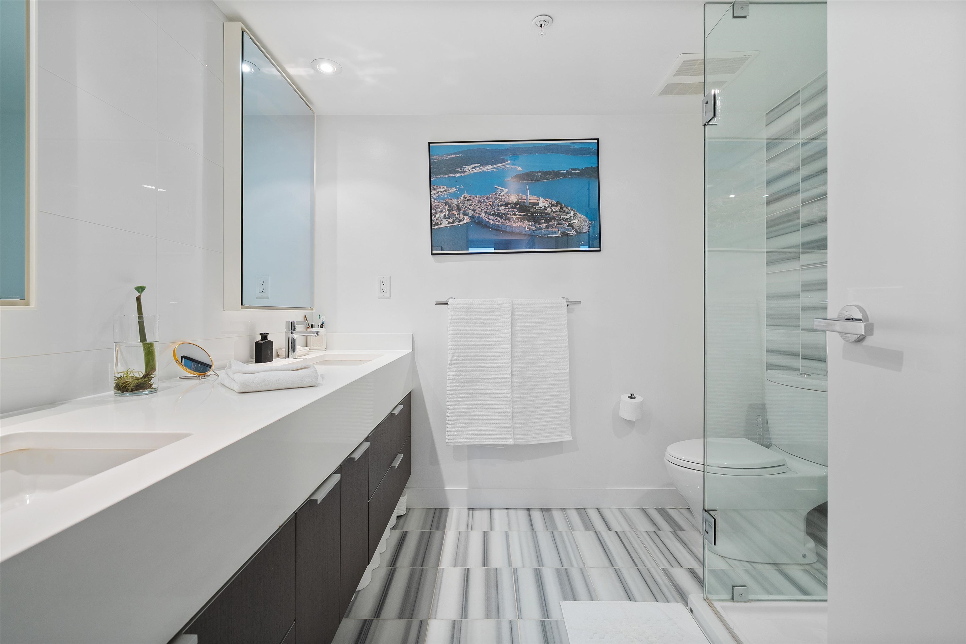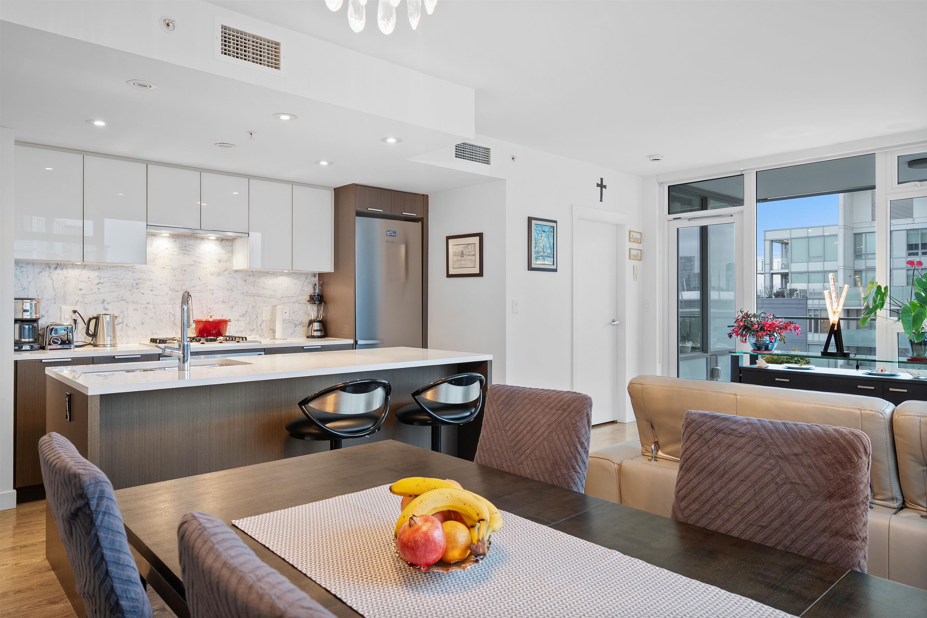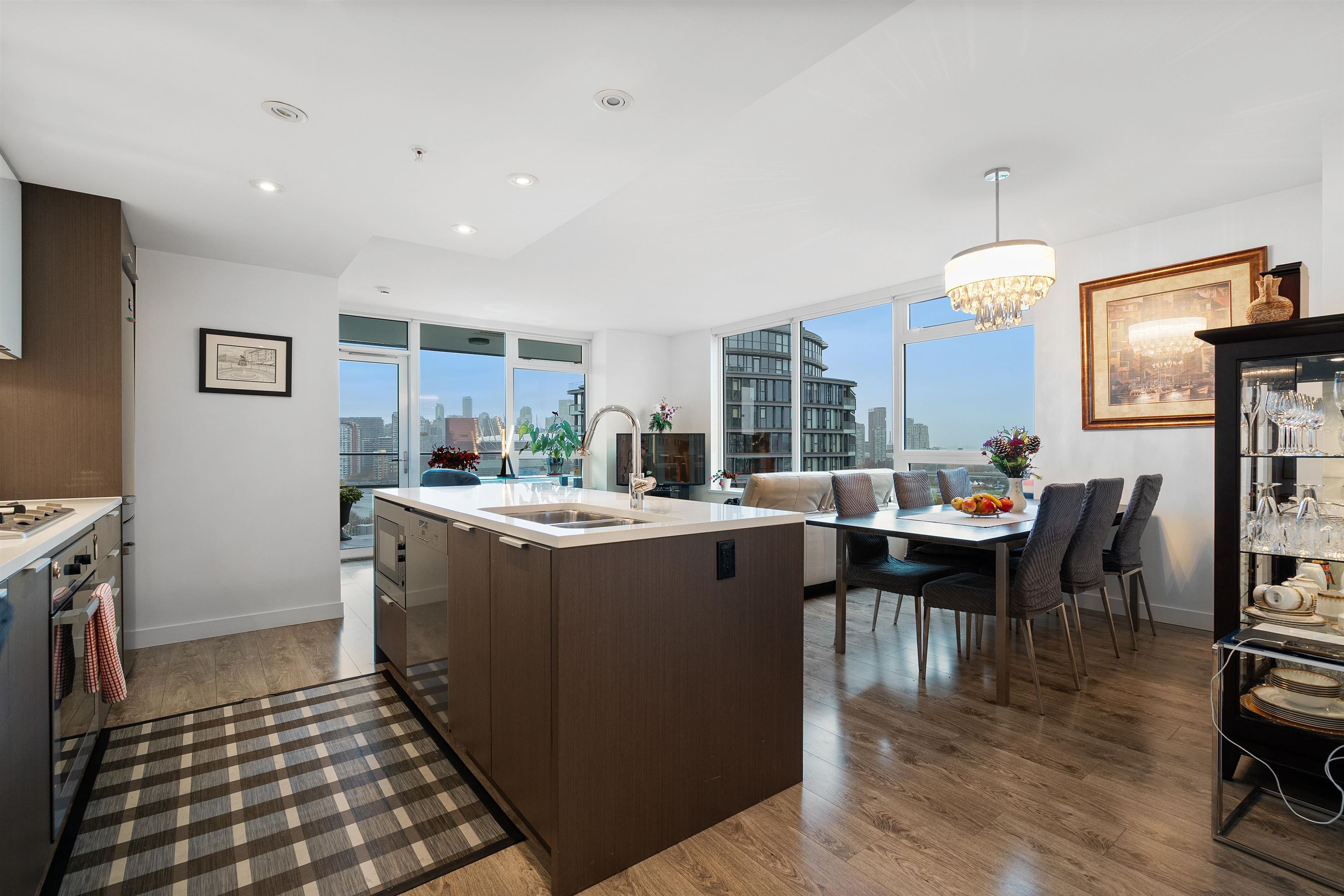 OPEN HOUSE SAT 2-4. LIDO by Bosa — A Spectacular view home In the heart of Olympic Village neighborhood. This high floor corner 2 bed 2 bath luxury condo features stunning views of the city, mountains and False Creek from every room. This Air Conditioned home comes complete with a chef's kitchen featuring top of the line Miele appliances, gas stove, stone counters, & a large island perfect for entertaining. A fantastic floor plan with an abundance of natural light, large living and dining spaces, a flex spa...