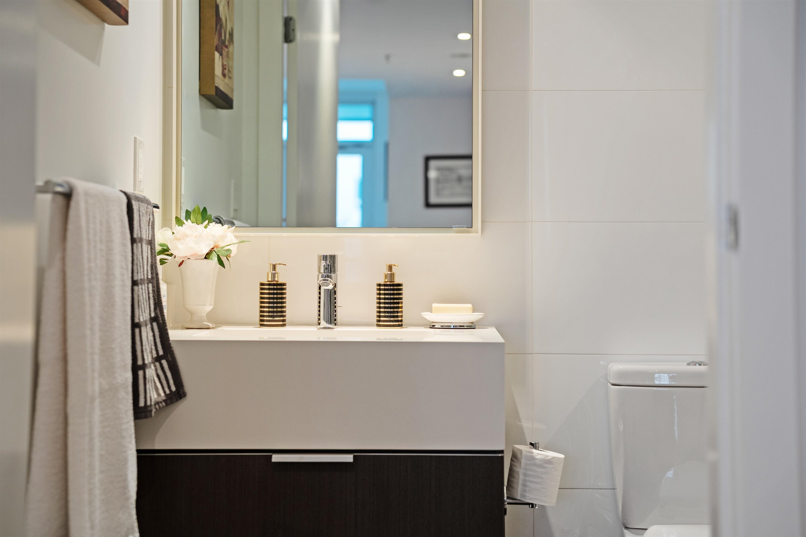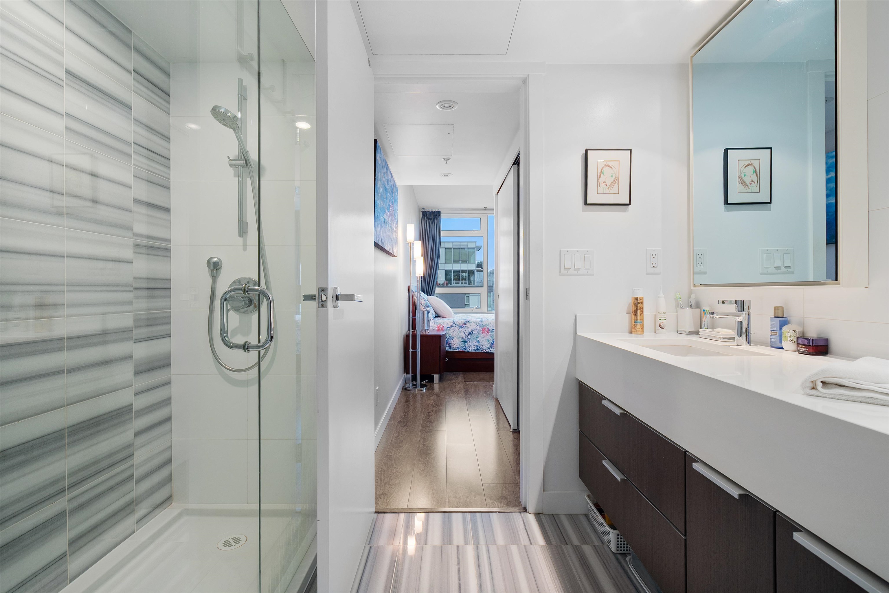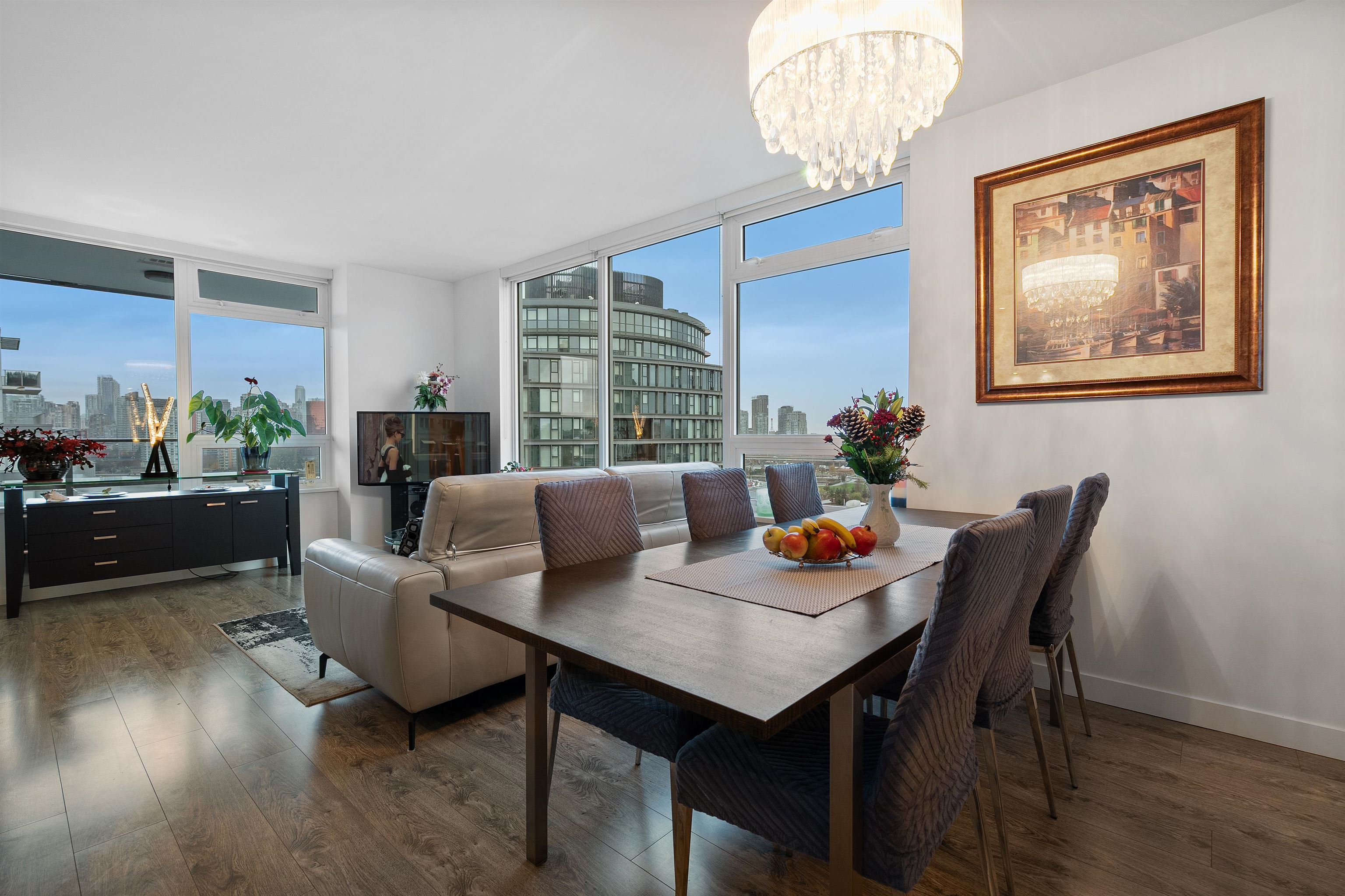 OPEN HOUSE SAT 2-4. LIDO by Bosa — A Spectacular view home In the heart of Olympic Village neighborhood. This high floor corner 2 bed 2 bath luxury condo features stunning views of the city, mountains and False Creek from every room. This Air Conditioned home comes complete with a chef's kitchen featuring top of the line Miele appliances, gas stove, stone counters, & a large island perfect for entertaining. A fantastic floor plan with an abundance of natural light, large living and dining spaces, a flex spa...