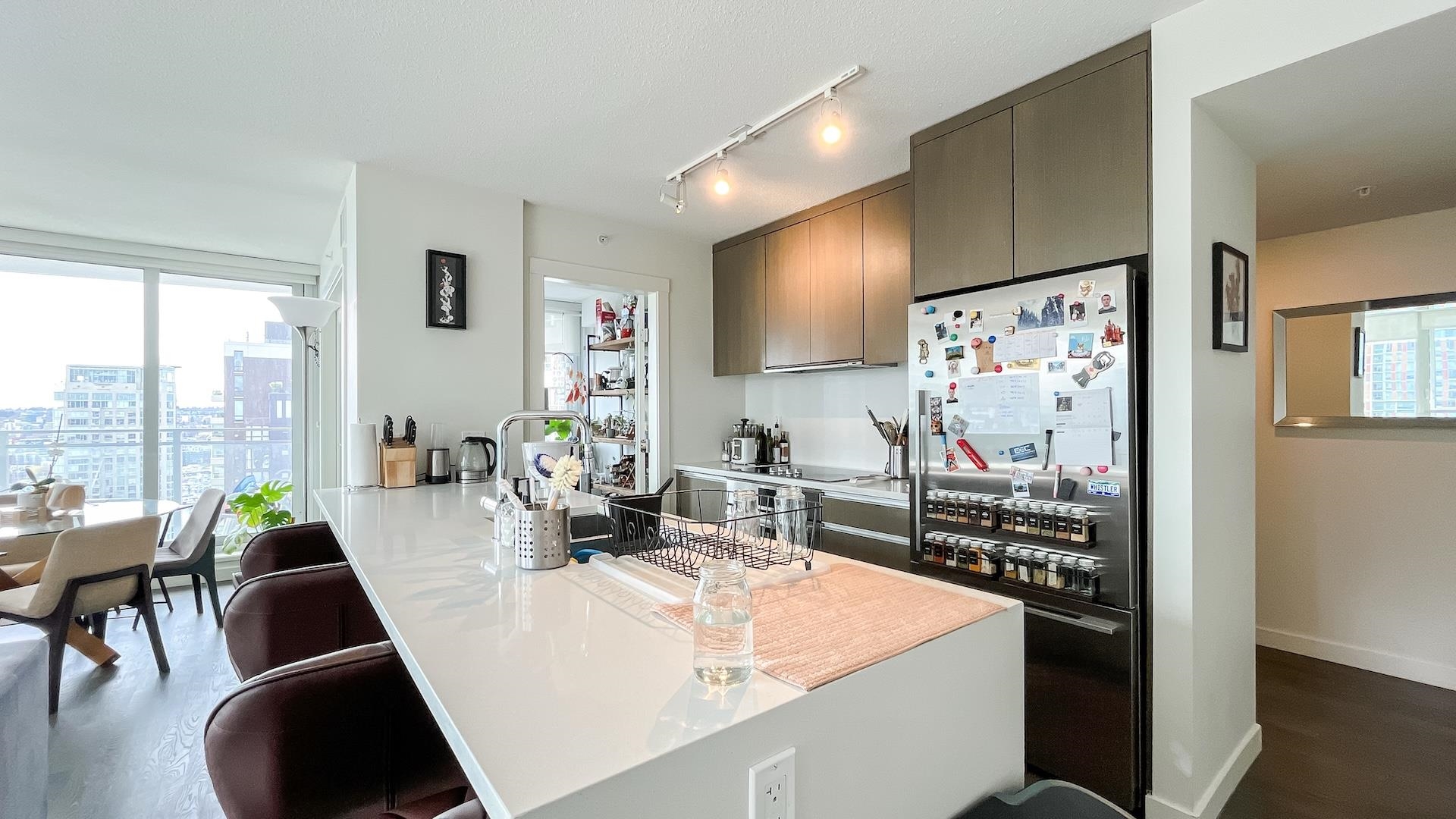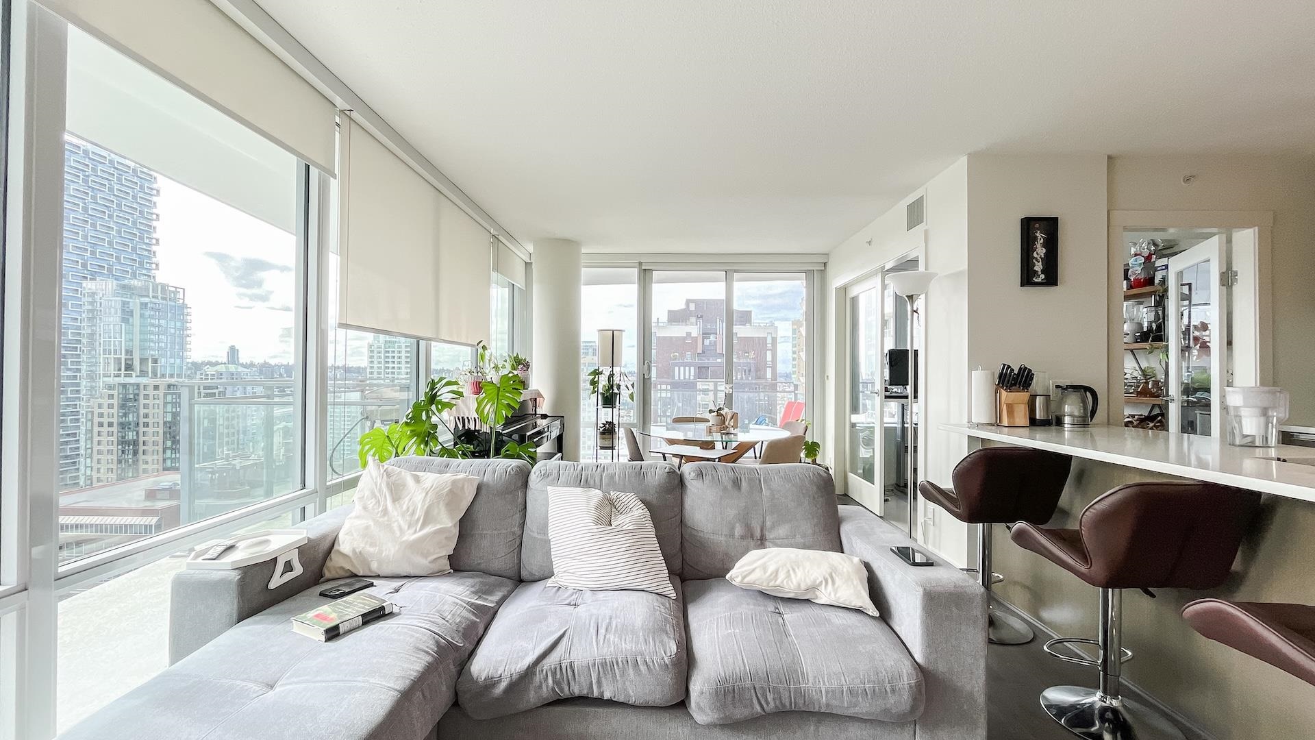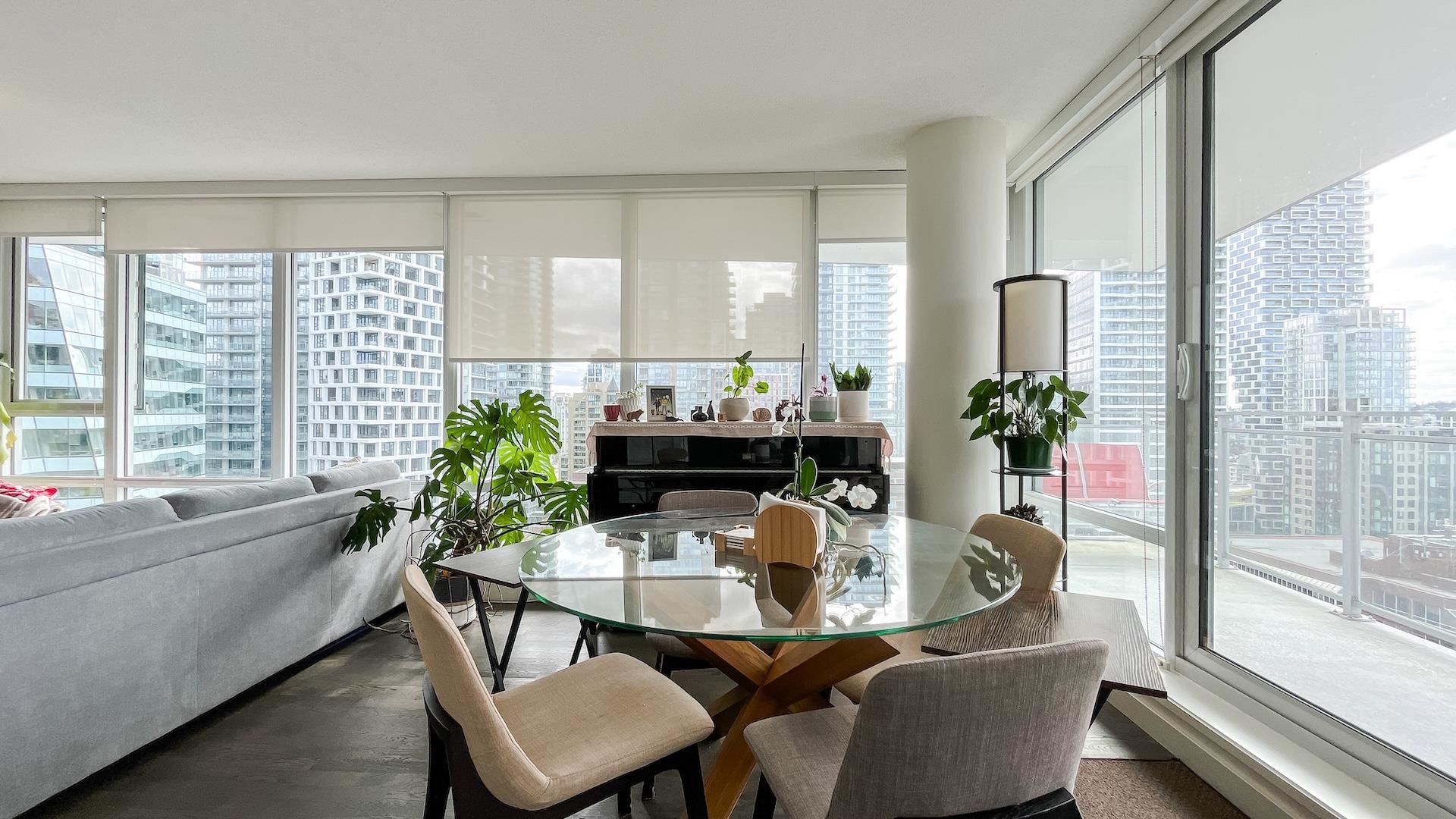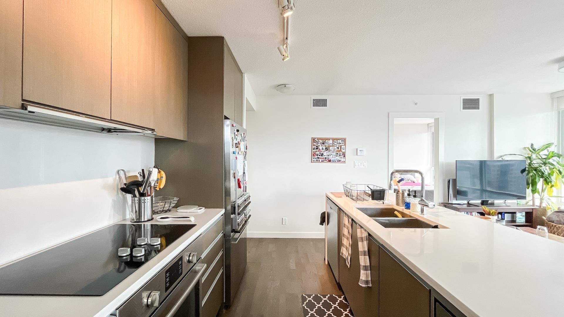 Bright Corner sub-penthouse w/180-degree South-East-West breathtaking panoramic view of city & Ocean. MODERN by Amacon situated in the heart of the highly sought-after community of West End. Spacious 2-bedroom & den (can be a guest 3rd bedroom). Intelligently designed for maximizing space. L-sharp balcony wrapped around the dining room. Floor-to-ceiling windows. Polished stone countertops, engineered-hardwood throughout the living room, high end S/S appliances from Fisher & Paykel & Bosch. The building well...