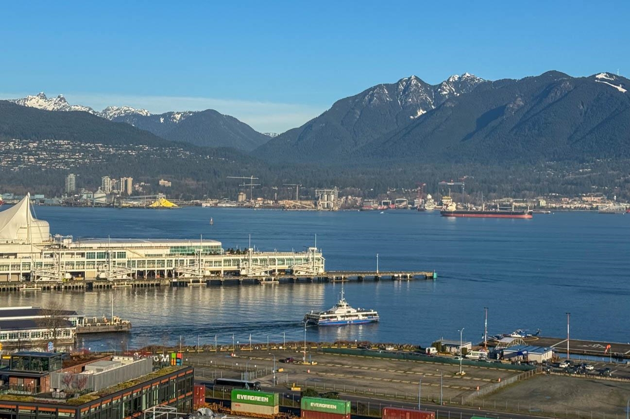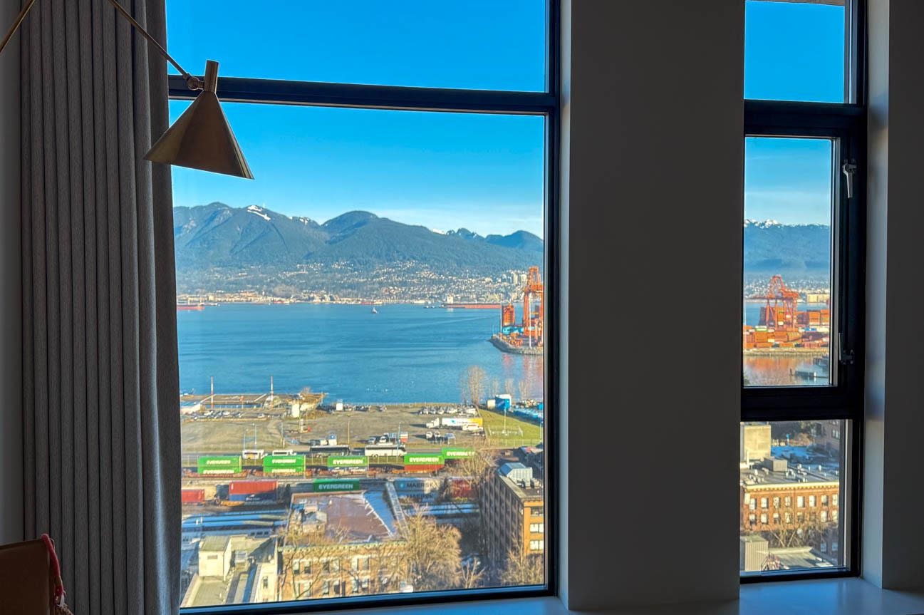 UNFURNISHED 2 bdrm, 2 bath, 1,014 sq. ft. NW corner condo at Woodward’s 32 in Gastown. Unobstructed 270 deg views of Burrard Inlet, N Shore mtns & city skyline from every room. Bright open living, dining & kitchen w floor to ceiling windows with to 2 large tiled balconies. Modern kitchen w quartz counters, gas range, S/S appls incl Bosch DW & island w seating. White oak h/w floors throughout. Master bdrm w floor to ceiling custom wardrobe & spa inspired ensuite w custom vanity, sep tub, walk in shower, Kohl...