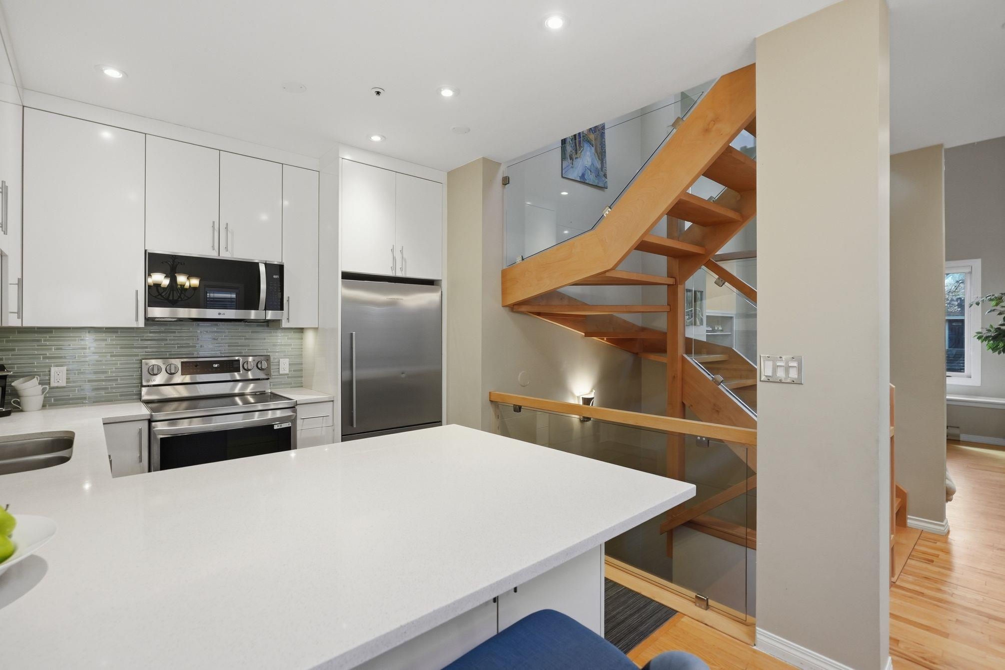 Gorgeous townhome in 4-unit complex in Kits. Vaulted ceilings in living room, open kitchen to dining area, hardwood flooring & 3pc bath on main. Reverse plan with large master, walk in closet with organizers, new stunning 3 pc bath & second bedroom down. French doors to sun drenched patio from master & access to huge storage & common basement area from this level. Upper level mezzanine BEDROOM & OFFICE built in 2023 is perfect with entertainment size view deck upgraded 2023. Bonus - private single garage. T...