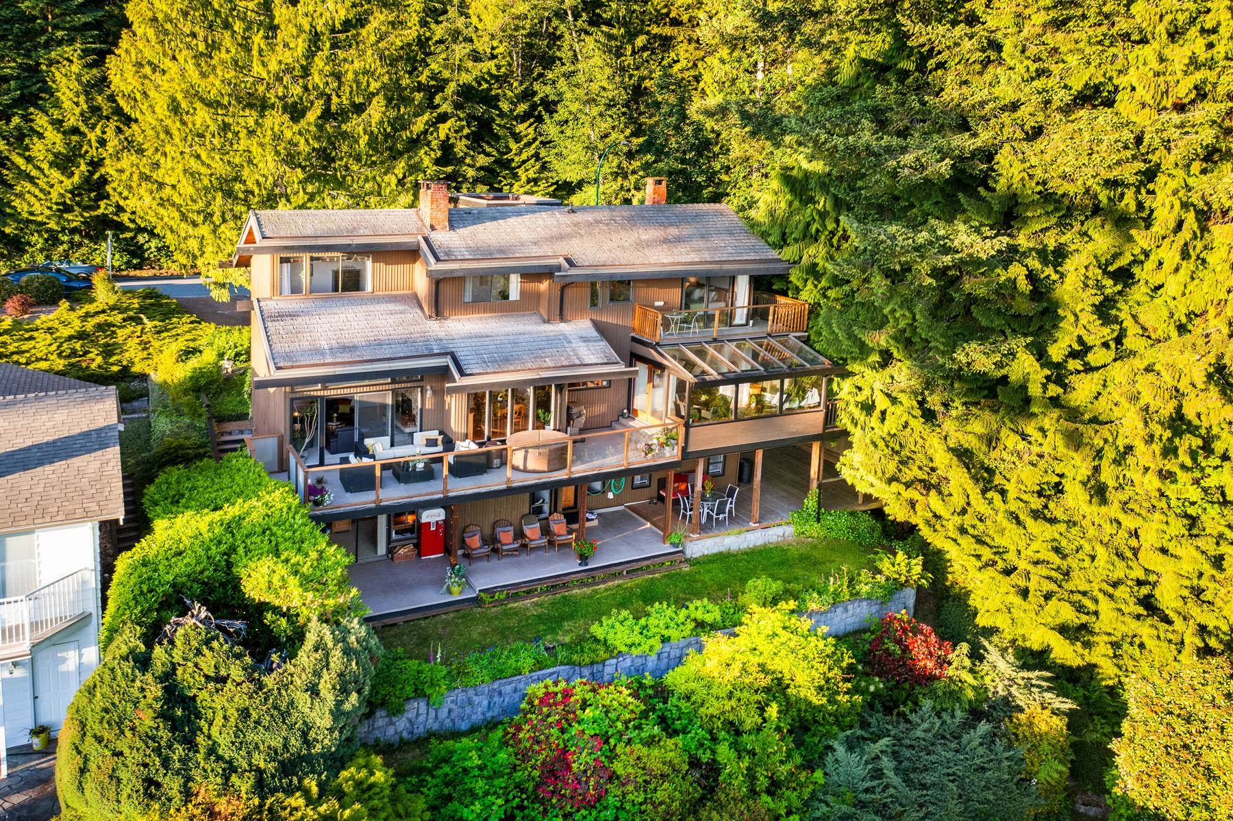 ONE OF A KIND WESTCOAST BEAUTY! Experience this forever-view property & fall in love w its setting & floor plan. Enjoy jaw dropping ocean & city views from 3 decks & every rm in the house. A sprawling main flr w sunken living room, family room off the kitchen & a magical sunroom all flowing out to a spacious sunny deck. 3 bed up w cedar vaulted ceilings & 2 bed down. Another family room down w wood F/P & flowing out to backyard - all w the wow view. A 2 bed suite down ideal for family or income generator. O...
