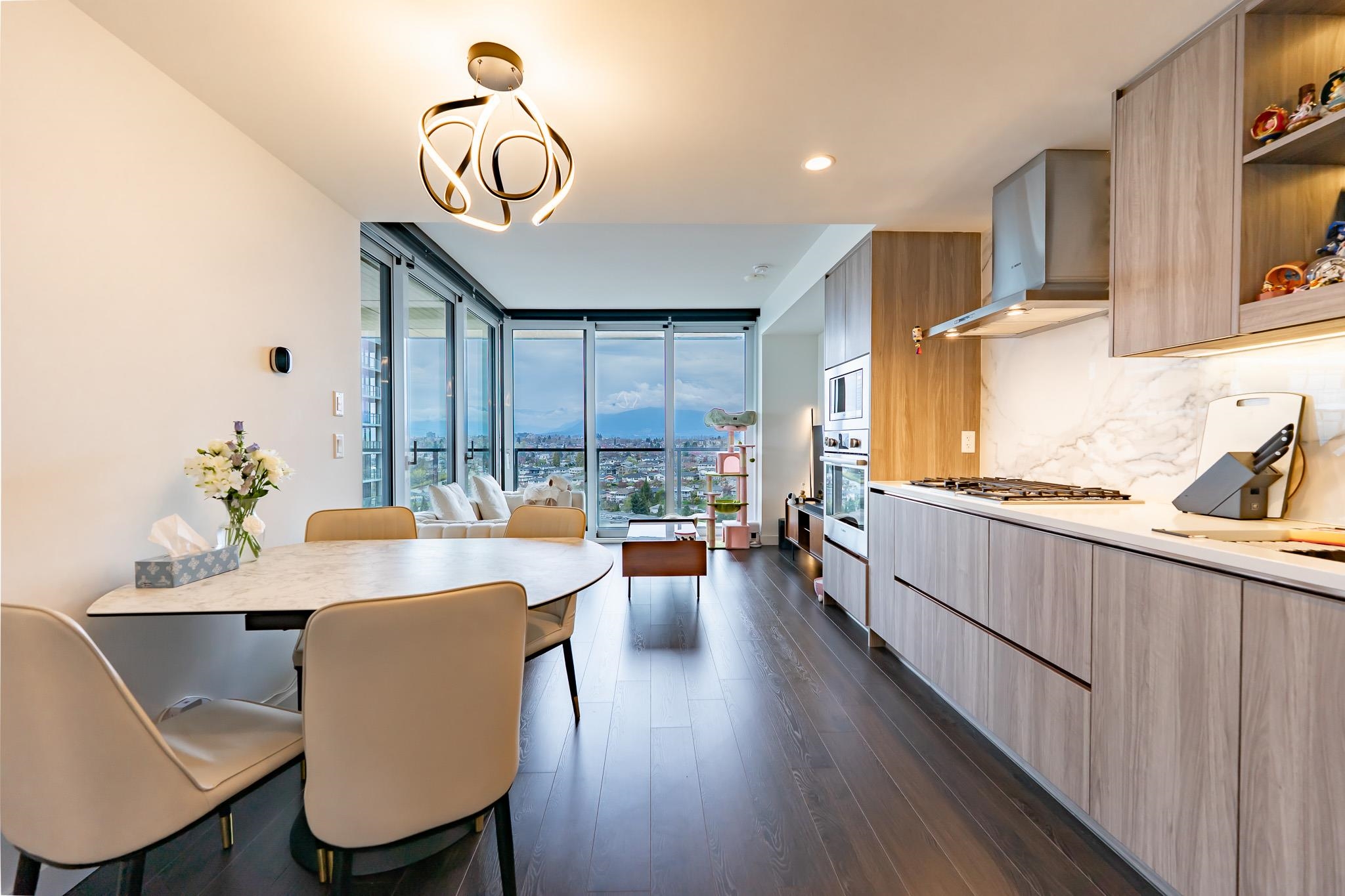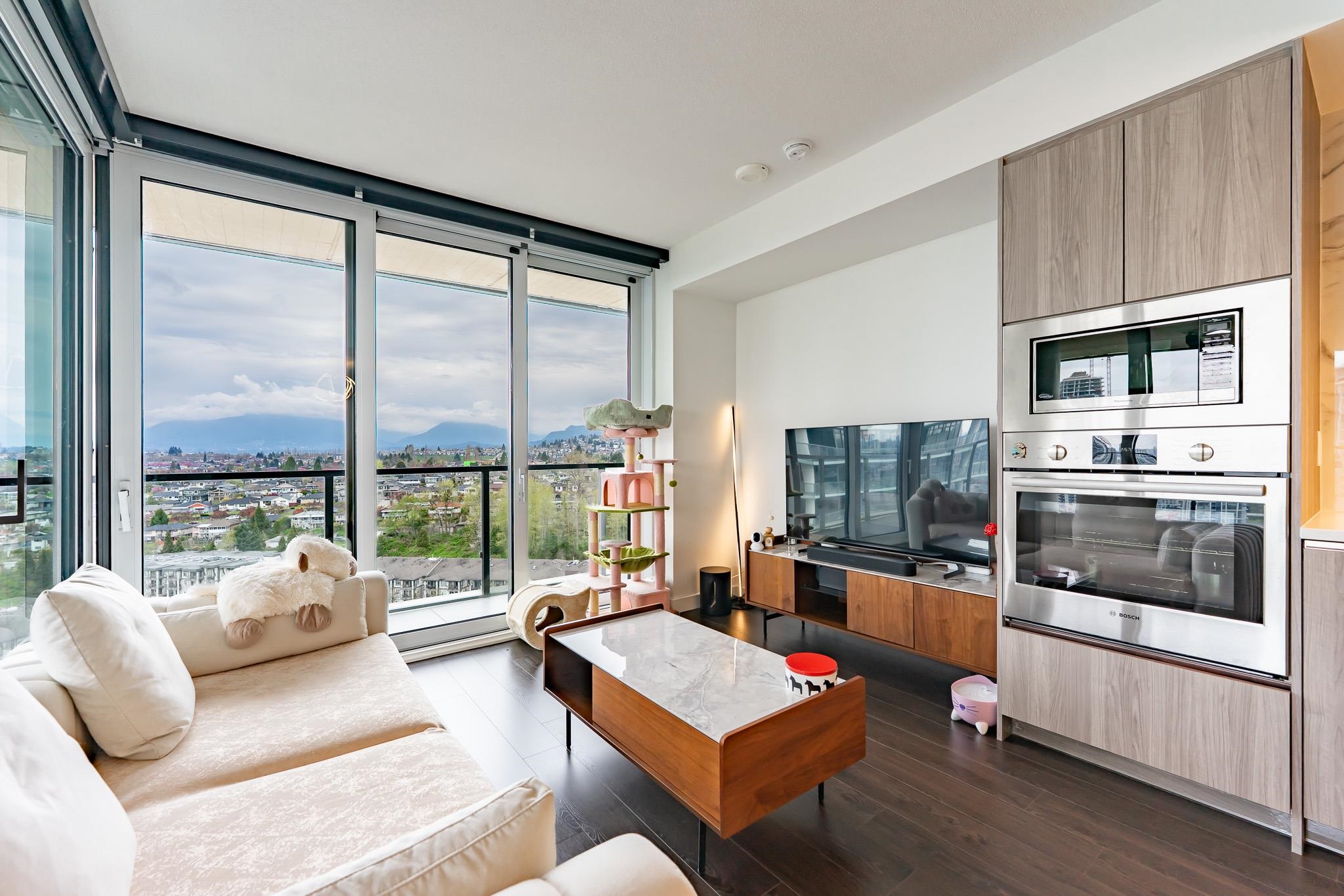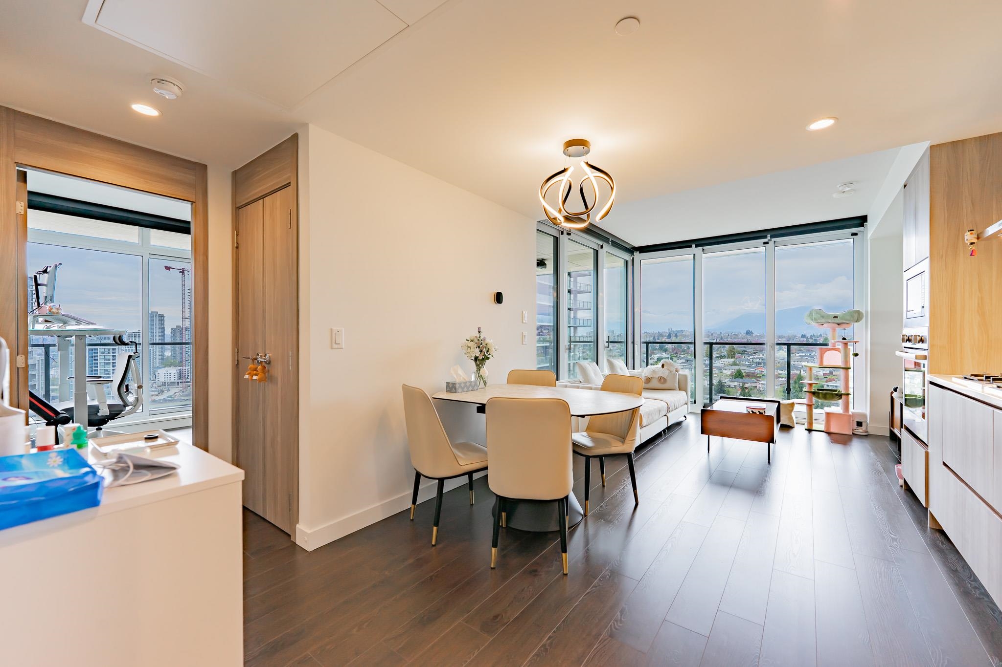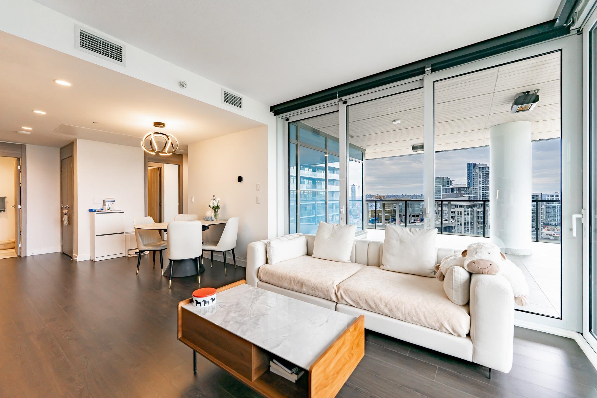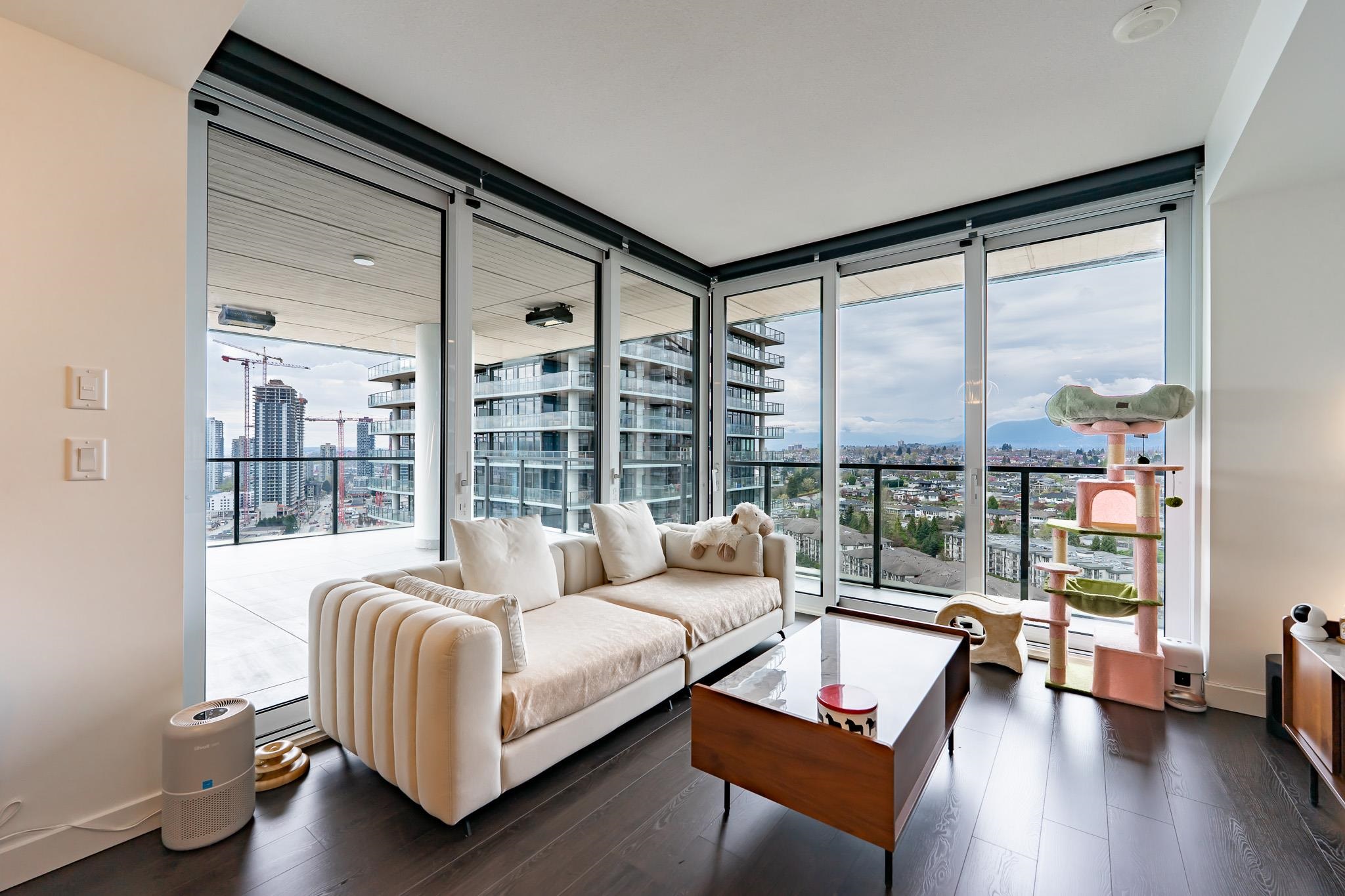 Welcome to this luxurious NW corner unit with stunning city and mountain views at Concord Brentwood Hillside East! Built by Concord Pacific, this 2-bed, 2-bath unit includes high-end integrated Bosch appliances, floor-to-ceiling windows, wide plank laminate flooring, central A/C, and closet organizers. Enjoy seamless indoor/outdoor living with an oversized 525 sq ft covered wrap around balcony with a ceiling heater. Amenities include 24/7 Concierge, fitness centre, car wash, party room, games room, pet room...
