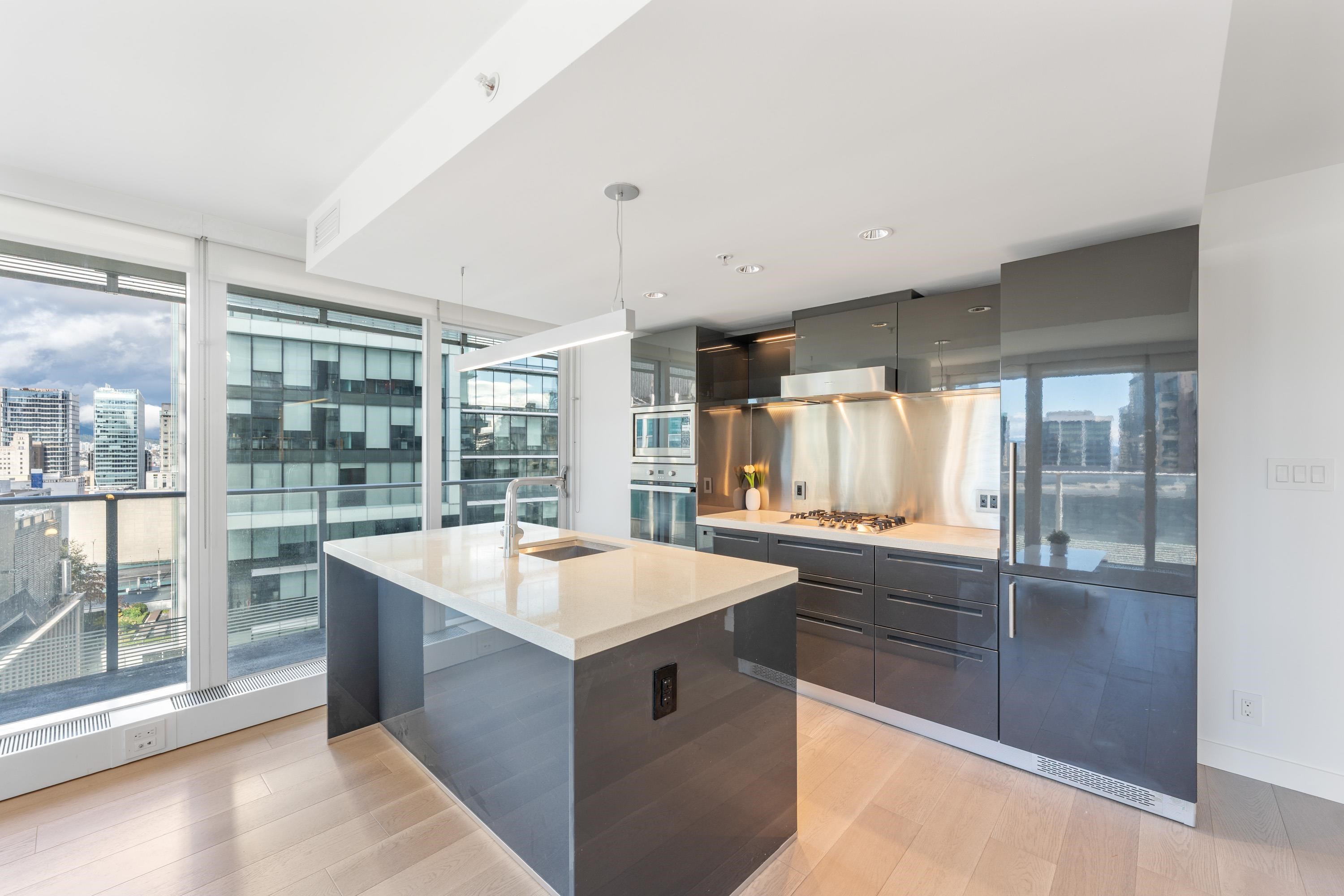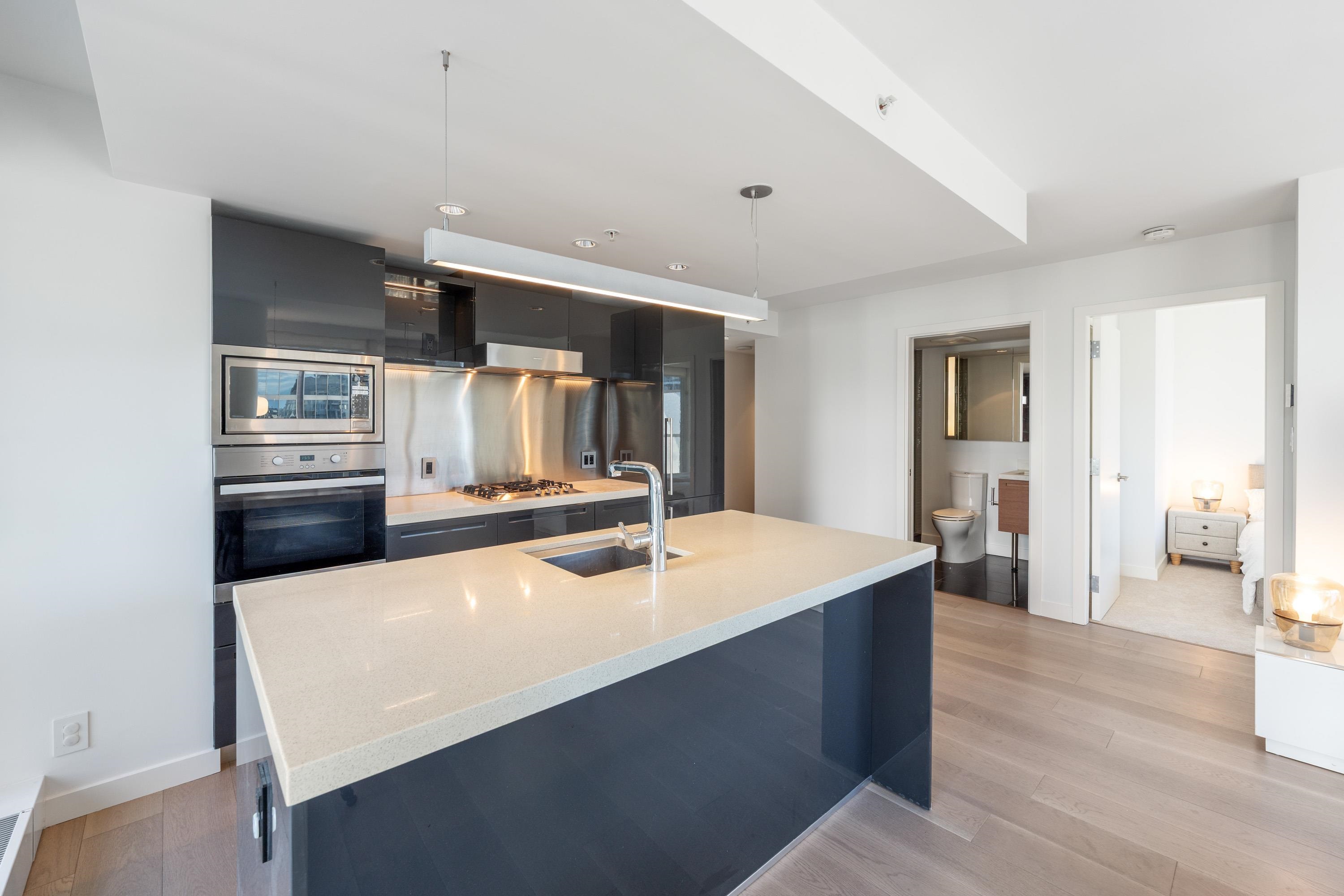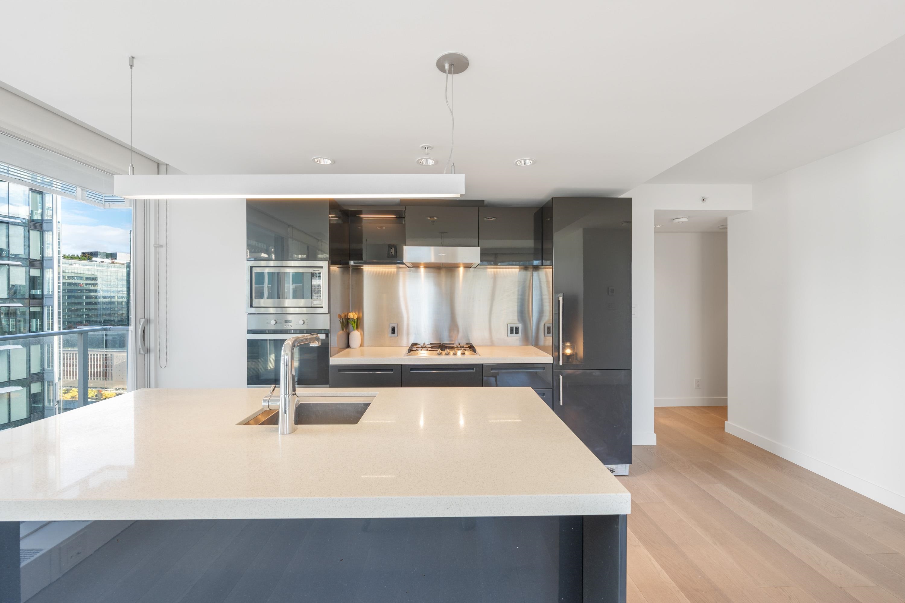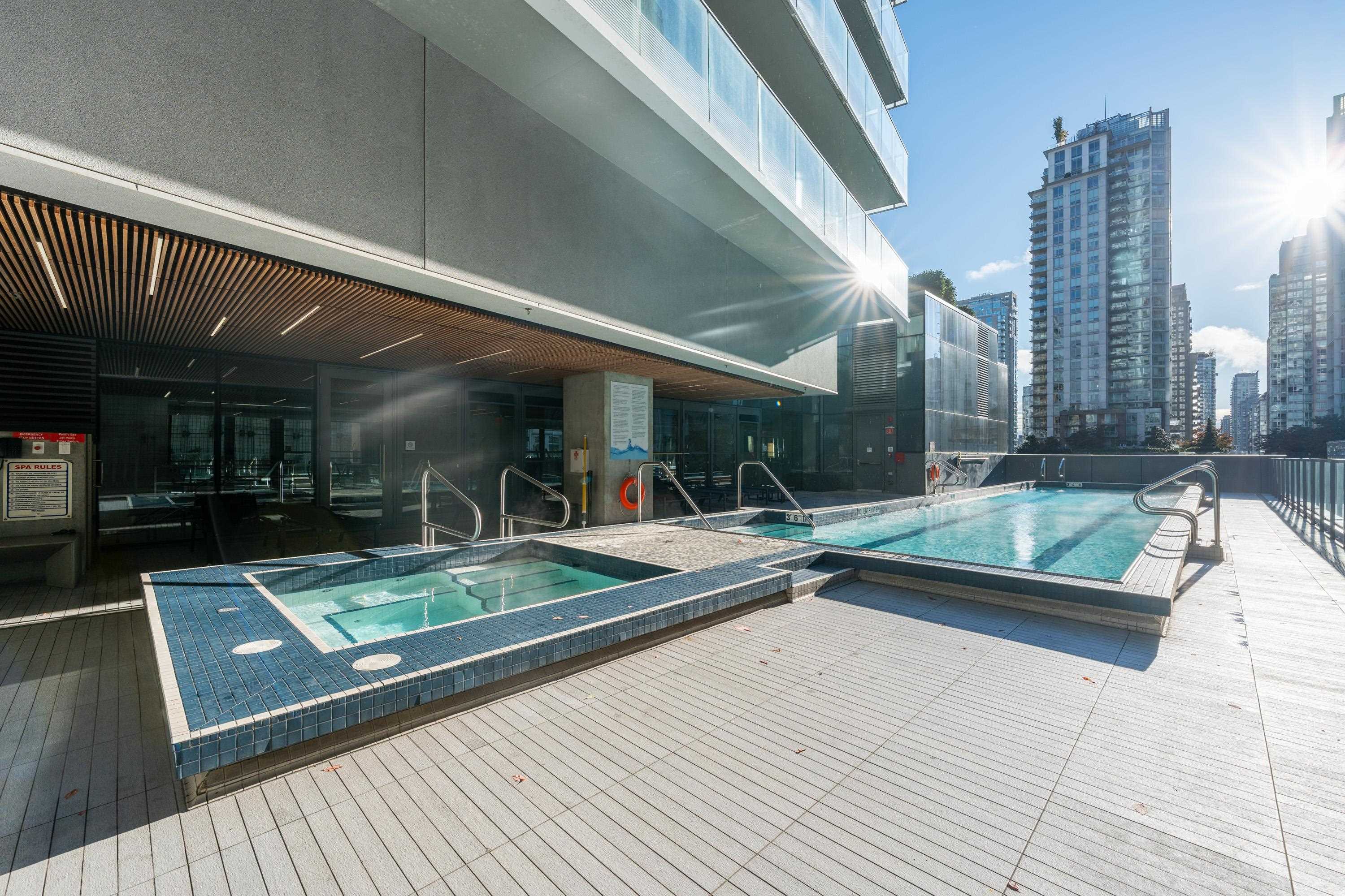Northwest Air-conditioned corner unit with 2 beds, 2 baths + flex room, featuring a huge wrap-around balcony for city views! Functional layout with Modern kitchen with Miele appliances, Kohler fixtures in bathrooms, bamboo floors + carpets, and energy-saving AC. Building perks: heated pool, rooftop garden (dog-friendly!), gym, and 24/7 concierge. Perfect downtown location – steps away from shops, restaurants, and entertainment! One Parking and One locker included. Nov 8 (Sat) 2-4pm.
