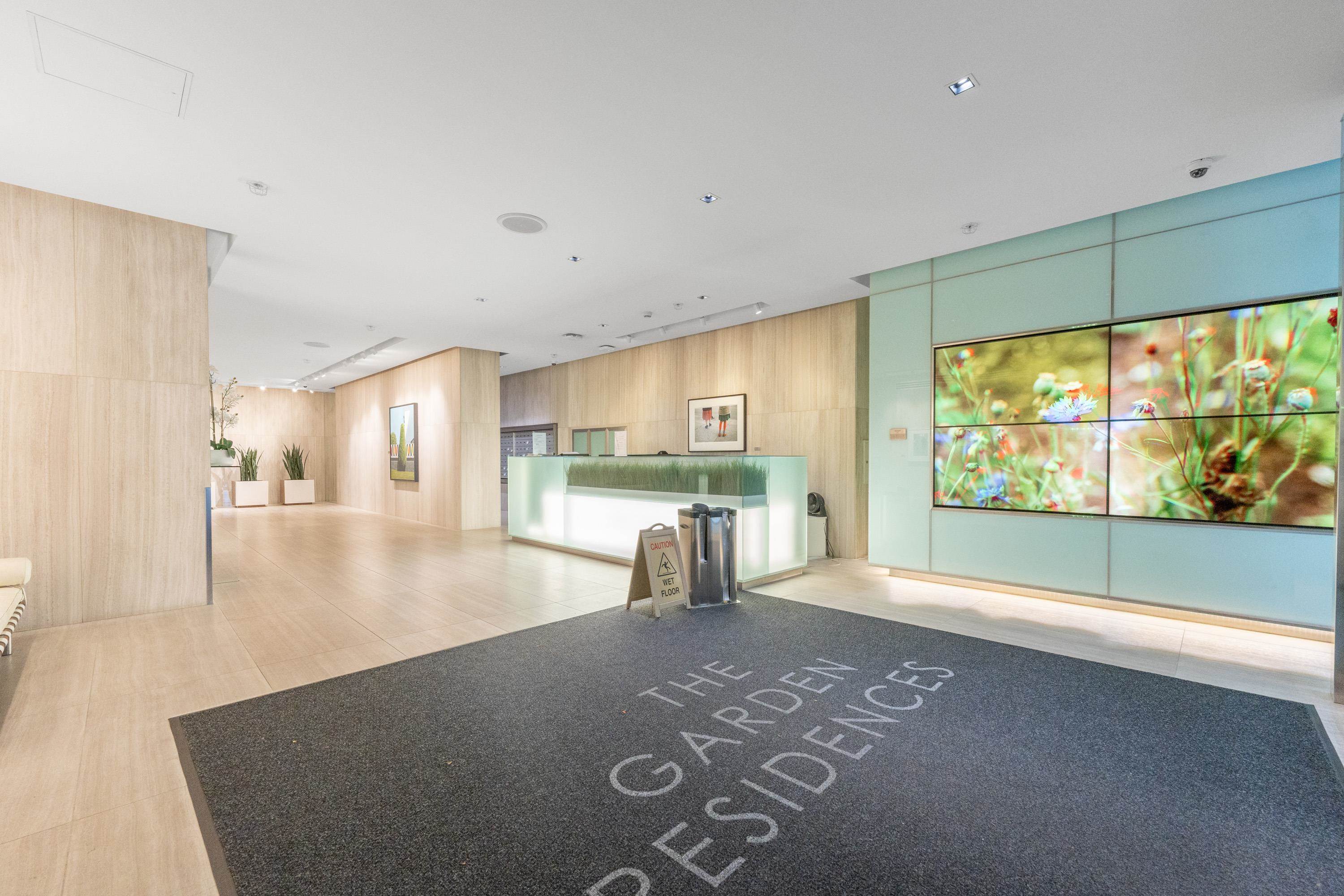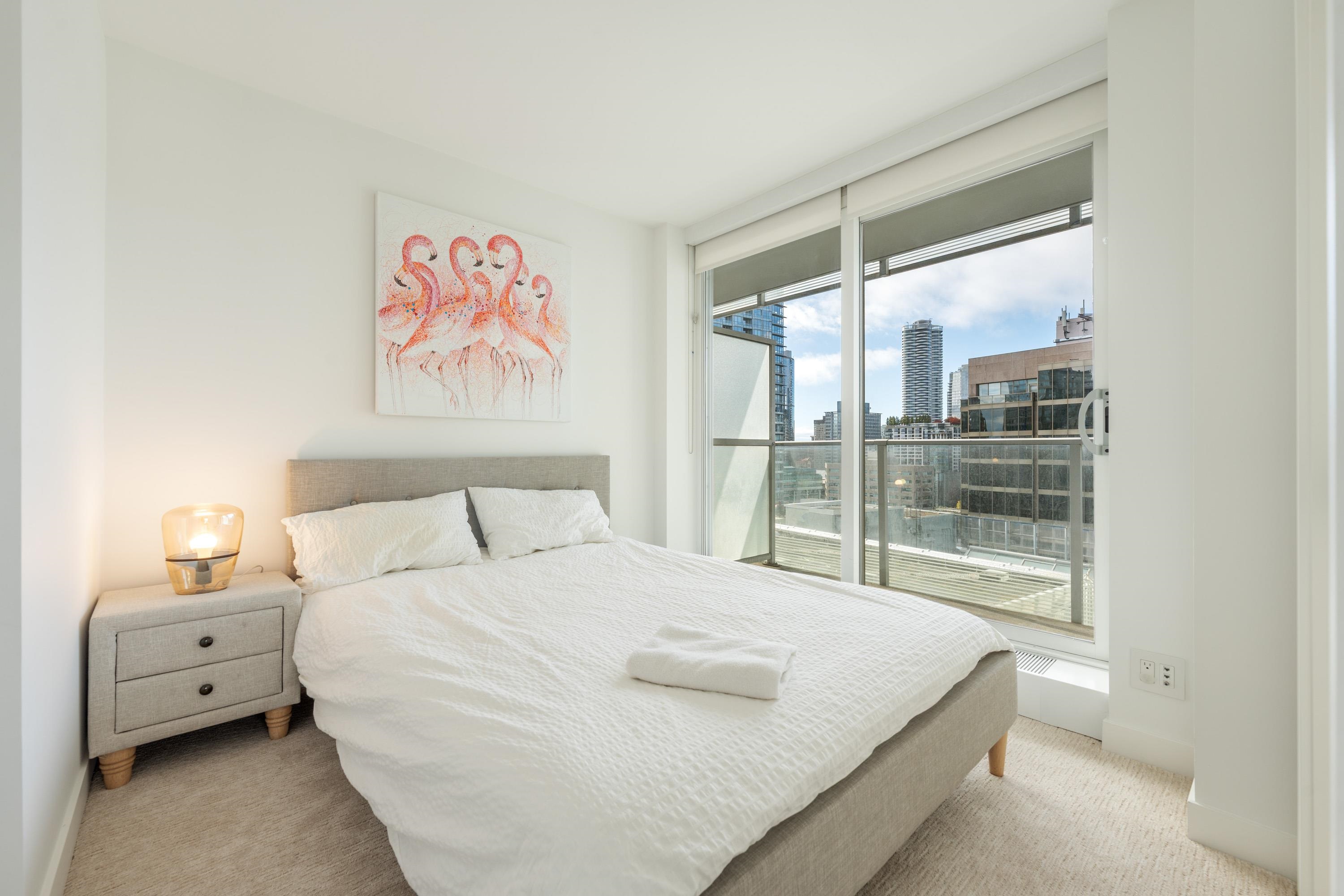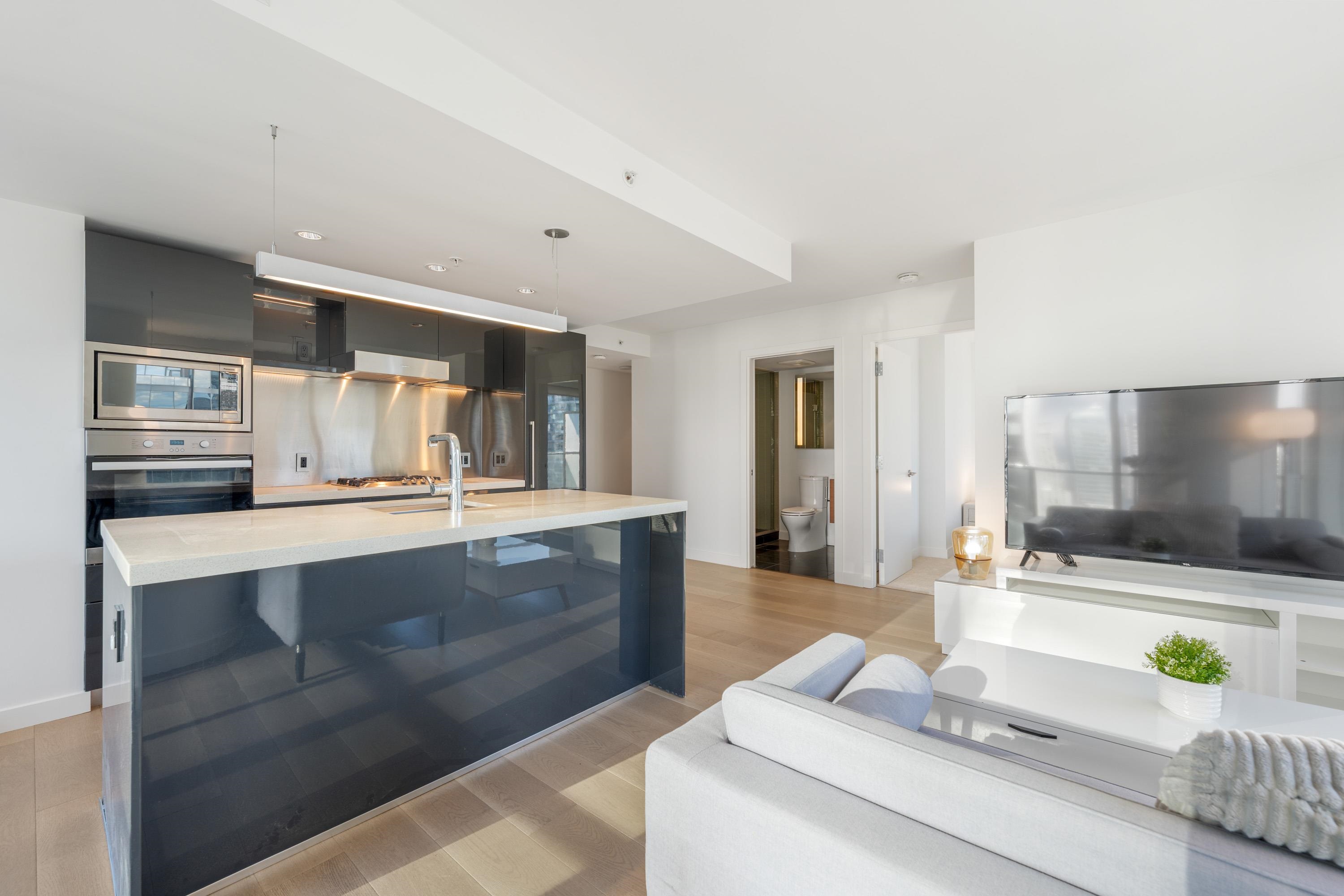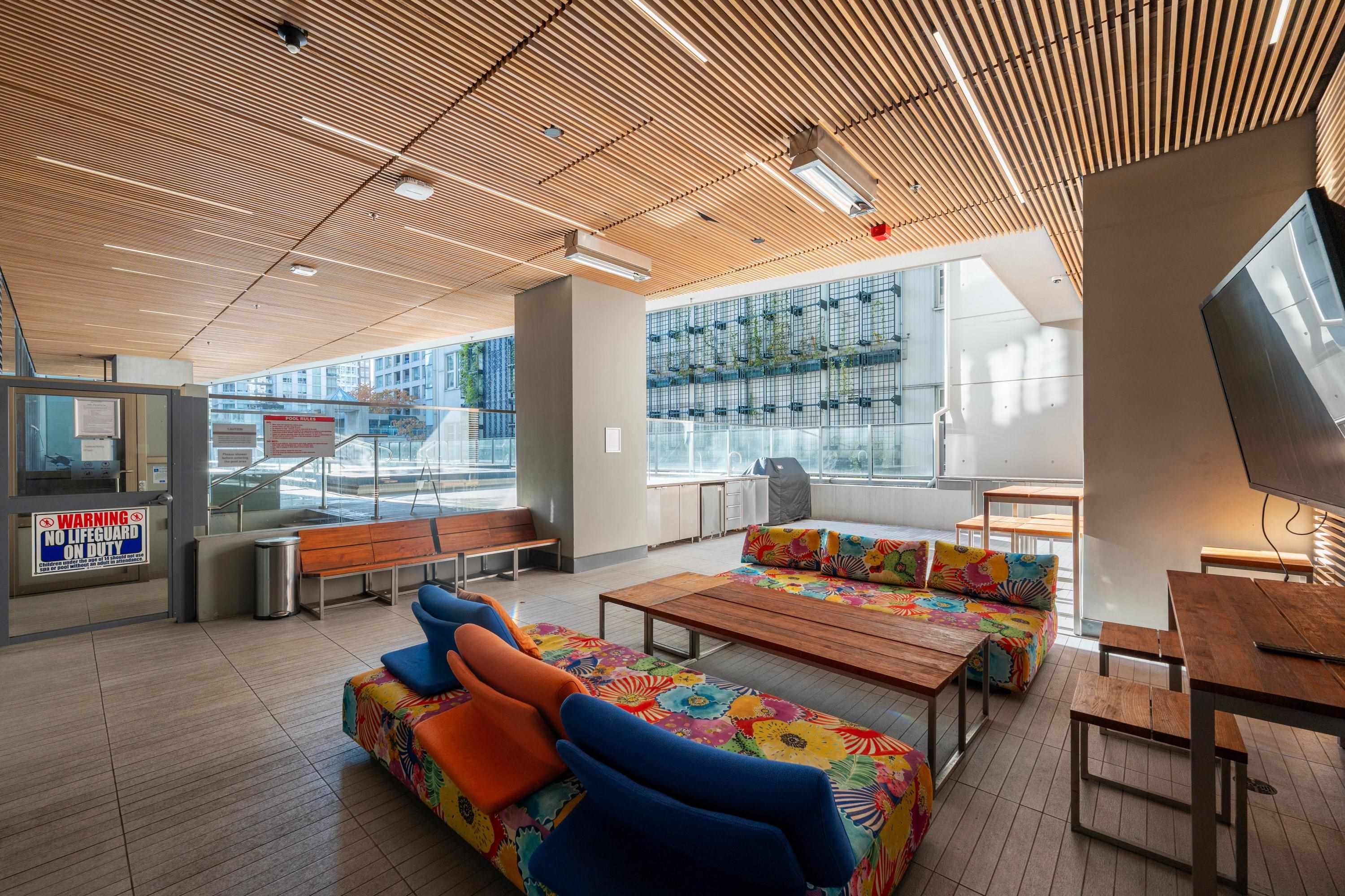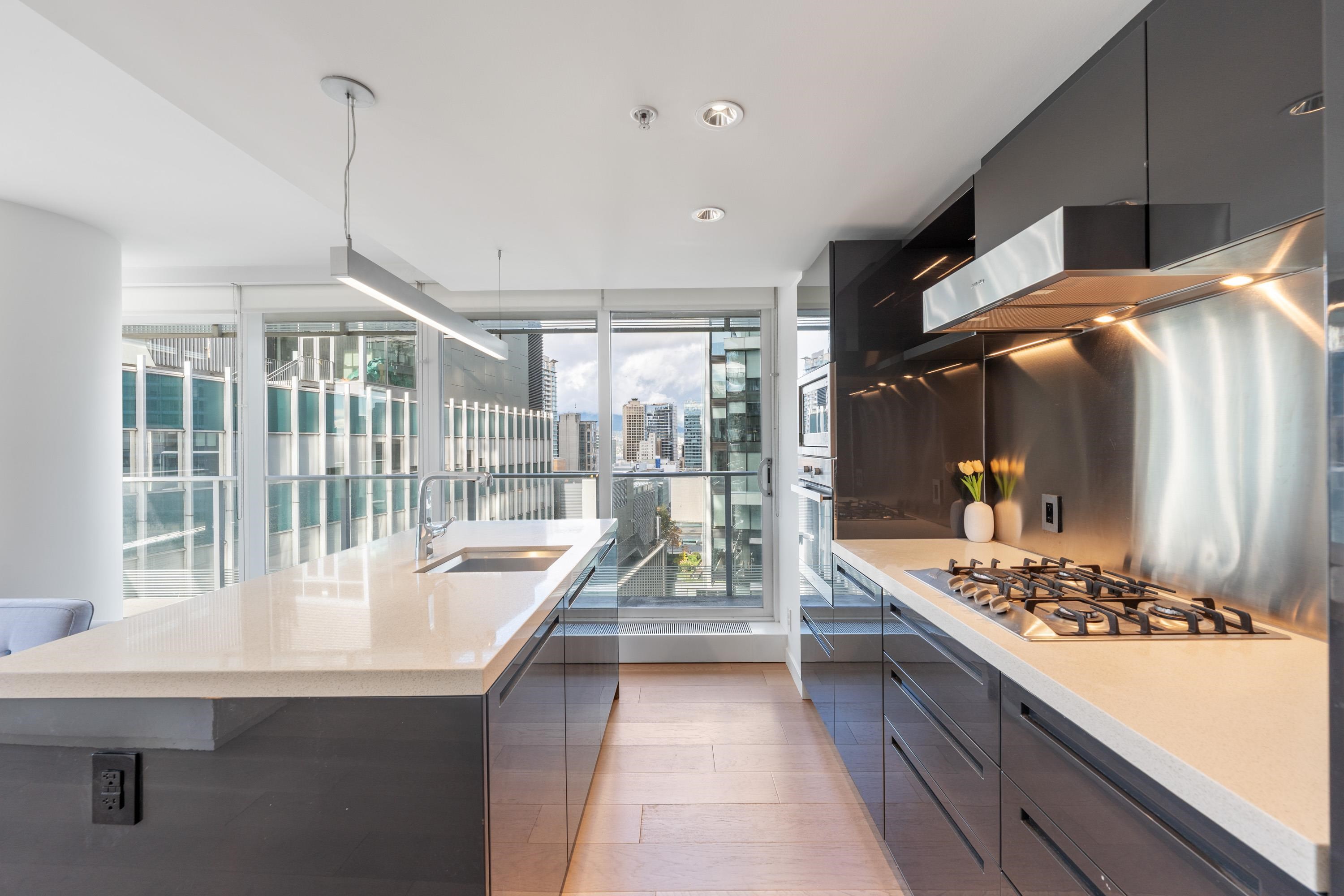 Northwest Air-conditioned corner unit with 2 beds, 2 baths + flex room, featuring a huge wrap-around balcony for city views! Functional layout with Modern kitchen with Miele appliances, Kohler fixtures in bathrooms, bamboo floors + carpets, and energy-saving AC. Building perks: heated pool, rooftop garden (dog-friendly!), gym, and 24/7 concierge. Perfect downtown location – steps away from shops, restaurants, and entertainment! One Parking and One locker included. Nov 8 (Sat) 2-4pm.