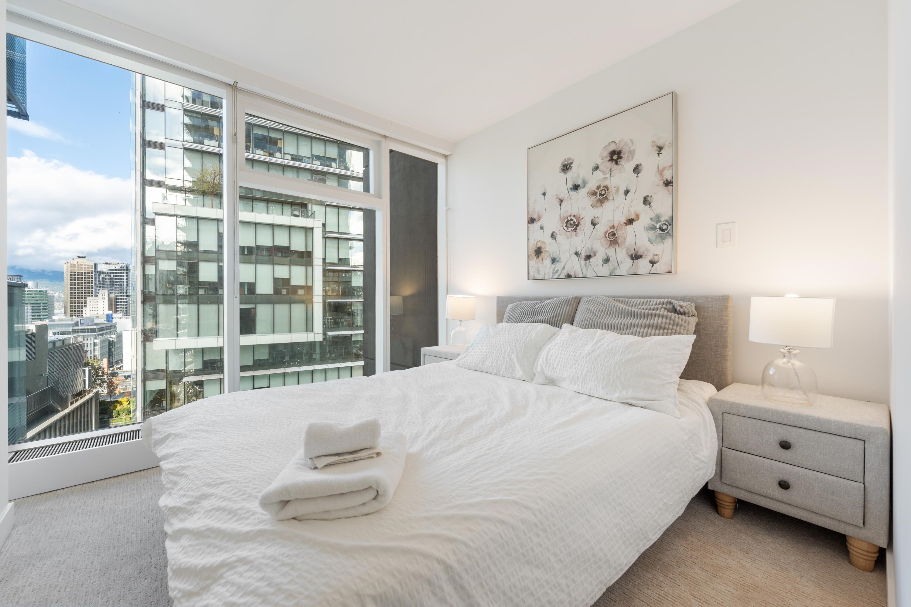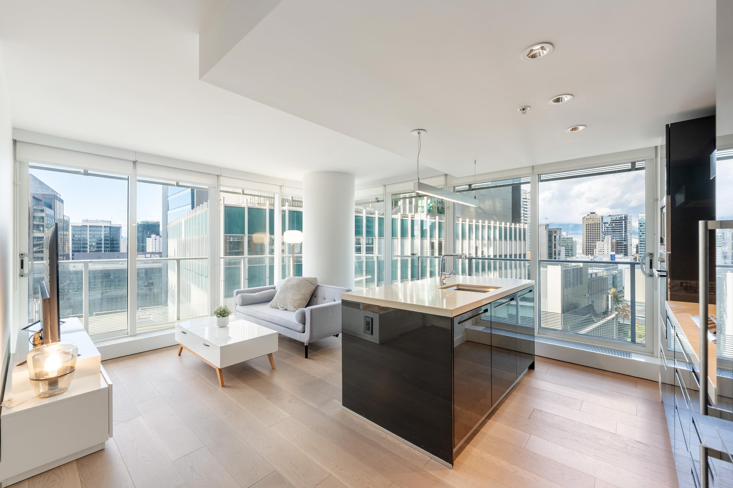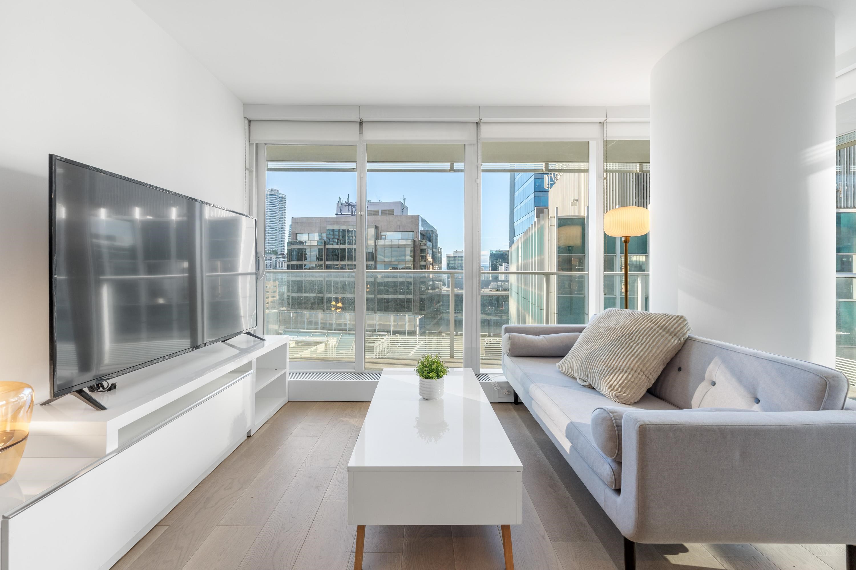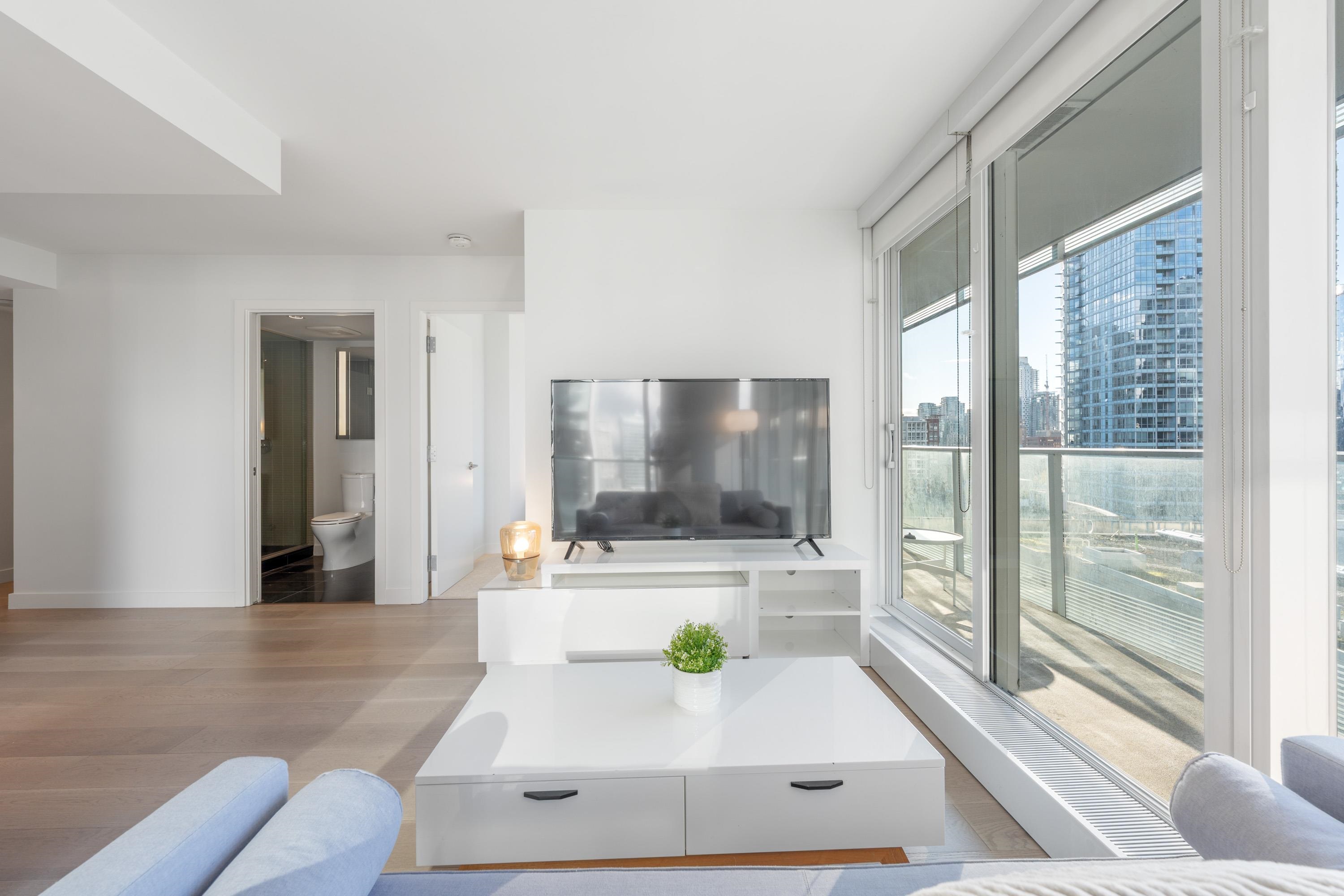 Northwest Air-conditioned corner unit with 2 beds, 2 baths + flex room, featuring a huge wrap-around balcony for city views! Functional layout with Modern kitchen with Miele appliances, Kohler fixtures in bathrooms, bamboo floors + carpets, and energy-saving AC. Building perks: heated pool, rooftop garden (dog-friendly!), gym, and 24/7 concierge. Perfect downtown location – steps away from shops, restaurants, and entertainment! One Parking and One locker included. Nov 8 (Sat) 2-4pm.