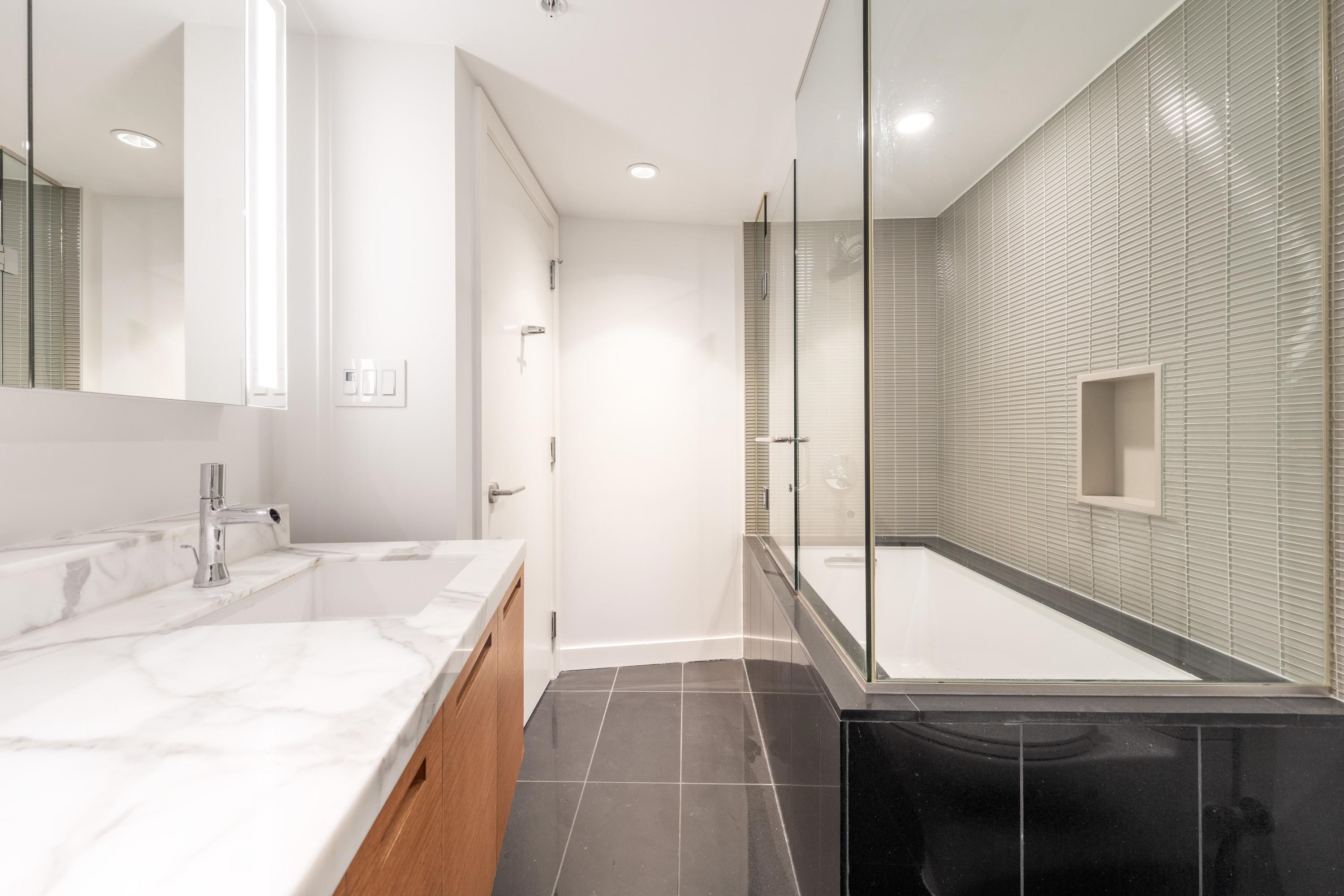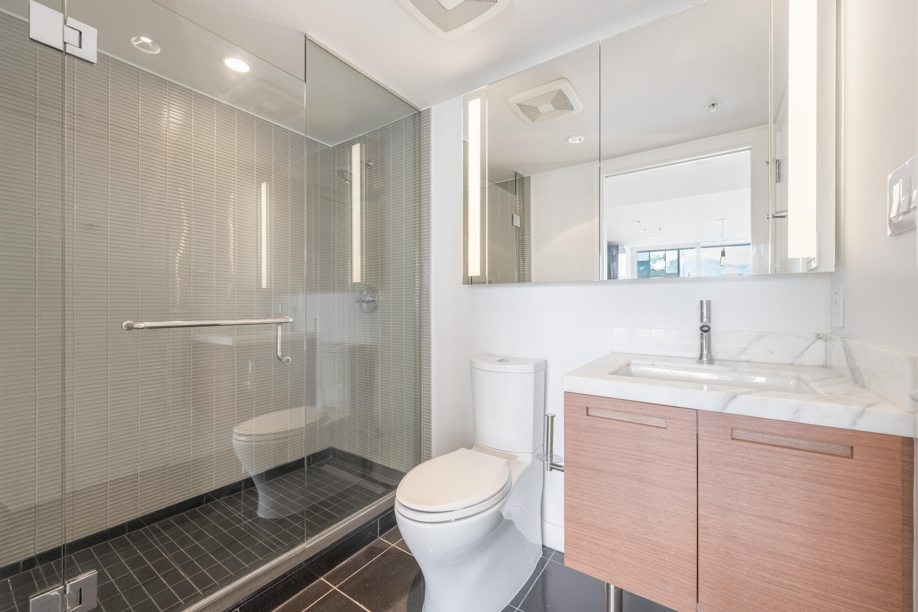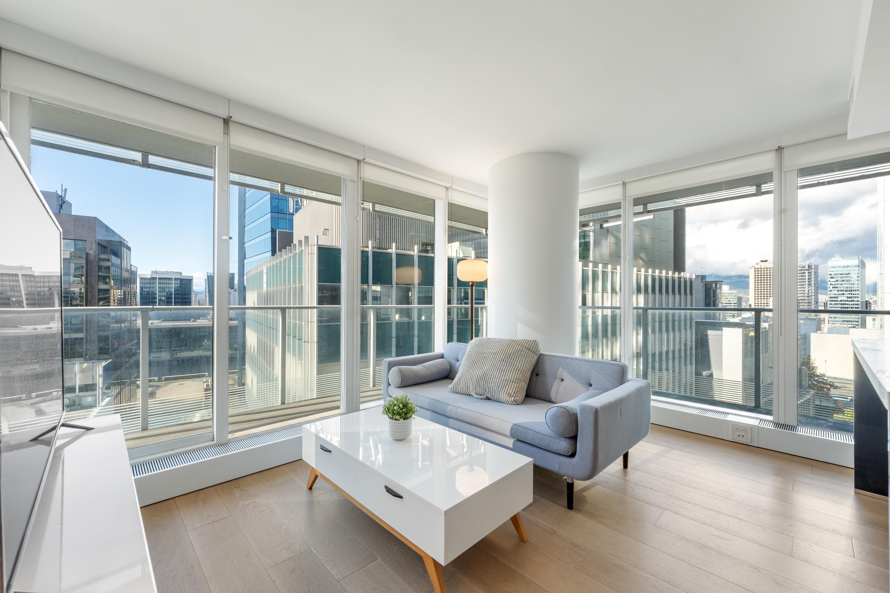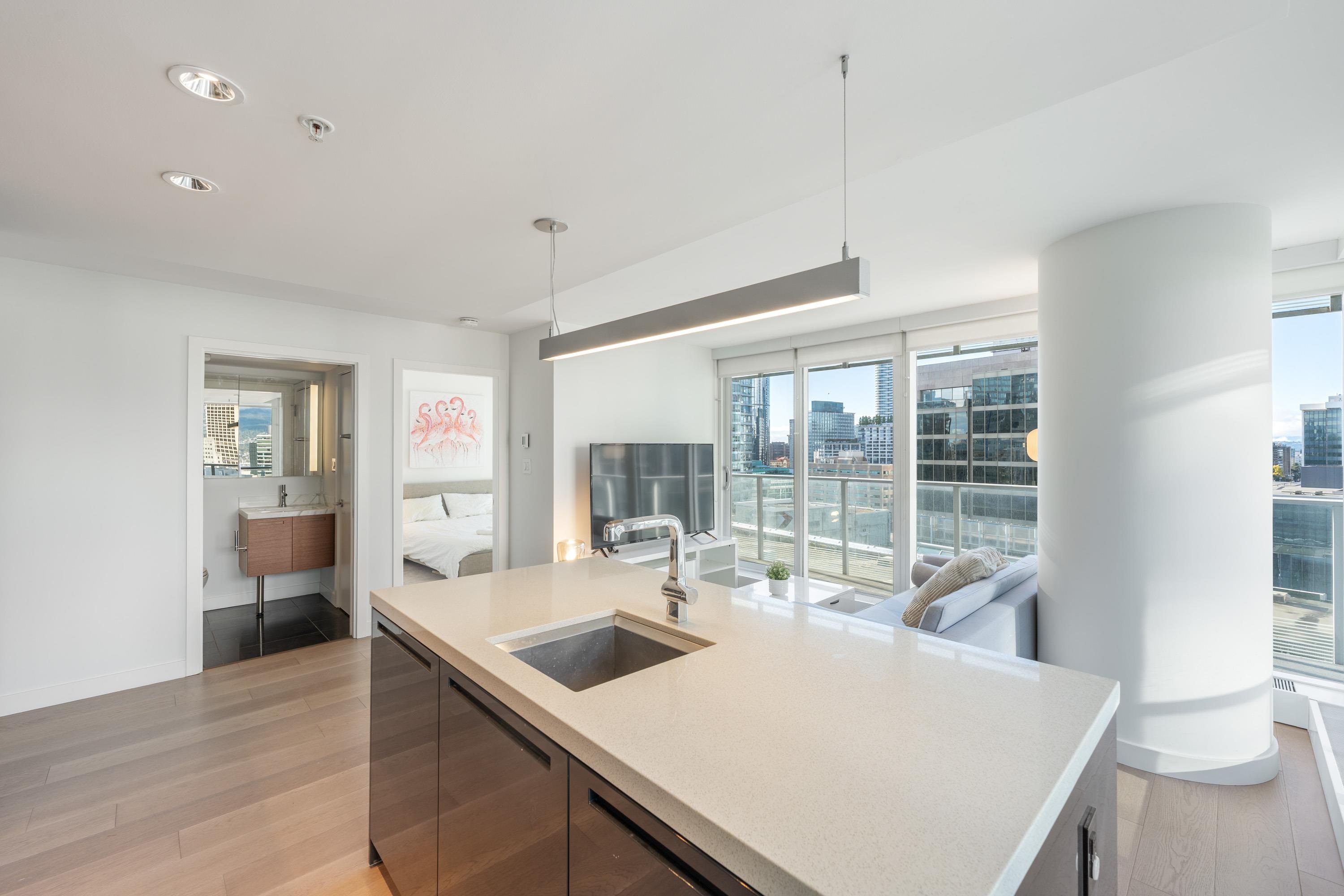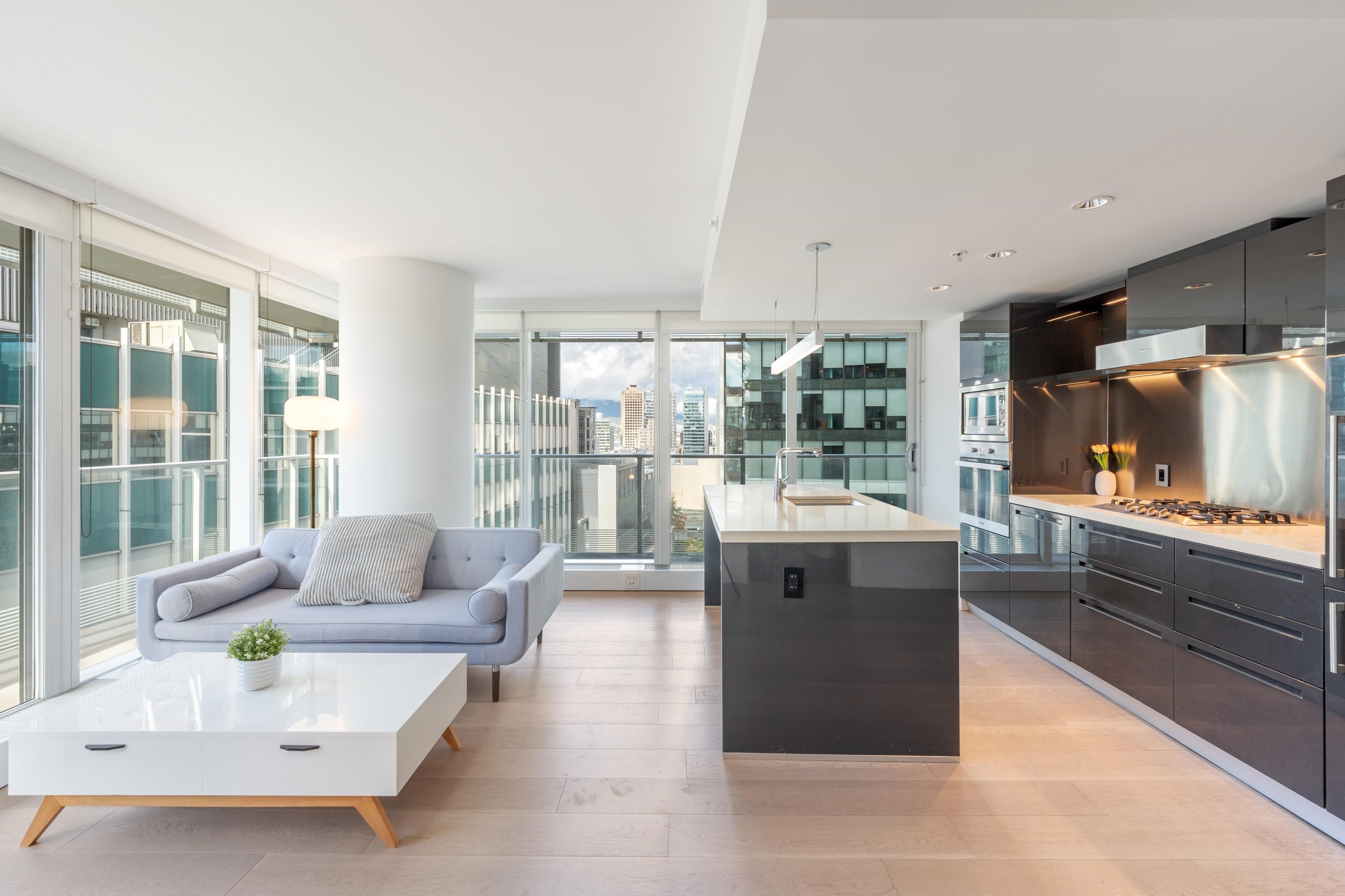 Northwest Air-conditioned corner unit with 2 beds, 2 baths + flex room, featuring a huge wrap-around balcony for city views! Functional layout with Modern kitchen with Miele appliances, Kohler fixtures in bathrooms, bamboo floors + carpets, and energy-saving AC. Building perks: heated pool, rooftop garden (dog-friendly!), gym, and 24/7 concierge. Perfect downtown location – steps away from shops, restaurants, and entertainment! One Parking and One locker included. Nov 8 (Sat) 2-4pm.