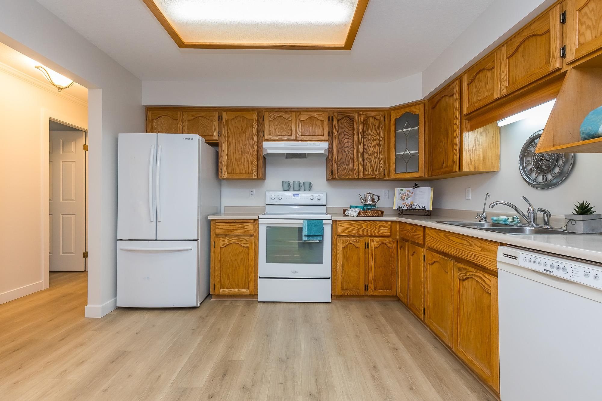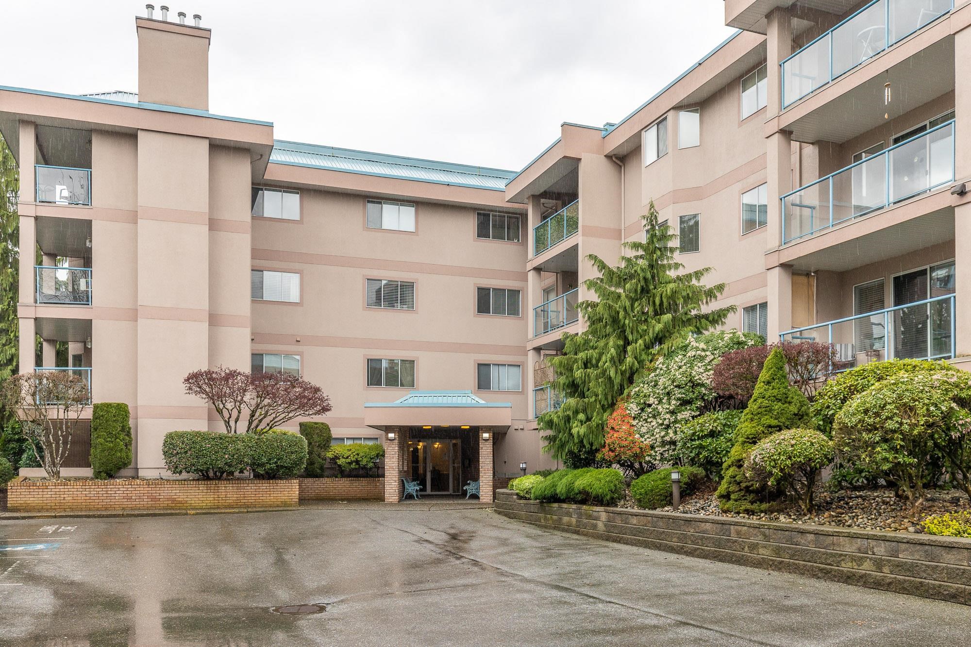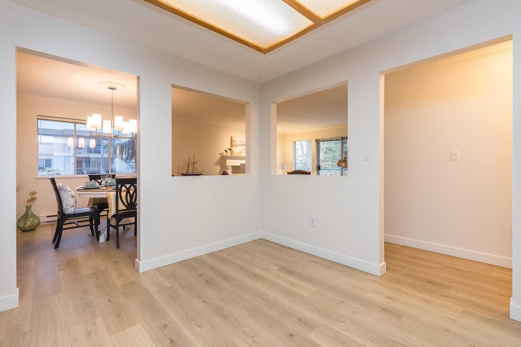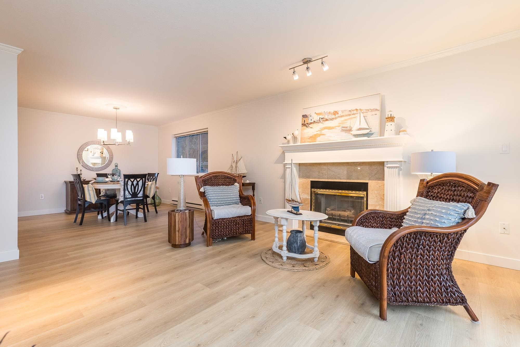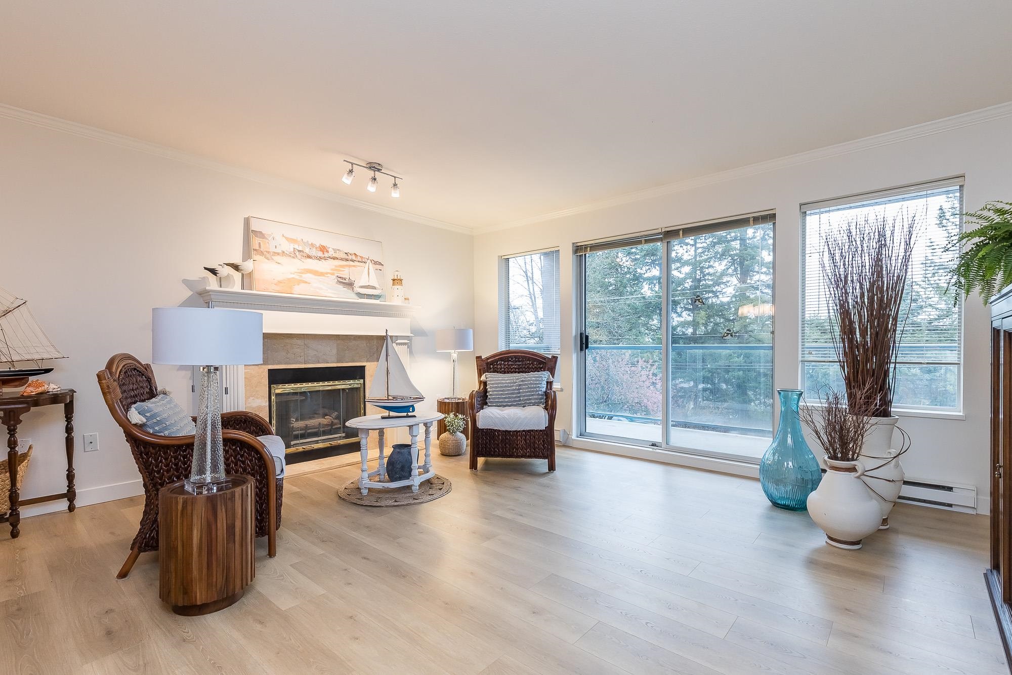 TIFFANY PARK....Bright and spacious CORNER UNIT with loads of windows. Freshly painted with all new flooring, moldings and light fixtures. Lots of cupboards in the oak kitchen. Every room is large so no need to downsize any furniture. Cozy gas fireplace in the living room. Large deck with a view of the north shore mountains. The low monthly strata fee includes heat, lights, hot water and gas fireplace. This unit is in move in ready condition. 55 plus, no pets. Secure underground parking stall.