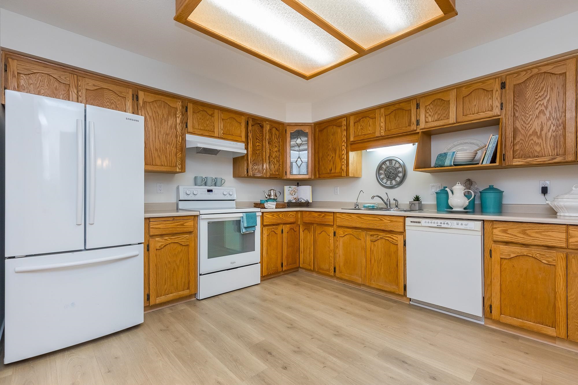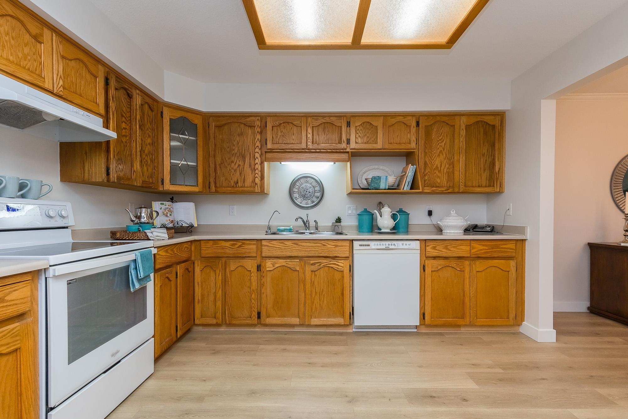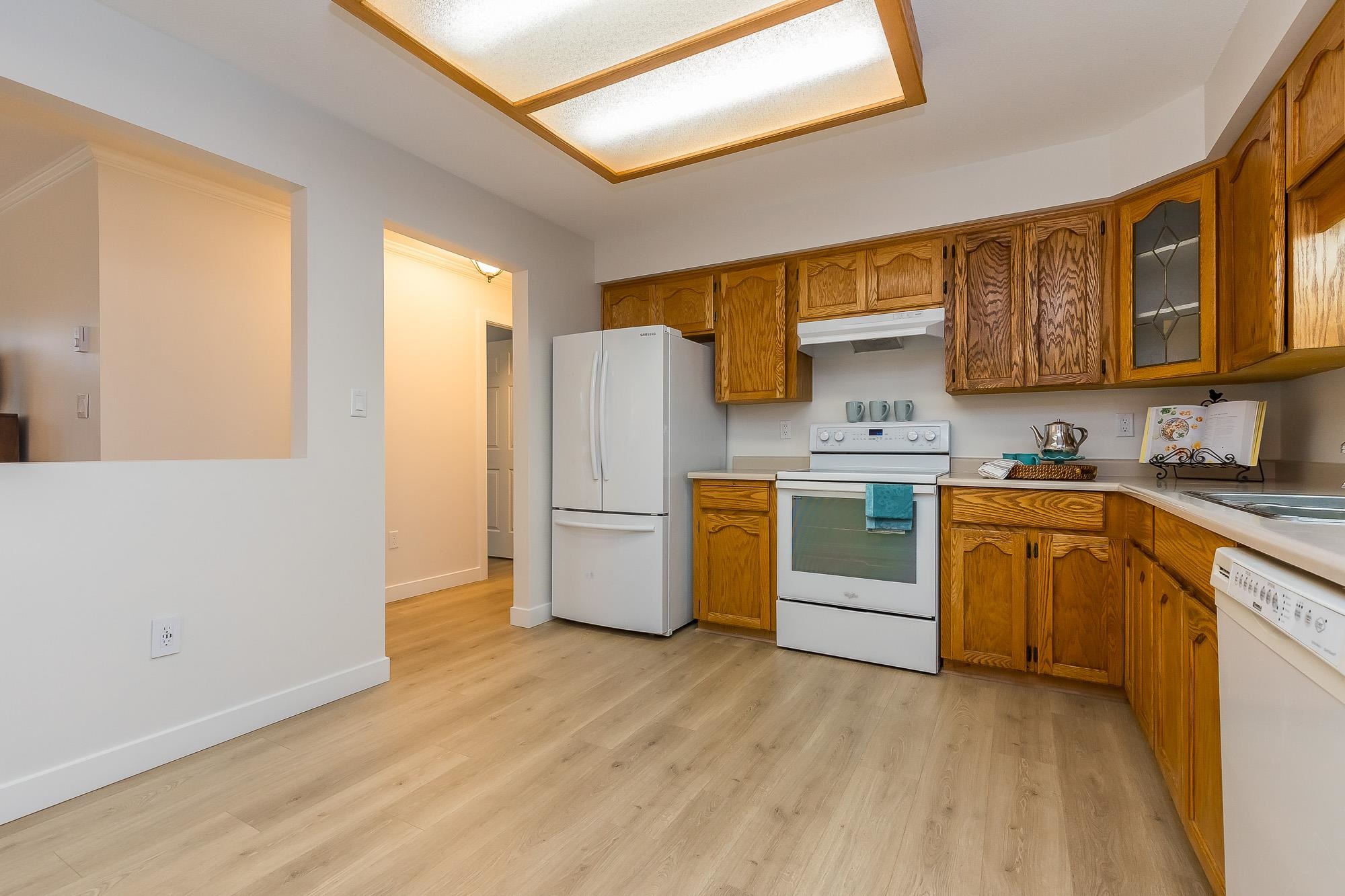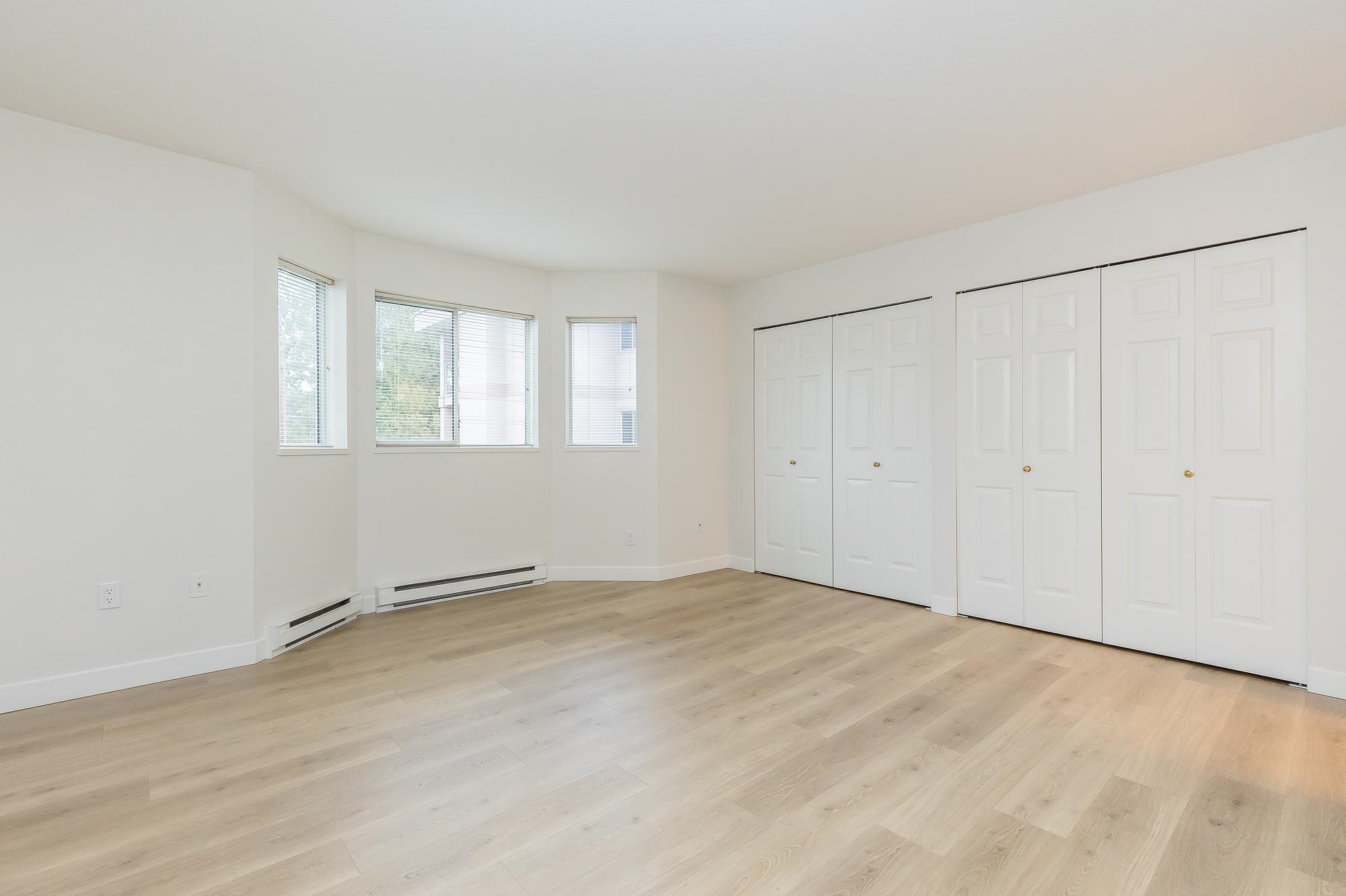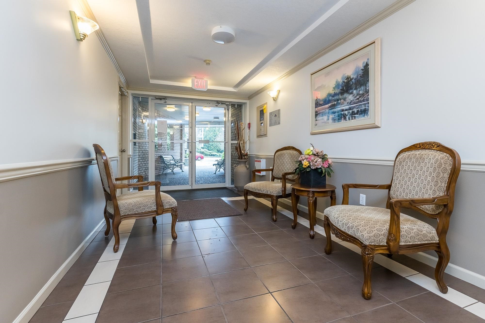 TIFFANY PARK....Bright and spacious CORNER UNIT with loads of windows. Freshly painted with all new flooring, moldings and light fixtures. Lots of cupboards in the oak kitchen. Every room is large so no need to downsize any furniture. Cozy gas fireplace in the living room. Large deck with a view of the north shore mountains. The low monthly strata fee includes heat, lights, hot water and gas fireplace. This unit is in move in ready condition. 55 plus, no pets. Secure underground parking stall.
