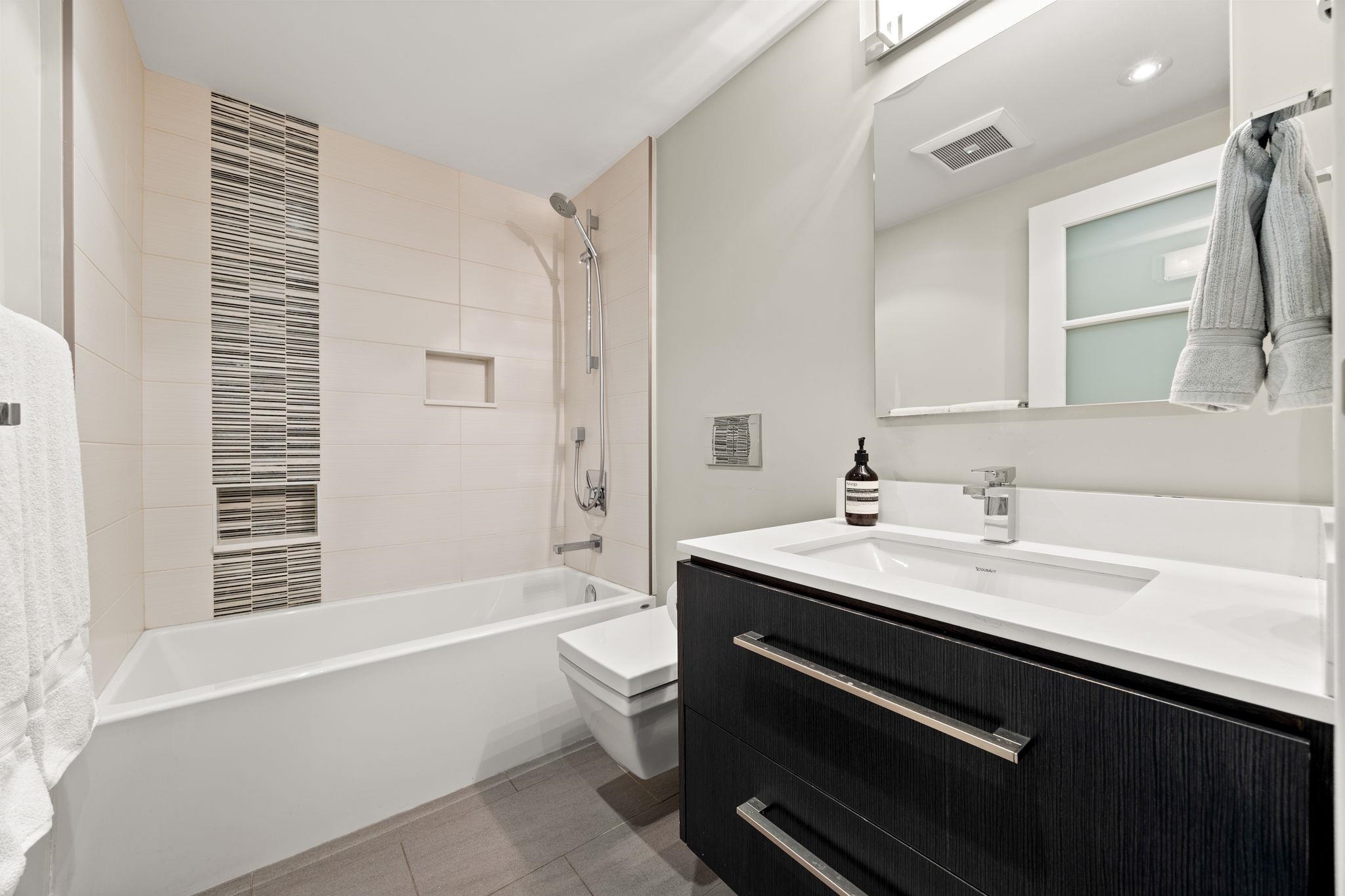 Stunning view home with south-facing patio (420 sqft) in this fully rainscreened “North of 4th” building. This home offers two private outdoor spaces and seamless, high-end finishes throughout. Features include an 11-ft island with Thermador appliances, Dornbracht fixtures, custom solid wood doors, engineered cherry hardwood, and Control4 automation. Luxurious bathrooms with heated floors, curbless walk-in shower, infinity drain, and wall-mounted Duravit toilets. In-ceiling speakers, recessed lighting, and ...
