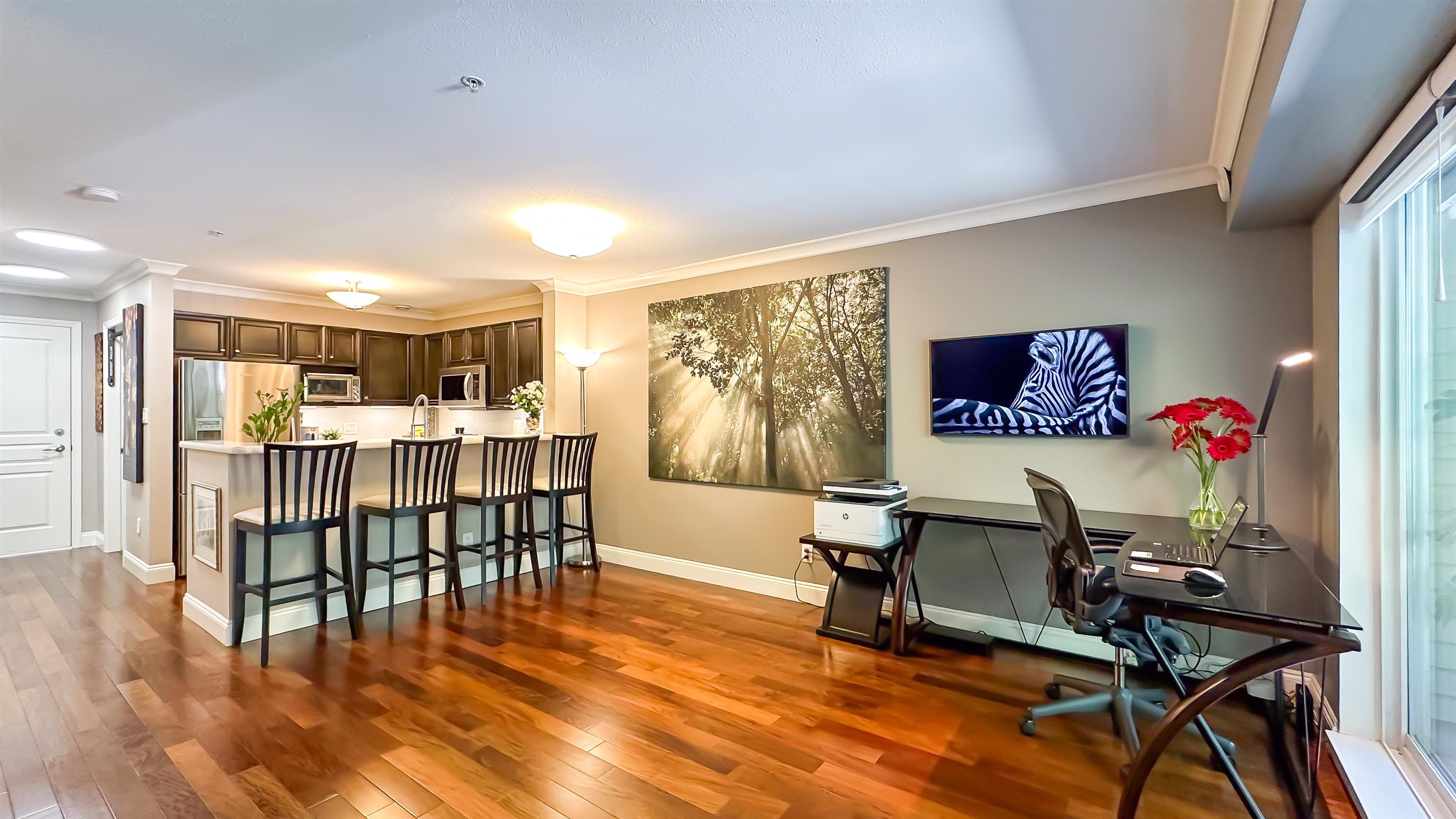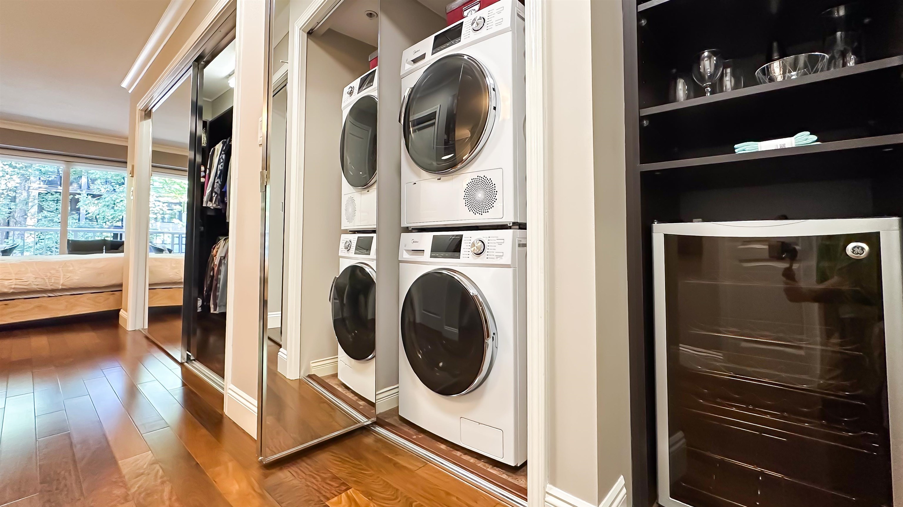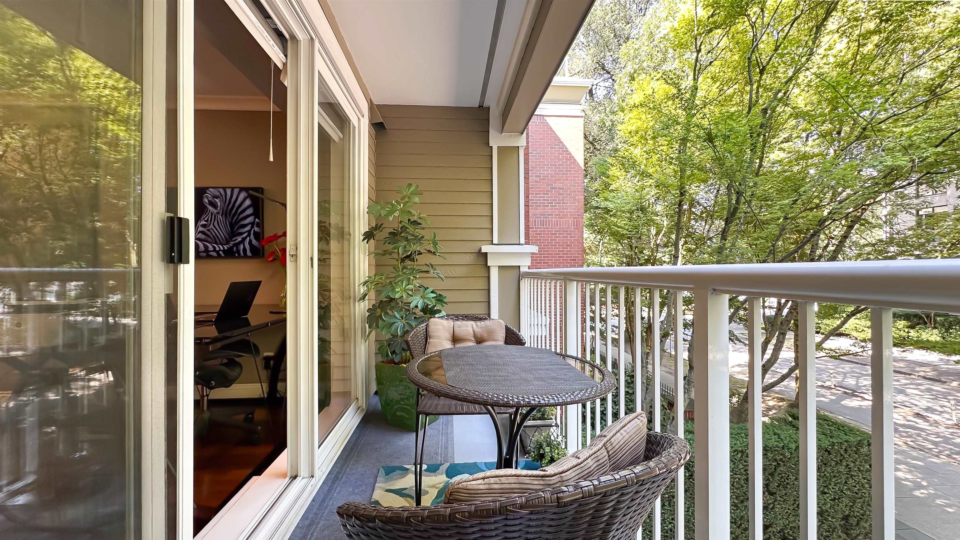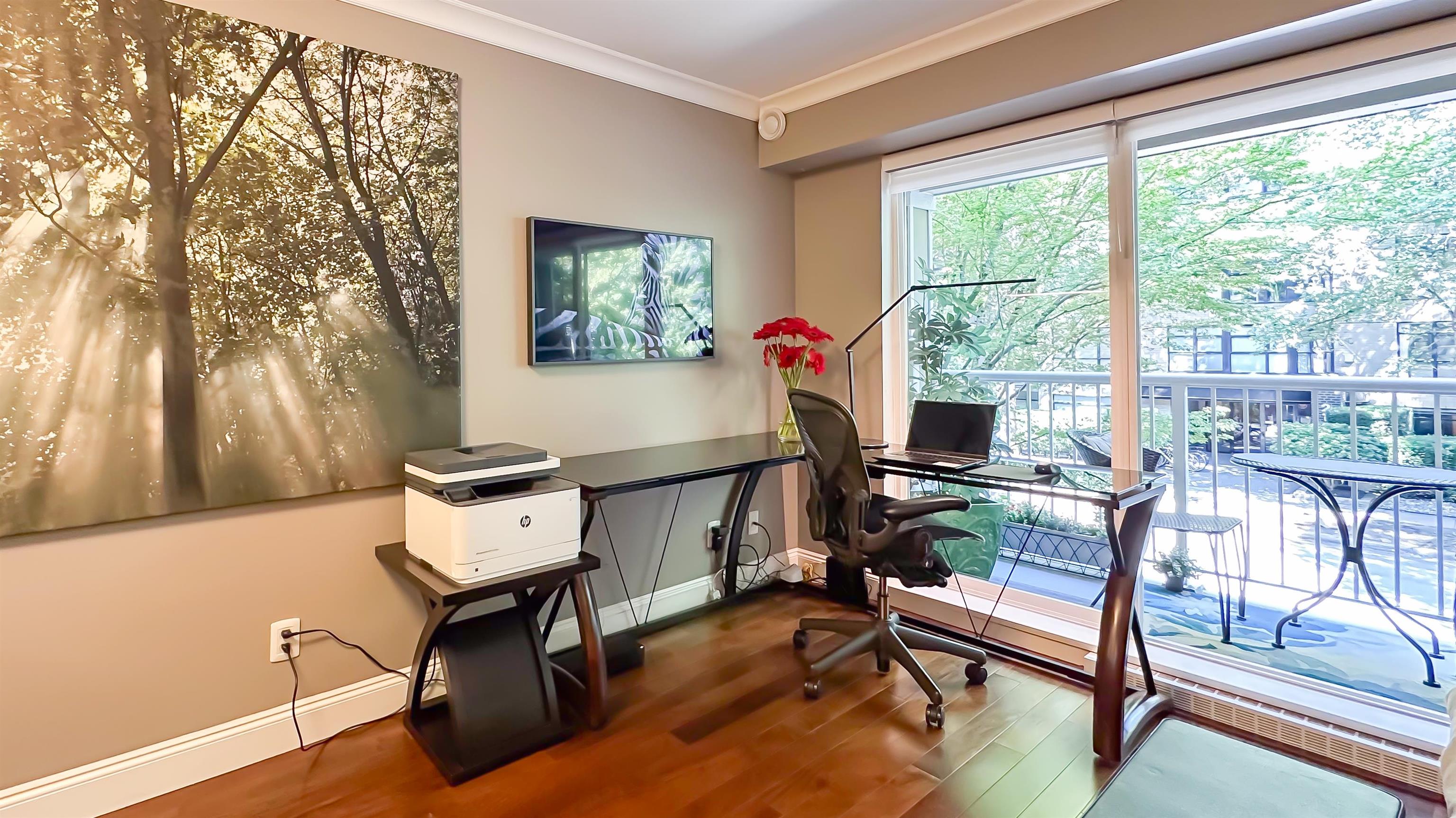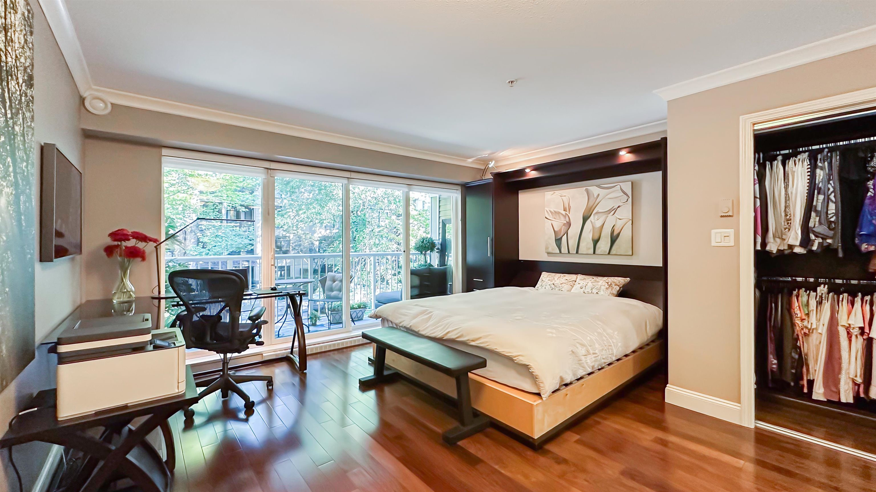 This is a Must-See! Stylish, immaculate feature-rich studio in prime Arbutus Walk! Designed for function and comfort, this unique space lives larger than its sqft indicates. Enjoy a 70sf covered balcony, bright floor-to-ceiling windows, open layout w/custom kingsize wall bed, built-in Samsung Frame TV and even a walk-in closet with extra storage! Updated kitchen boasts premium appliances & quartz counters. Other upgrades incl real Brazilian Walnut hdwd floor, radiant heated bath floors, Hunter Douglas blind...