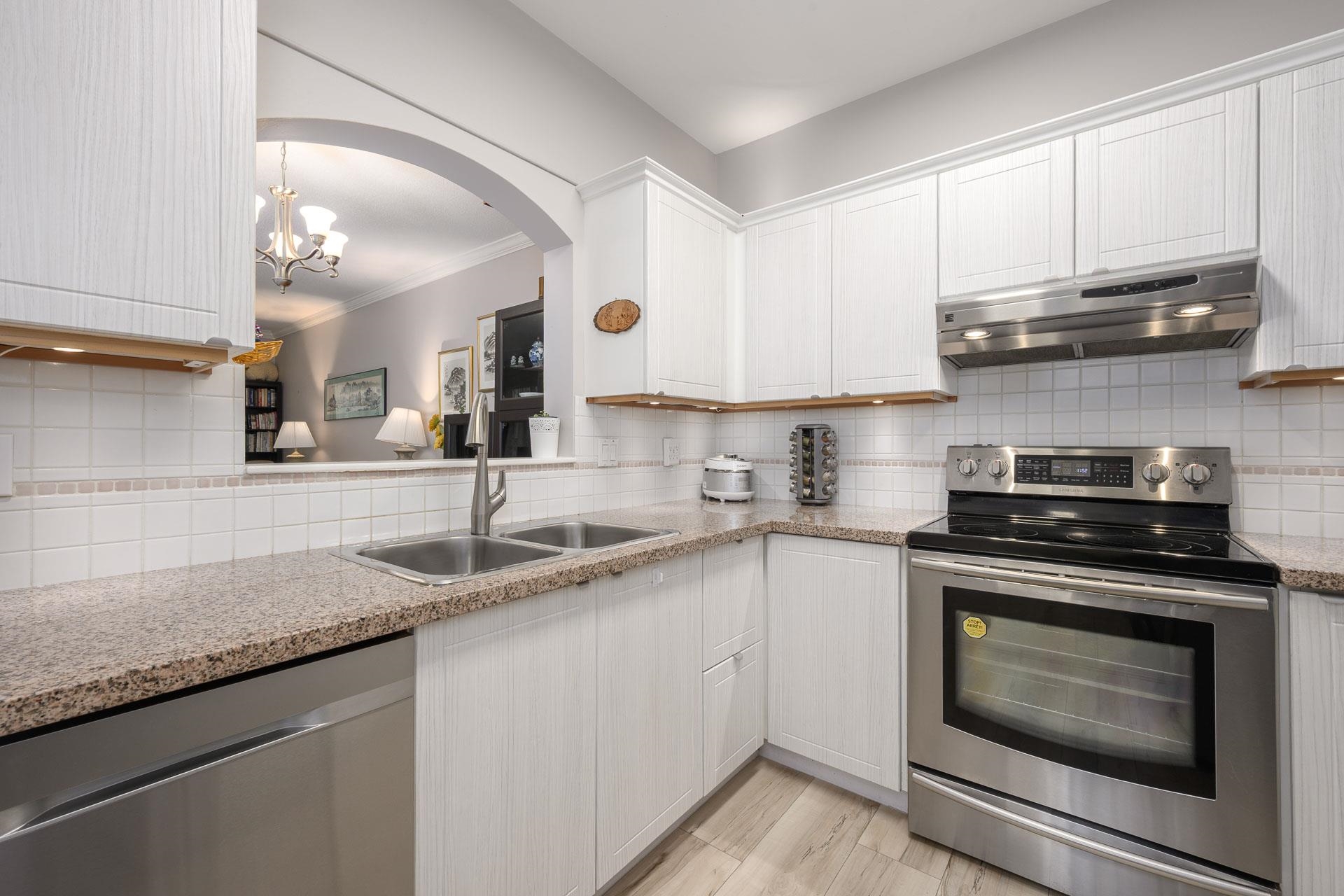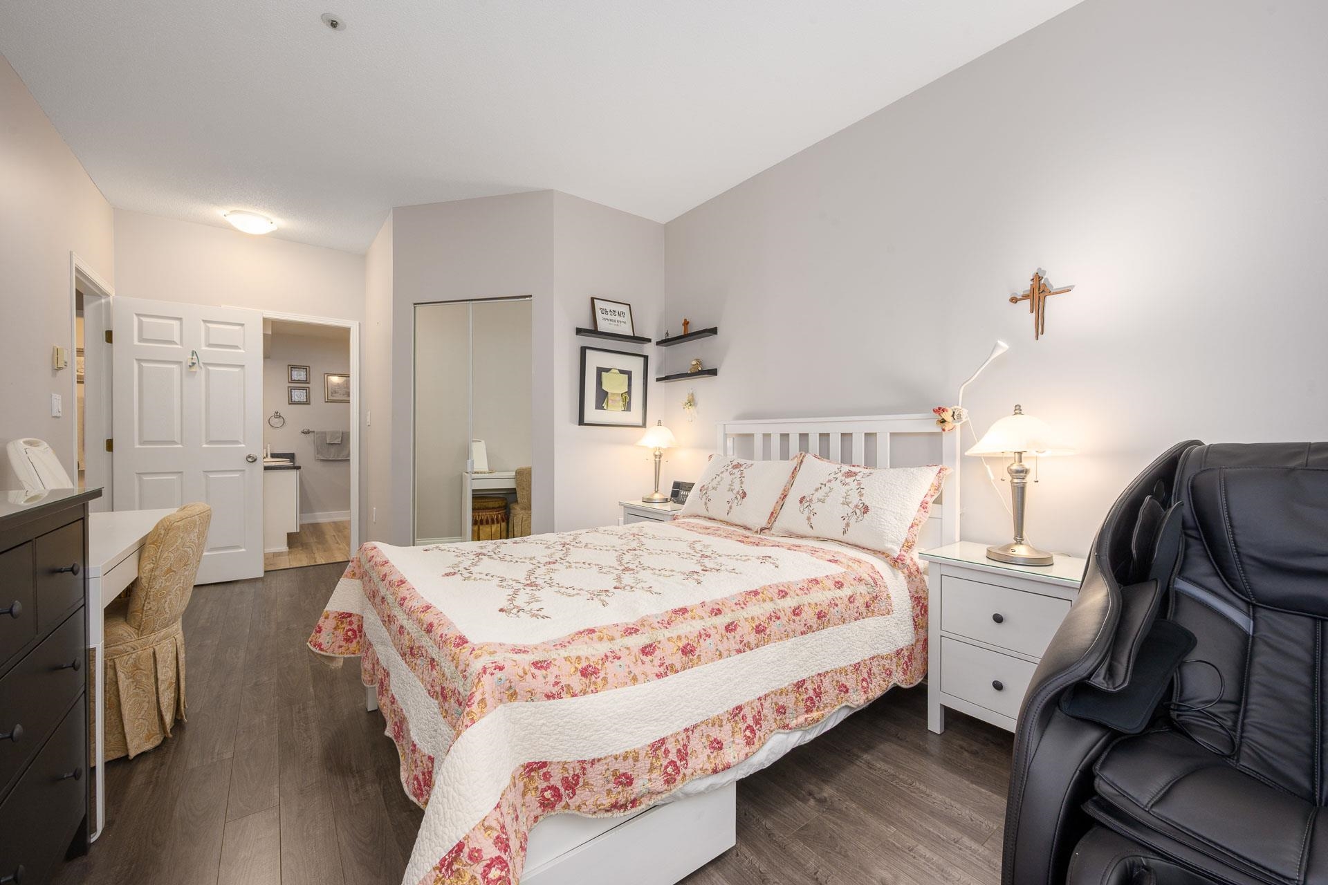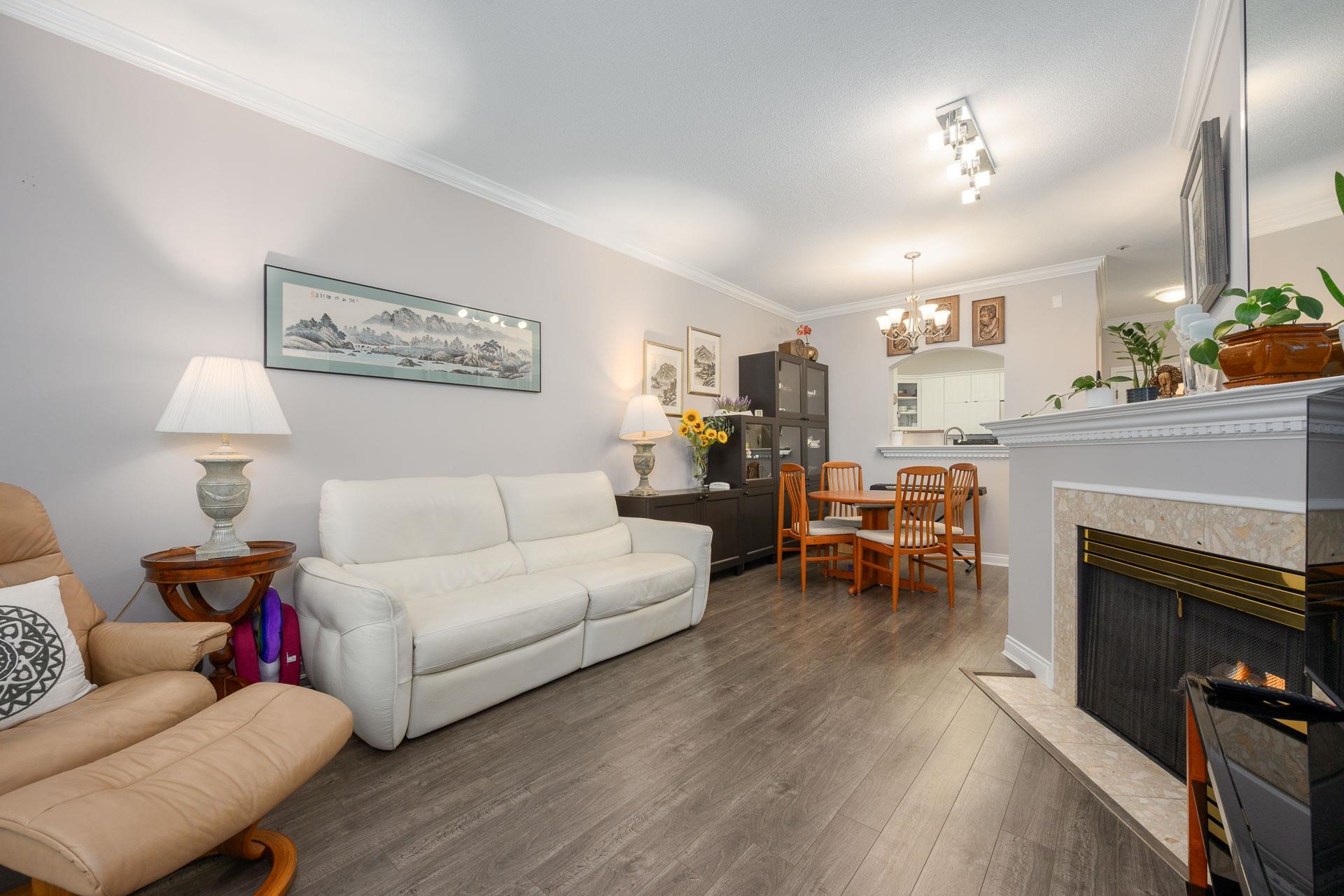 Beautifully bright renovated 2 bed, 2 bath home with 9’ ceilings and hot water radiant floor heating in a vibrant 55+ community. Move-in ready with brand-new kitchen, bathrooms, laminate flooring throughout, fresh paint and crown moulding. Enjoy private courtyard garden views, gas fireplace, and two spacious bedrooms. In-suite laundry with extra shelving. Strata fee includes heat & hot water. Resort-style amenities: indoor pool, fitness centre, clubhouse, guest suites, library & workshop. 1 parking + 1 lock...