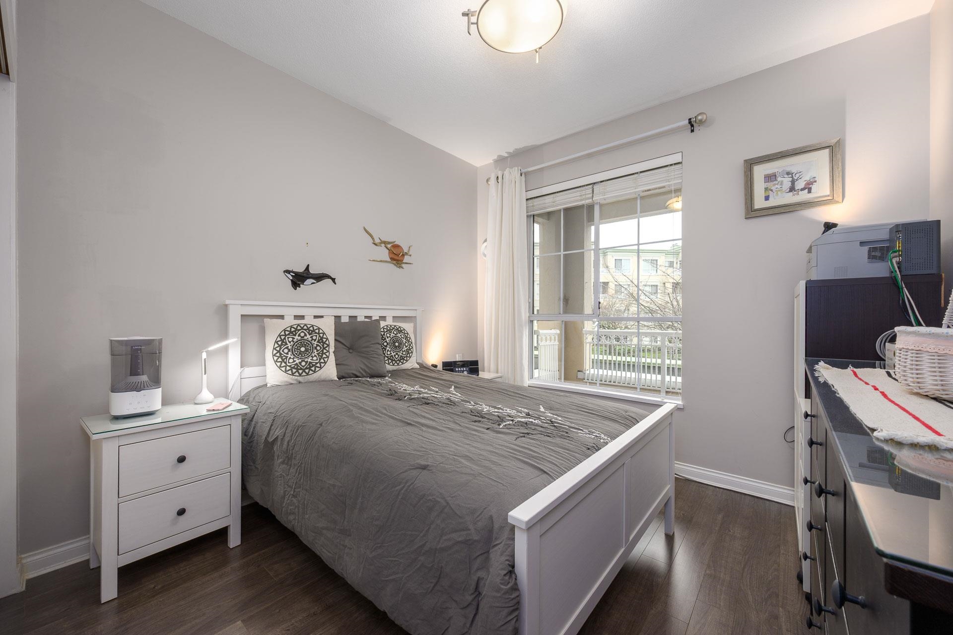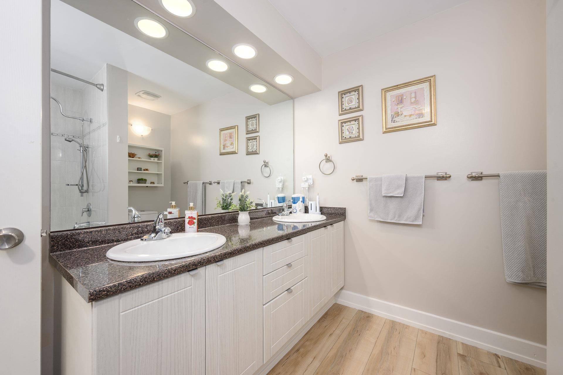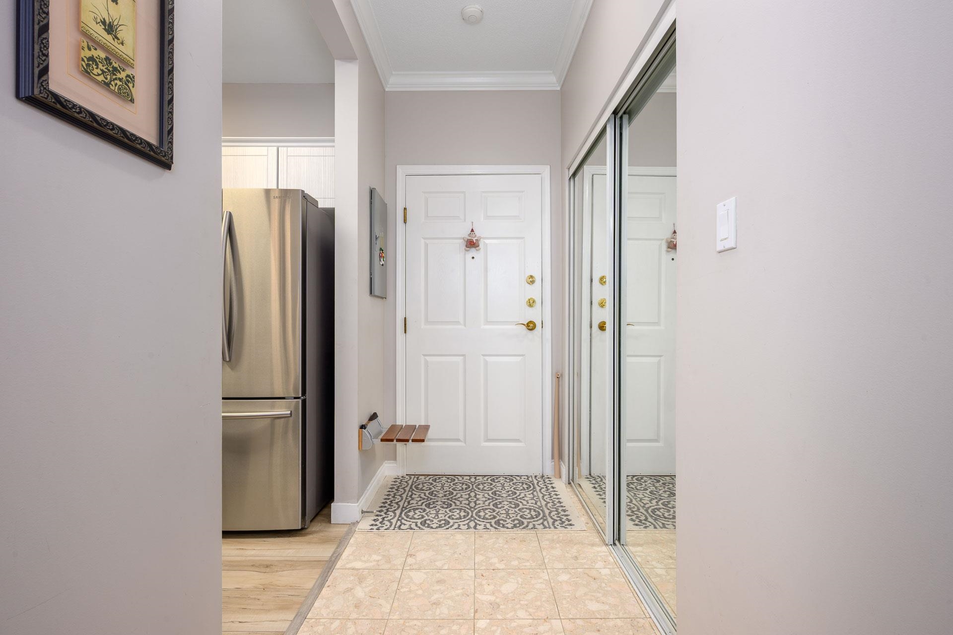 Beautifully bright renovated 2 bed, 2 bath home with 9’ ceilings and hot water radiant floor heating in a vibrant 55+ community. Move-in ready with brand-new kitchen, bathrooms, laminate flooring throughout, fresh paint and crown moulding. Enjoy private courtyard garden views, gas fireplace, and two spacious bedrooms. In-suite laundry with extra shelving. Strata fee includes heat & hot water. Resort-style amenities: indoor pool, fitness centre, clubhouse, guest suites, library & workshop. 1 parking + 1 lock...