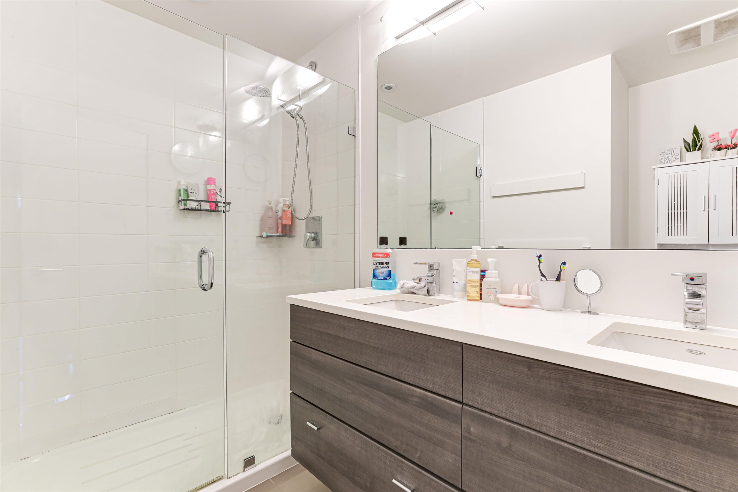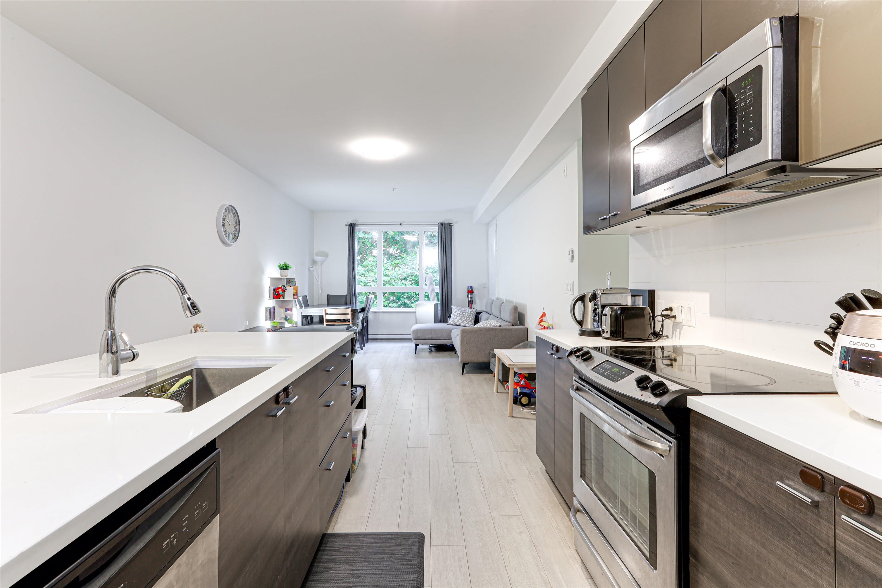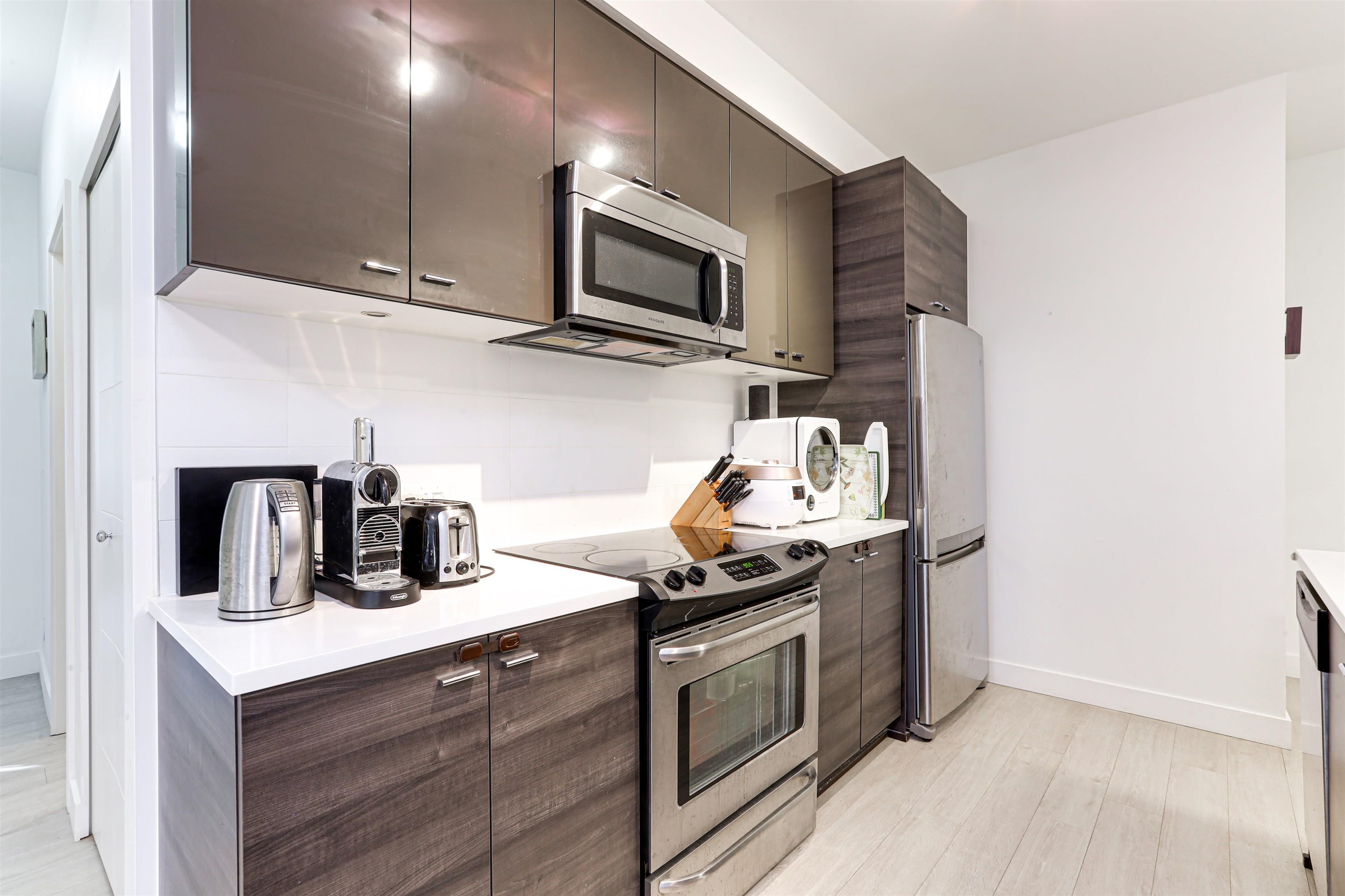 Welcome to Verve – Where Location Meets Lifestyle! Steps from King George SkyTrain, SFU, Future UBC, Surrey Memorial Hospital, and Central City. This bright 2 bed, 2 bath corner unit offers over 1,000 sq.ft. with fresh paint, upgraded laminate flooring, and a modern kitchen featuring quartz counters, stainless steel appliances, and a large breakfast bar. Enjoy southeast-facing windows, a quiet patio with treed outlook, 9ft ceilings, in-suite laundry, storage locker, and tandem parking. Amenities: gym, yoga ...