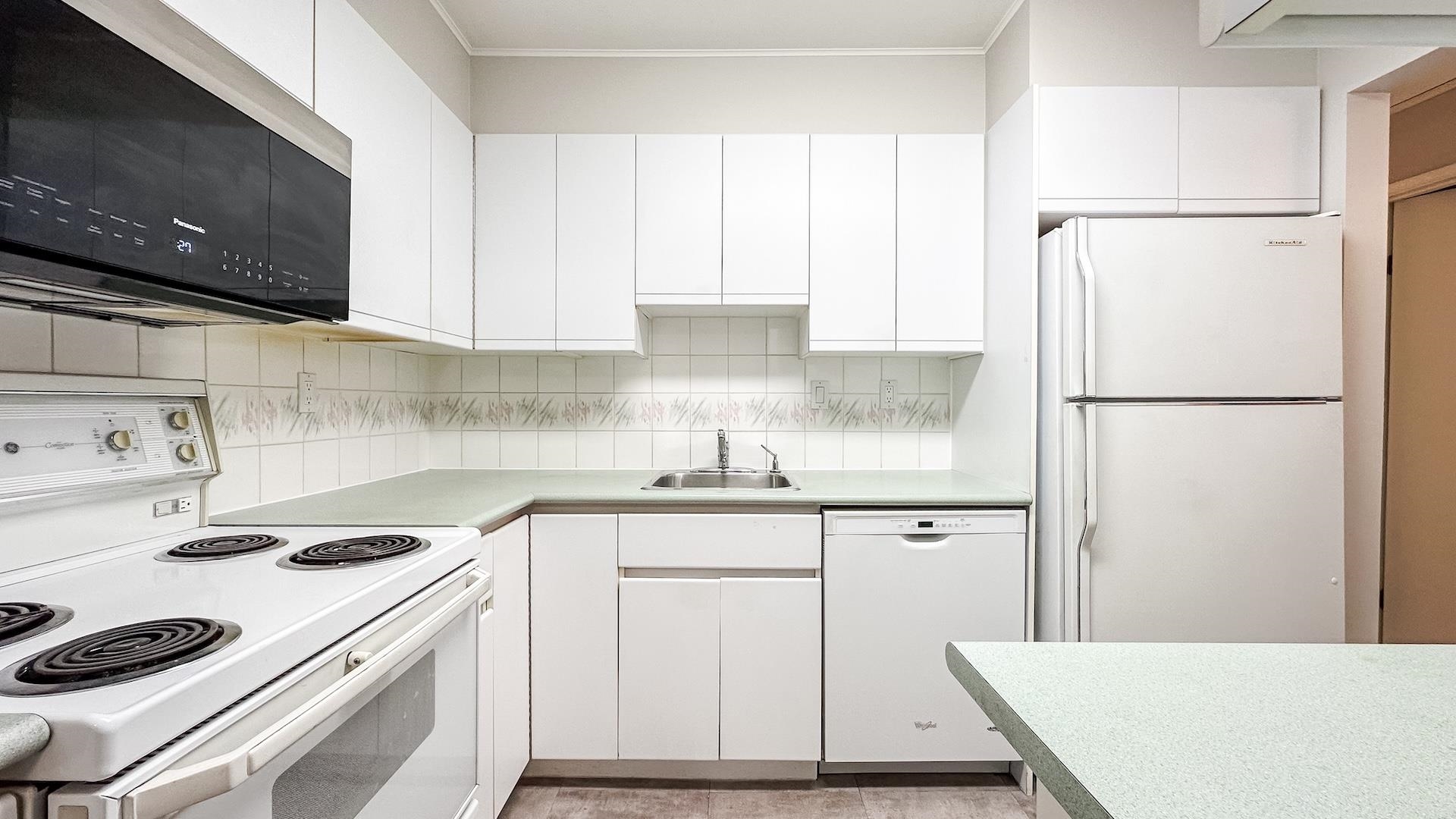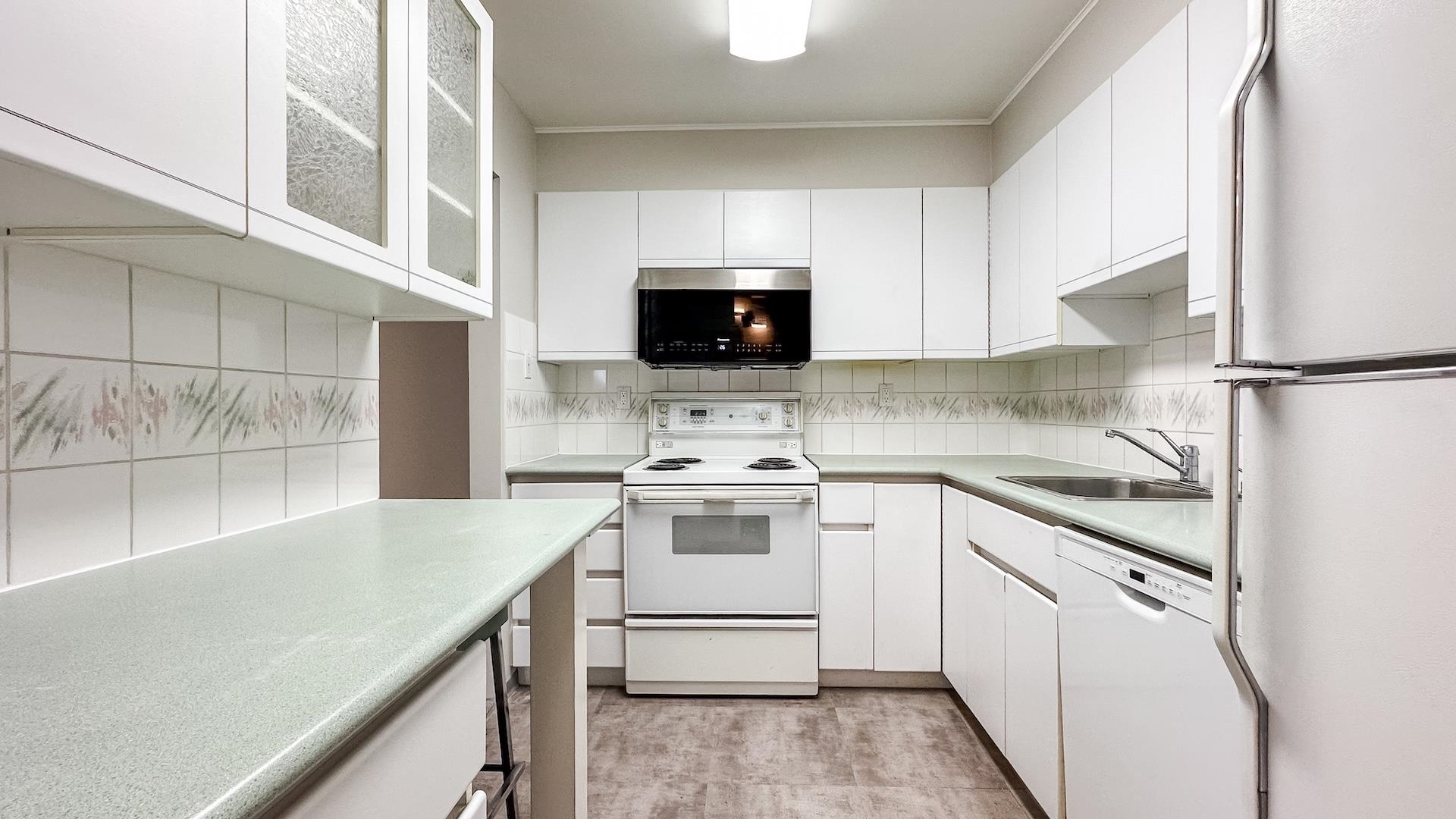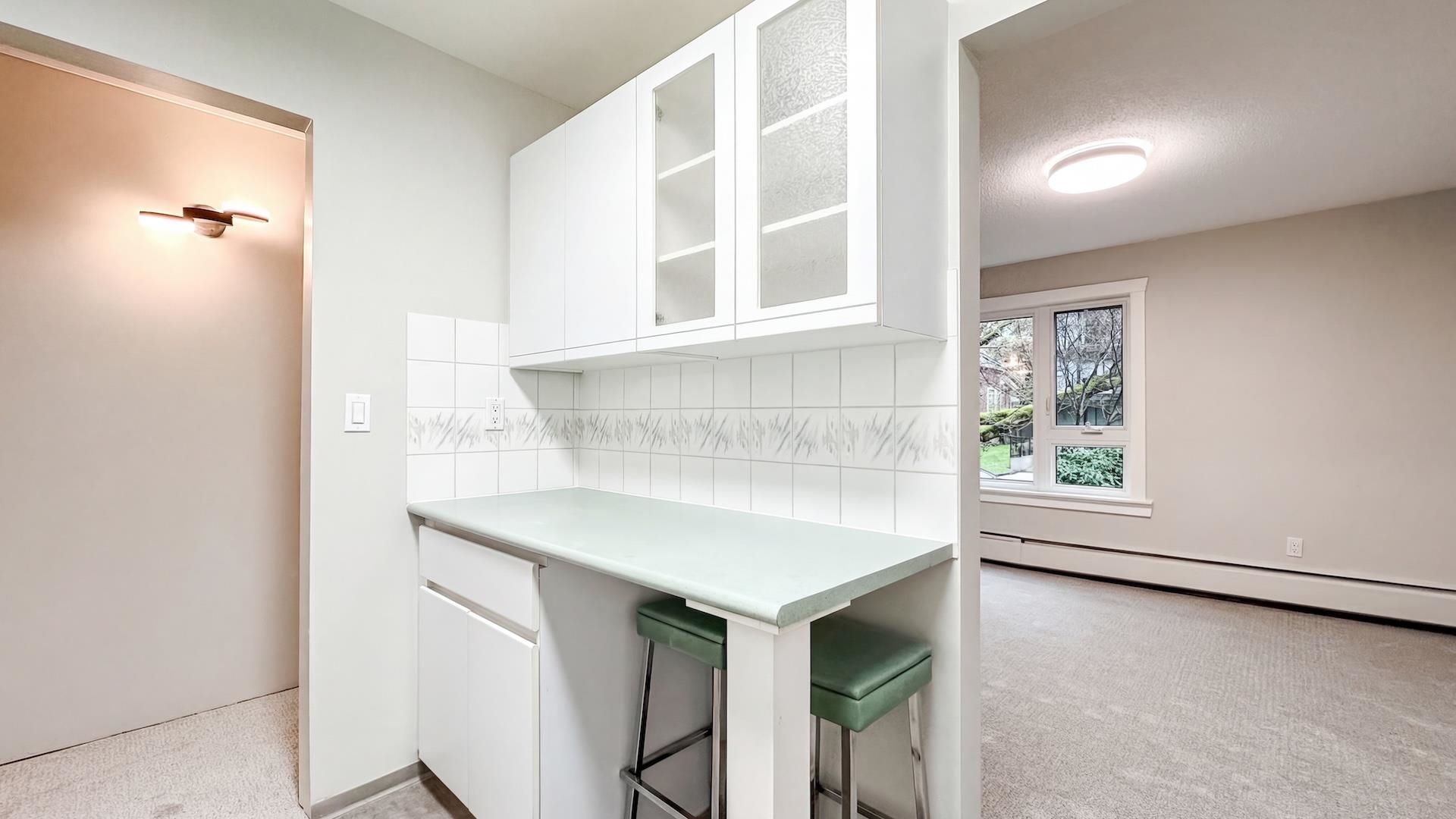 Recently refreshed with new carpet, paint and lighting. North of 4th Avenue 2-bed, 1 bath corner suite offers bright spacious rooms, ample closets, in-suite laundry and covered balcony. Amazing location close to the beach, shops and restaurants. Well-cared for building with proactive strata is rain-screened, newer roof membrane, elevator upgraded. Some photos are virtually staged. 1 underground parking, storage locker, u/g visitor parking, bike lock up. Up to 2 dogs or cats - max weight of any pet 15kg. OPE...