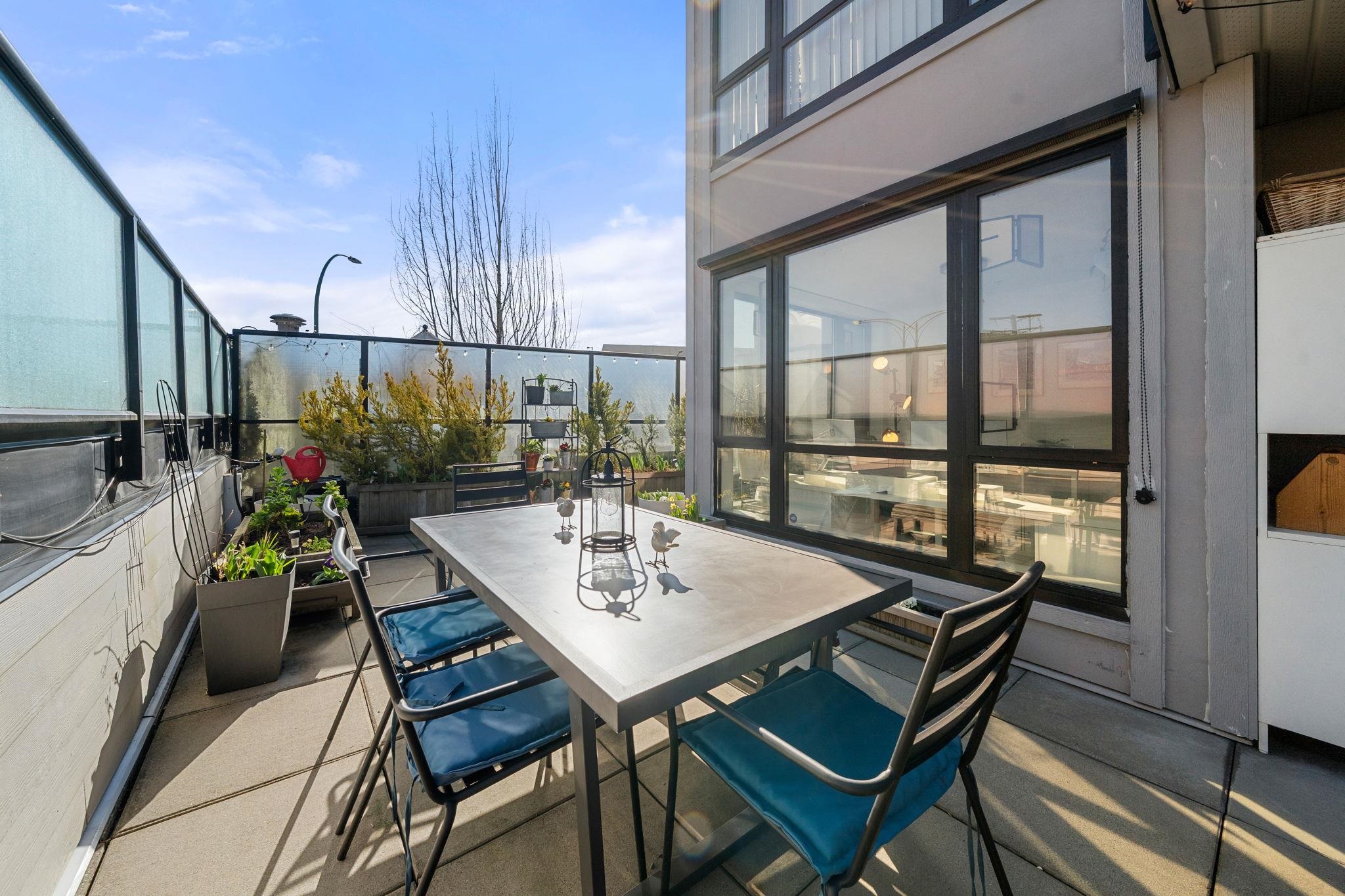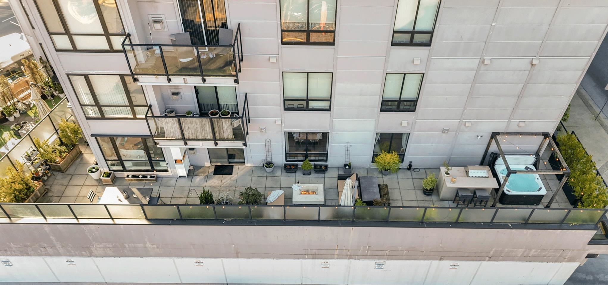 The perfect floorplan, truly one of a kind. This 2 bed + Den (or 3rd bedroom) spans the width of the building with window exposures North, East, and South. An expansive 1,013 sqrft interior and an incredible 999 sqrft private patio provide a townhome feel. Entertainers welcome; the patio boasts a HOT TUB, built-in BBQ and fridge, with bar seating and space for endless plants and gardening. The kitchen features stone counters, stainless steal appliances, new tile backsplash and a gas range. Relax at the fire...