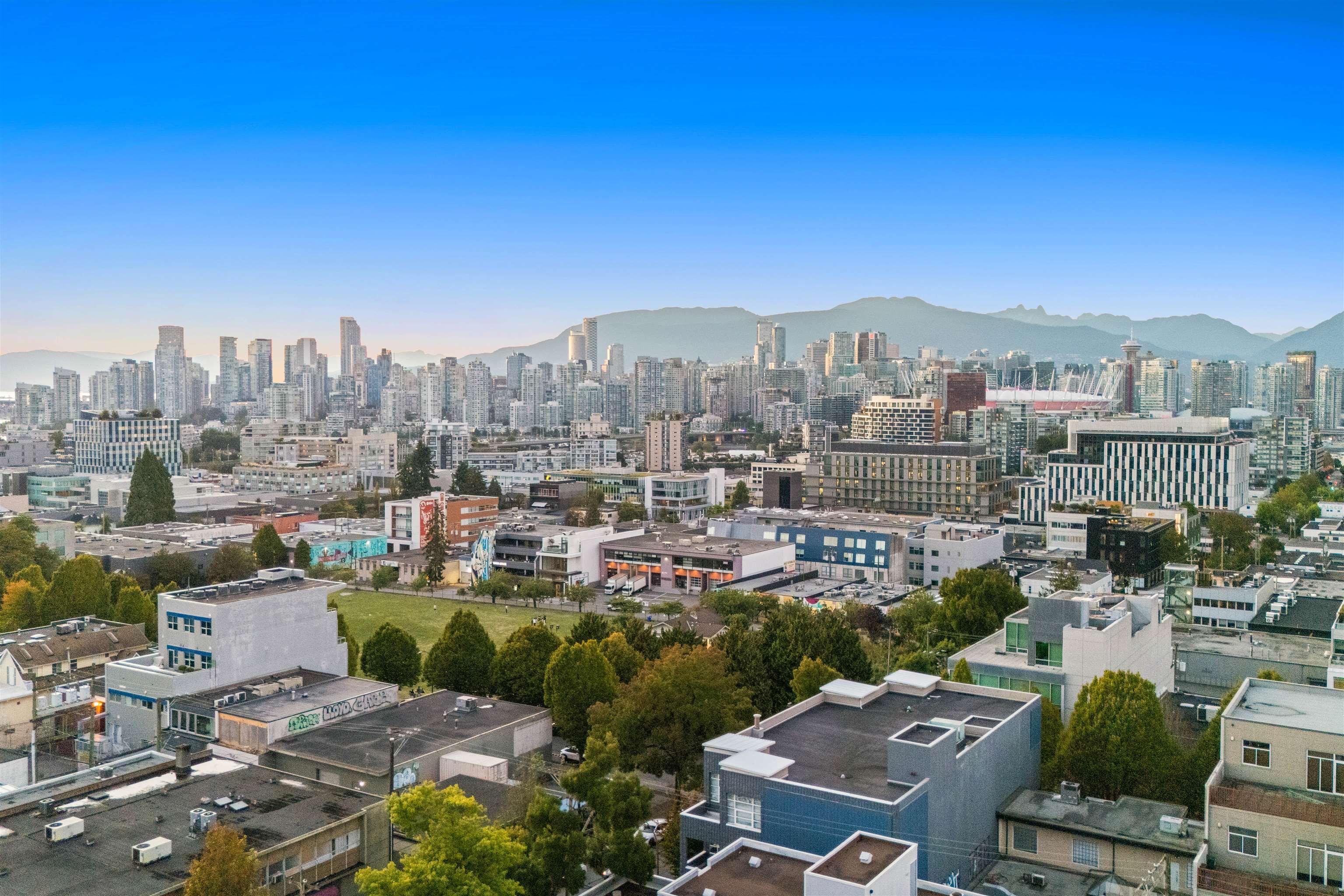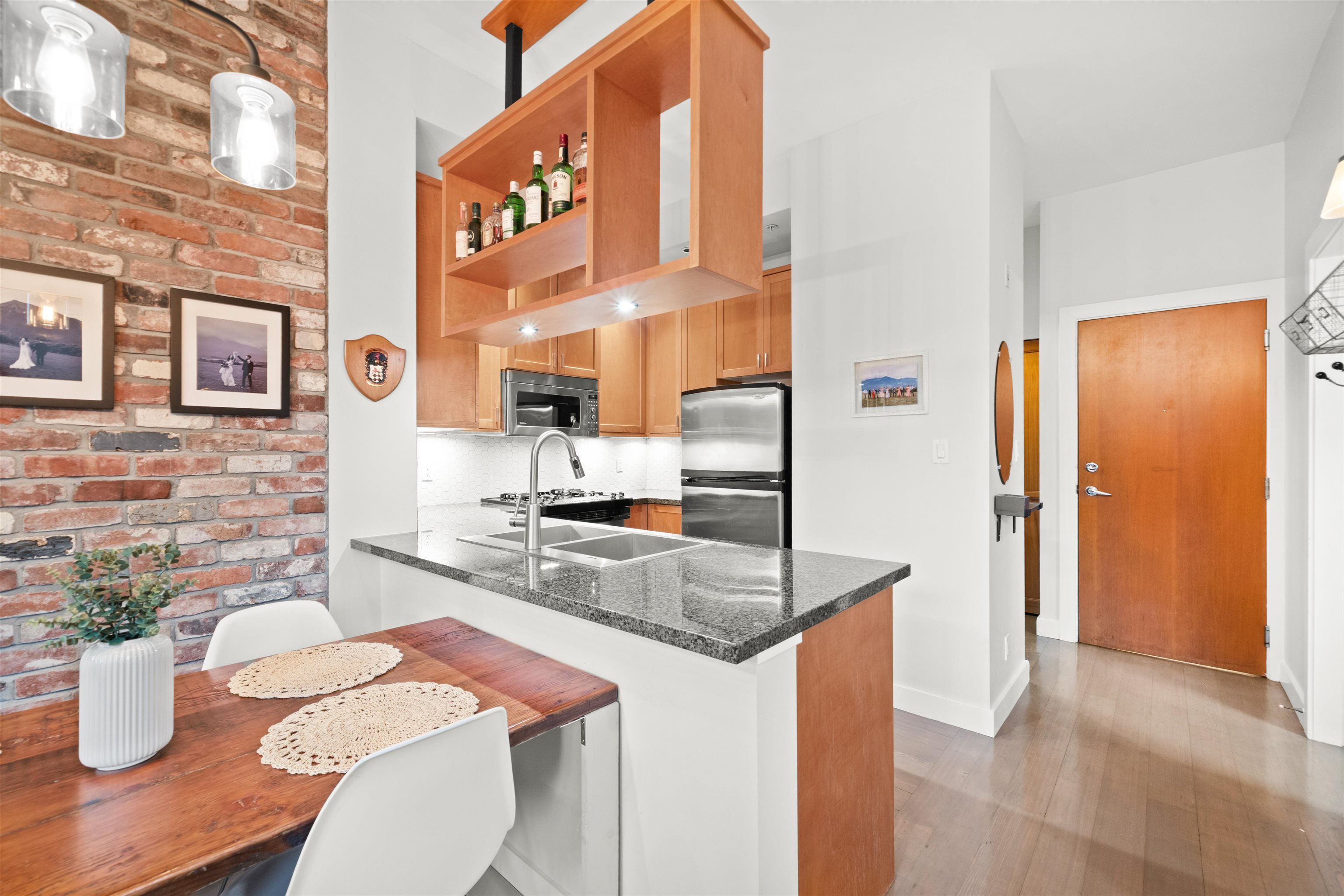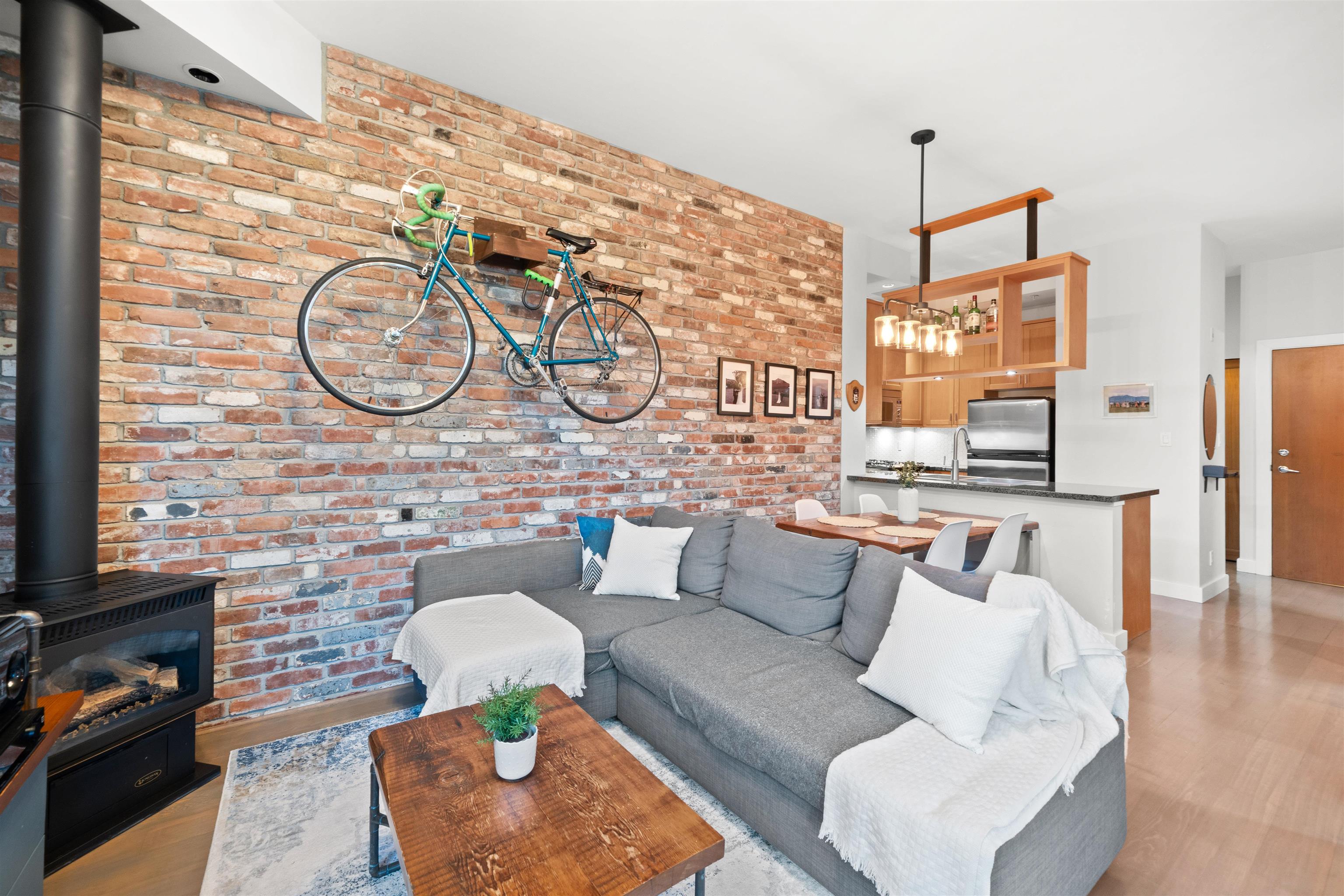 The Elements is a boutique concrete building in the heart of Mount Pleasant. This bright 1 bedroom and den home features 10 foot ceilings, hardwood floors, exposed brick, and a rare 300 square foot private patio with stunning city and mountain views. The layout is efficient with a spacious den, in-suite laundry, generous in-unit storage, and one secured parking stall. Just steps from cafes, transit, breweries, and Olympic Village. A perfect blend of character, solid construction, and lifestyle location.