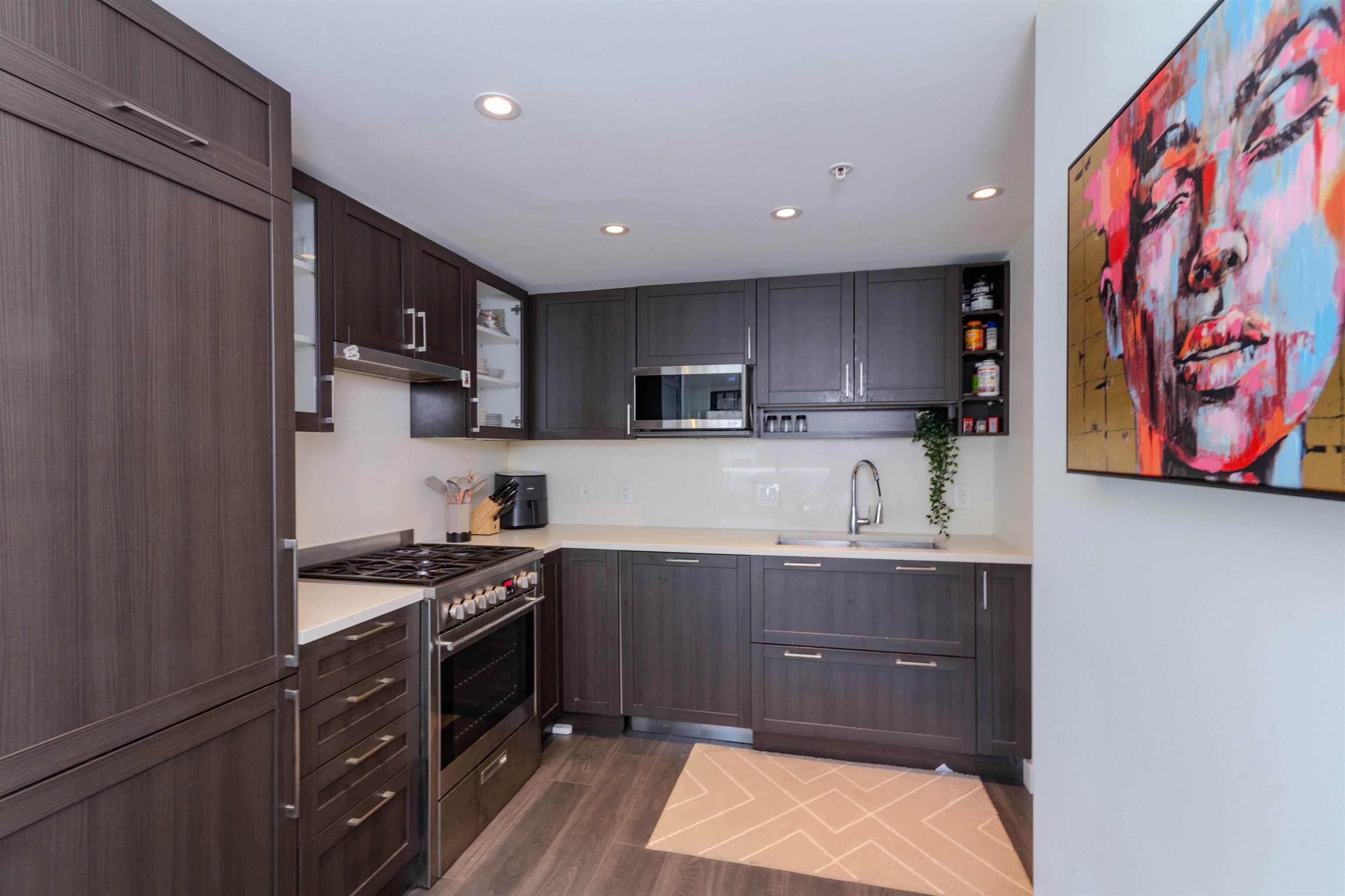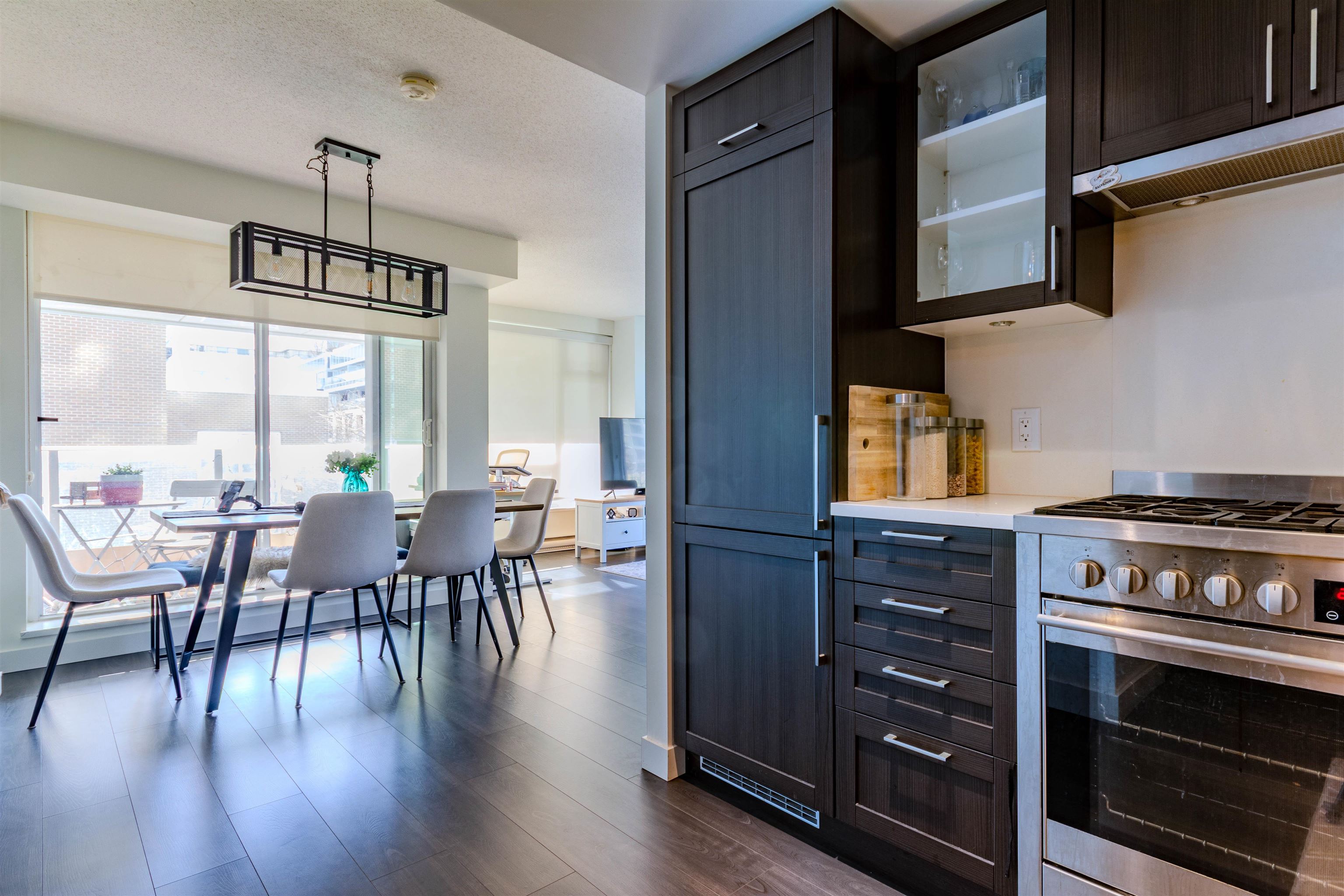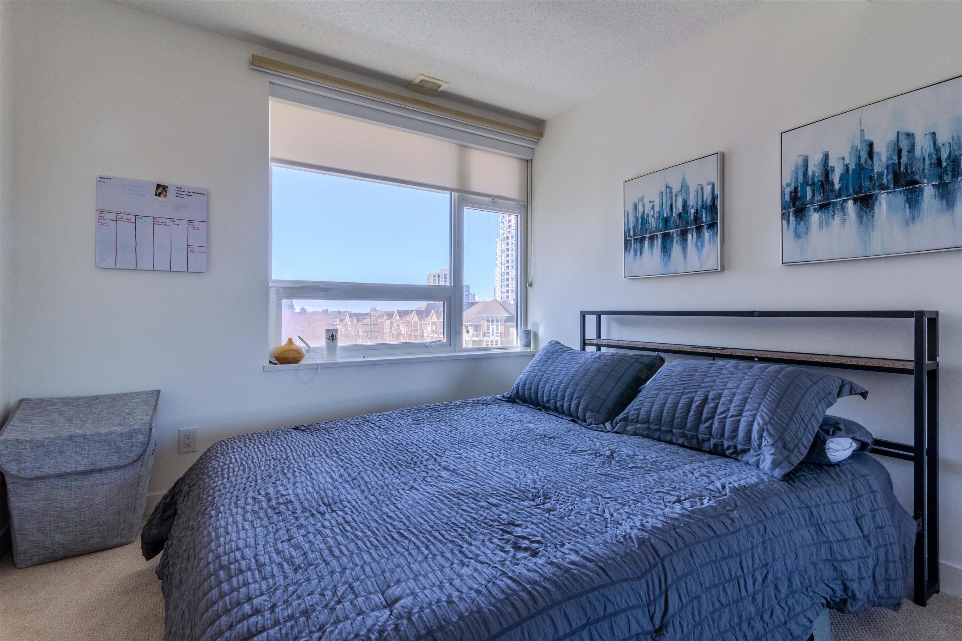 Welcome to Wall Centre Central Park! This modern 2 bedroom plus Den + 1 bath corner unit home boast 761SF of living space with SW facing corner windows. Premium kitchen has integrated walnut-panel appliances (fridge and dishwasher) framing white quartz countertops. Patio and Dining room flows nicely into living room with a bright living area that is surrounded by large corner windows. 2 non-adjacent bedrooms and den provide a sense of privacy - perfect for both relaxing and working from home. Enjoy resort ...