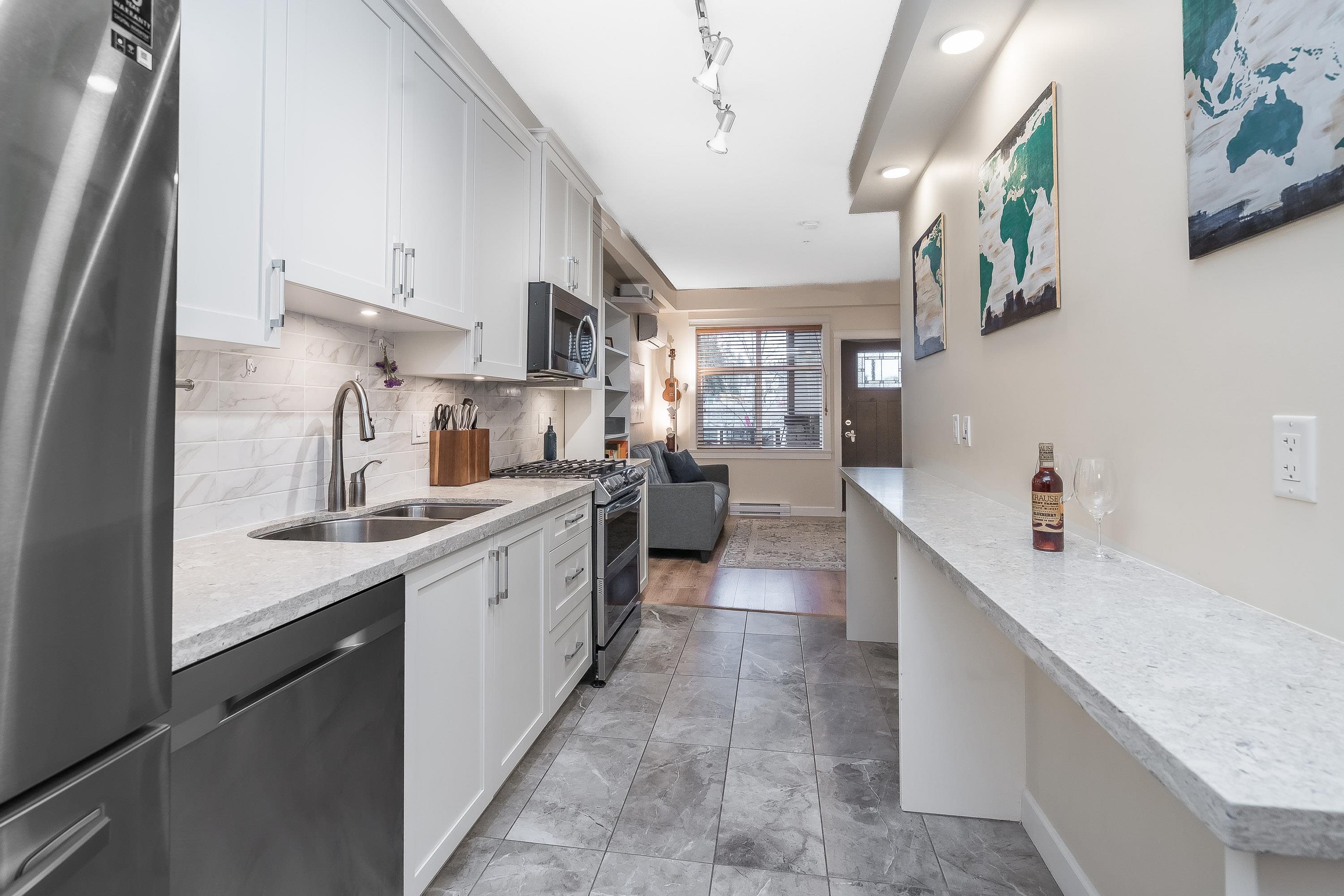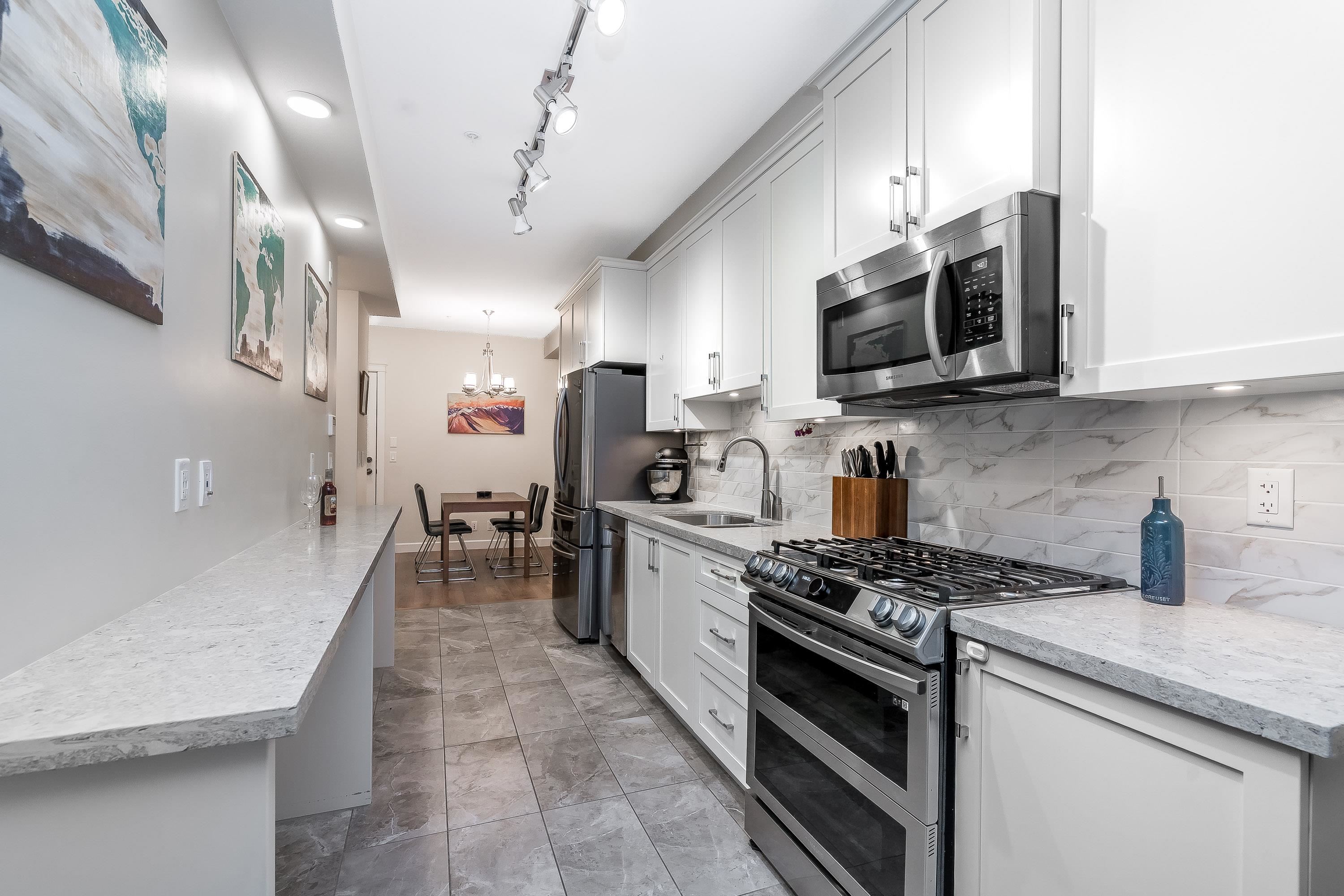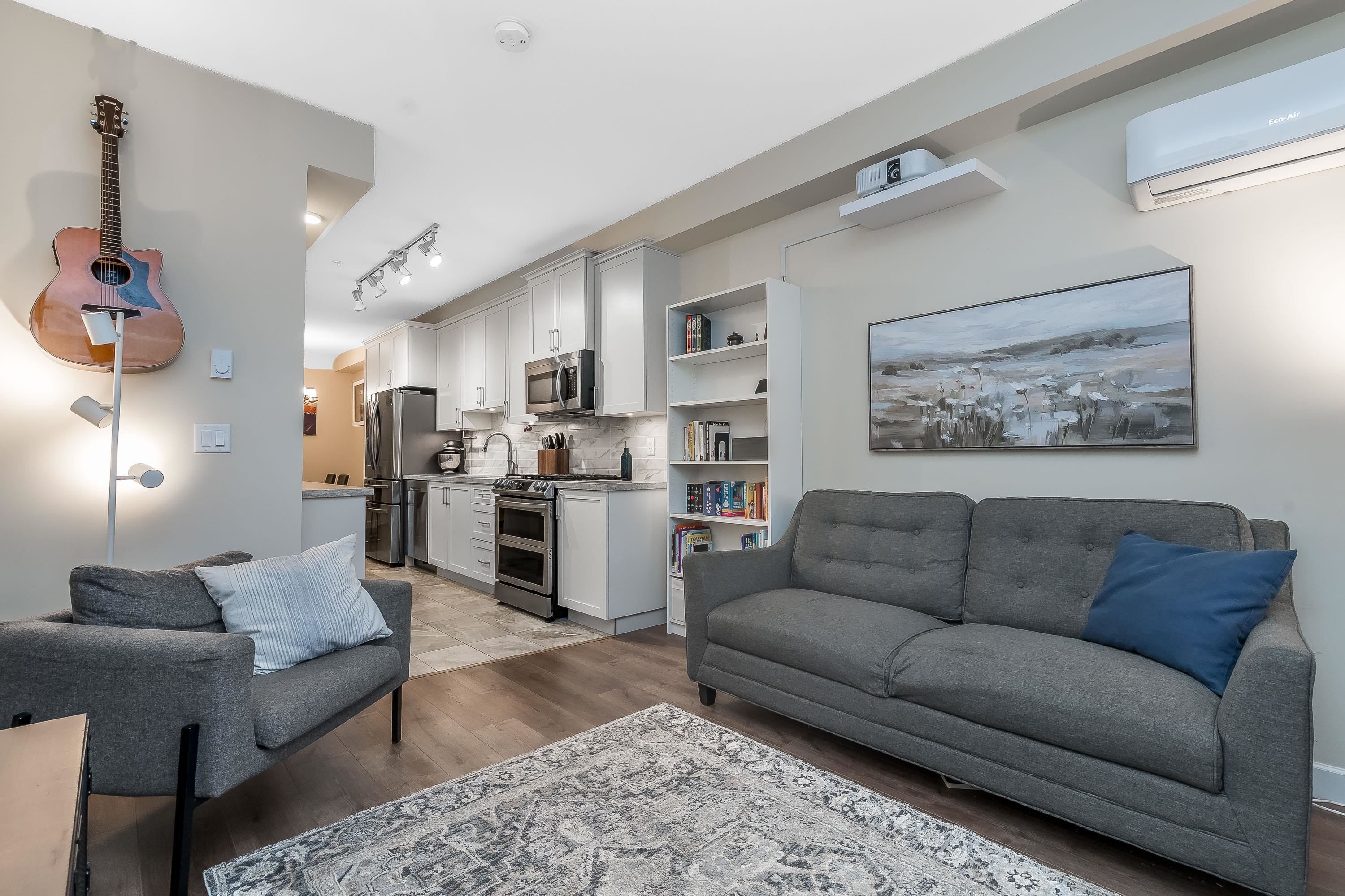 Wow, this is a rare find! Its more like a townhouse than a Condo. Your own door onto a peaceful deck, with direct access to street parking. Inside you have two floors both with 9 foot ceilings, upstairs you have a bright south facing living room, kitchen and dining room, down stairs you have an outdoor patio and two bedrooms and a washroom with heated floors and "Rain" shower. Each level is air- conditioned and is in excellent condition. The Kitchen comes with Wi-fi appliances and you have a gas range with ...