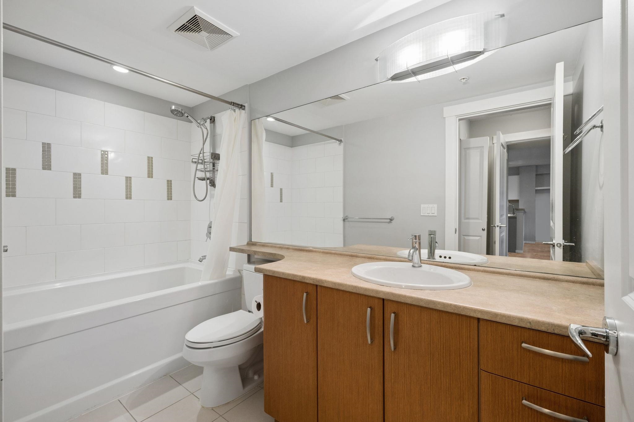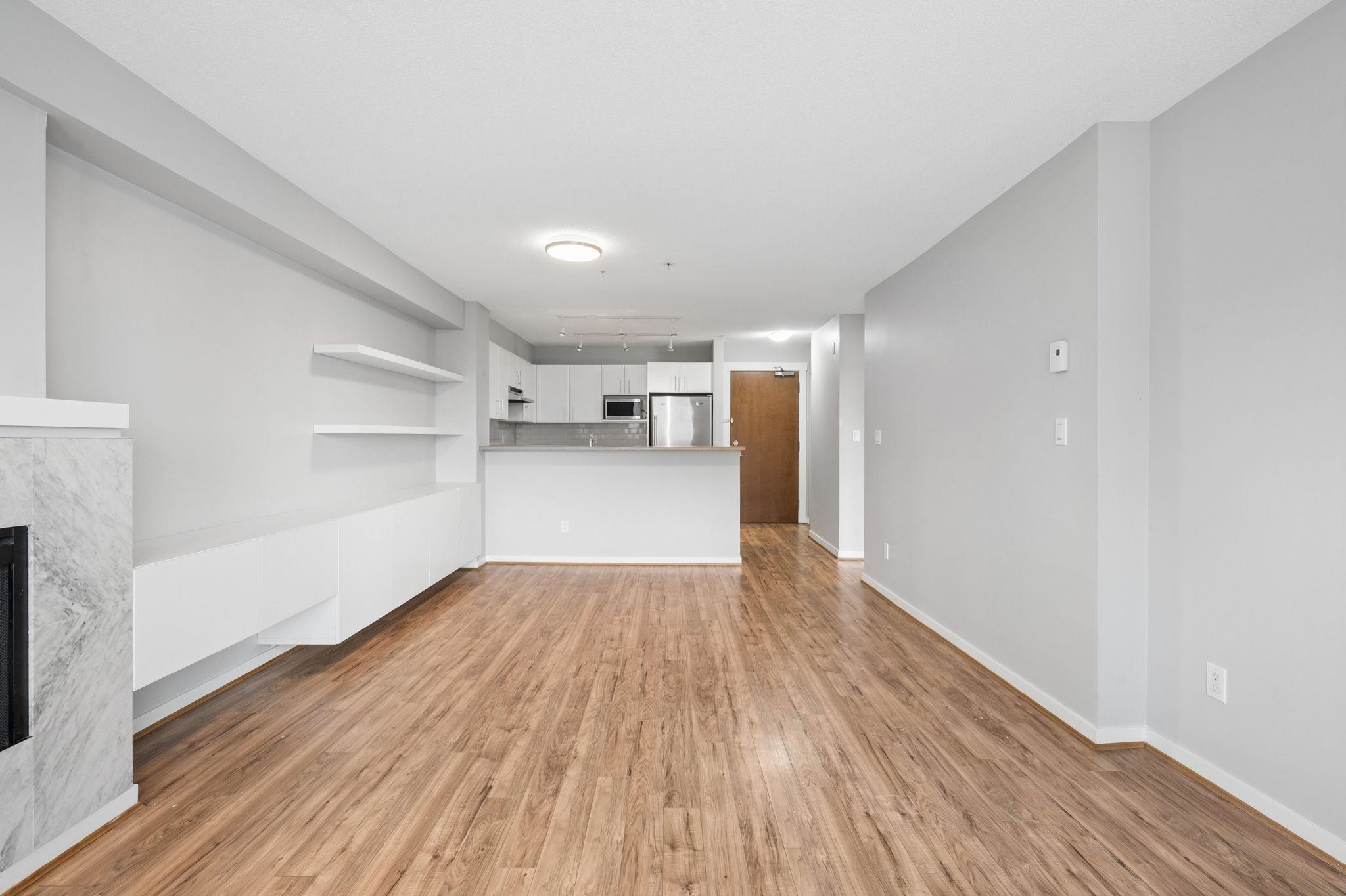 Welcome to Collage built by Polygon located in desirable & convenient Brentwood! - BRIGHT south facing, & UPDATED 2 bed 2 full bath on the quiet side of bldg & Dawson St. Updates include: fresh paint, laminate floors, custom shelving, marble fireplace surround, S/S fridge, gas range stove (3 months old), resurfaced cabinets, A/C unit, full size washer/dryer, and light fixtures. Very well kept - excellent floor plan offers a large dining & living area, primary bedroom has a full ensuite & walk in closet w/ b...