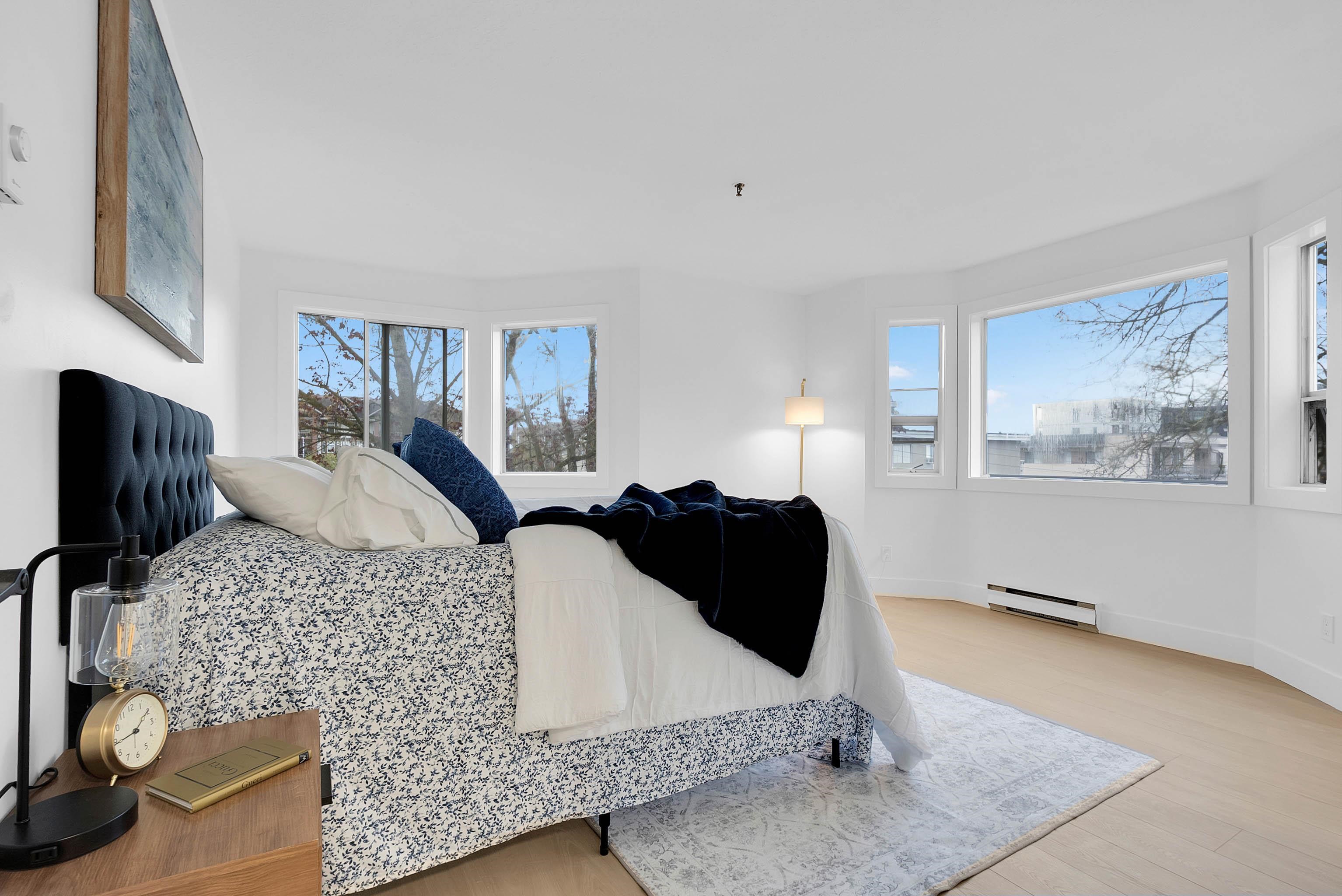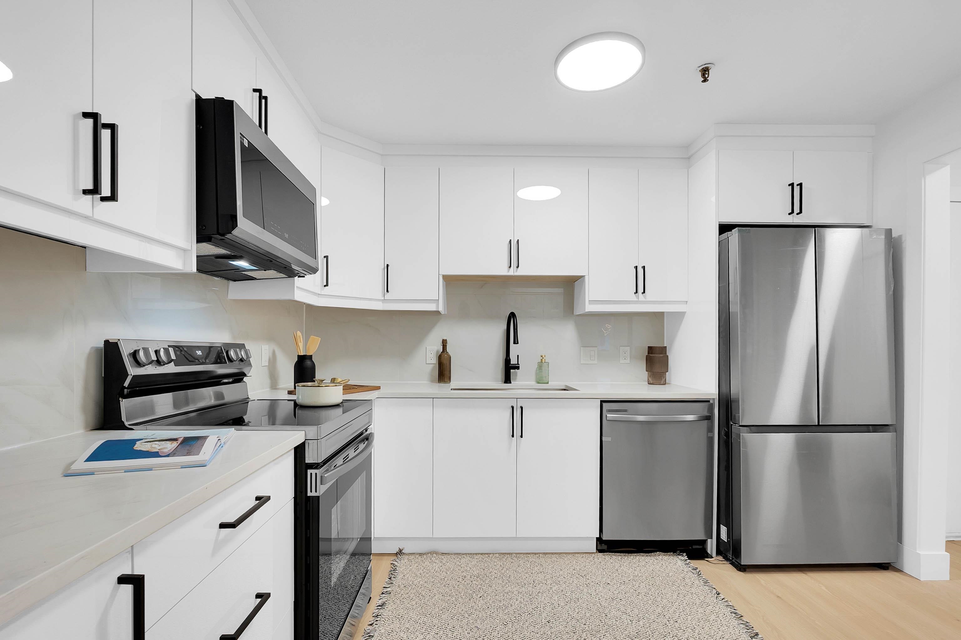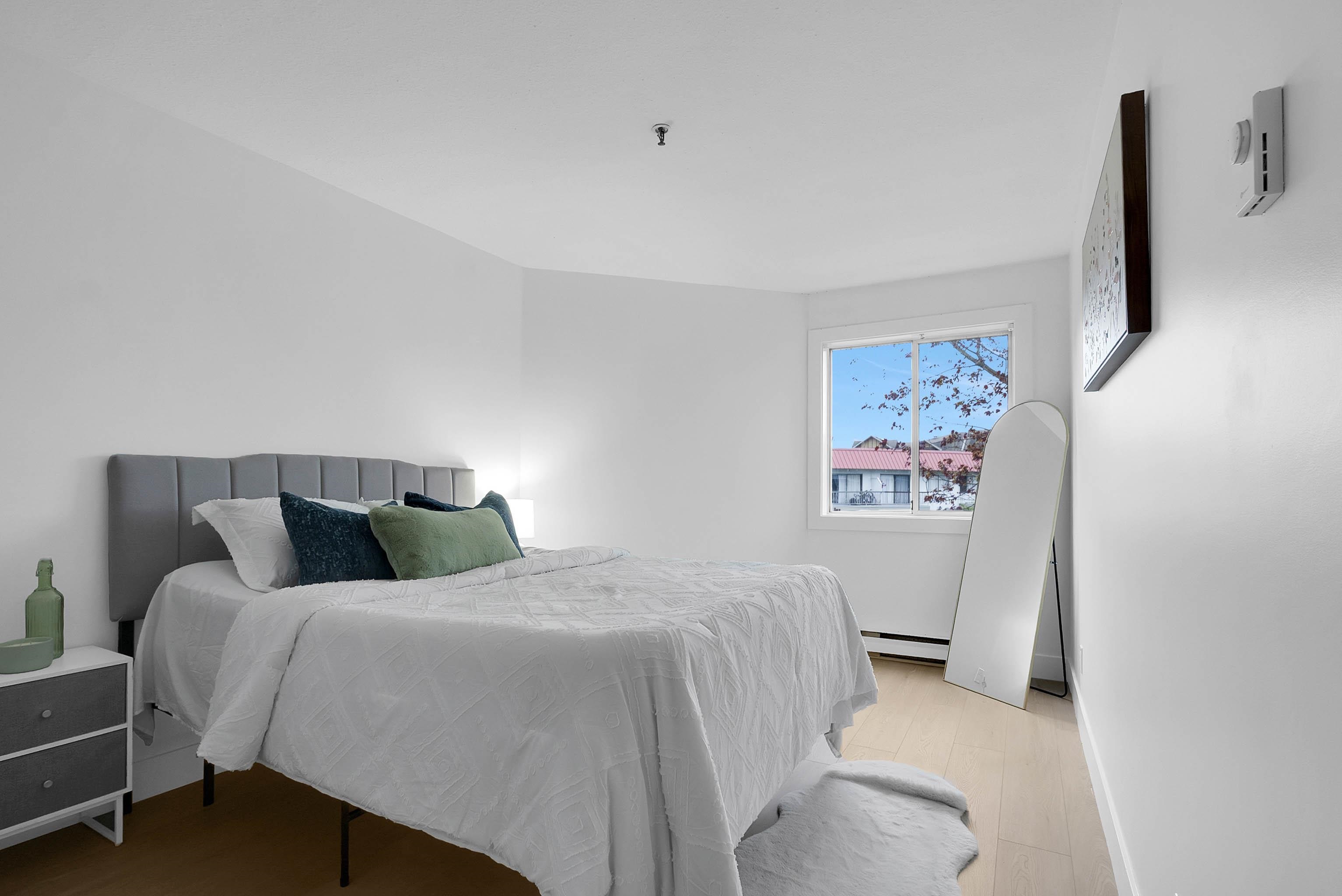 Bright and spacious 2 bed + den, 2 bath corner unit offering nearly 1,200 sq ft on a quiet dead-end street. Fully renovated and move-in ready with new flooring, fresh paint, new appliances, and modern updates throughout. Filled with natural light, this functional layout offers generous living space and a spacious kitchen. Oversized primary bedroom features double closets, plus a versatile den for office or flex space. Well-run proactive strata in a well-maintained building. Competitively priced in a peacefu...