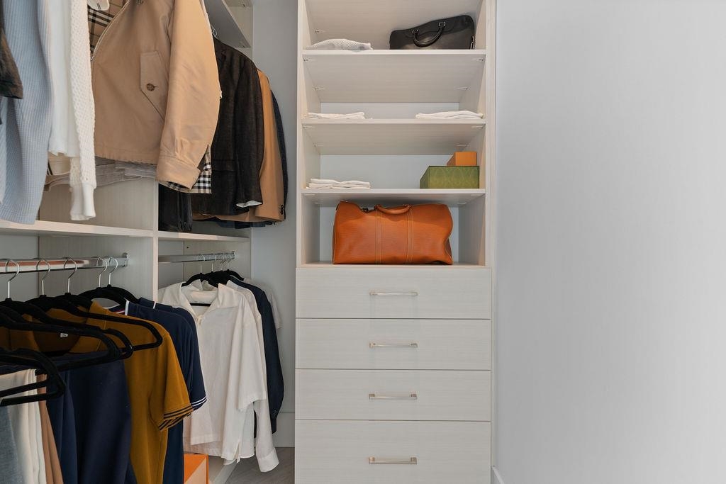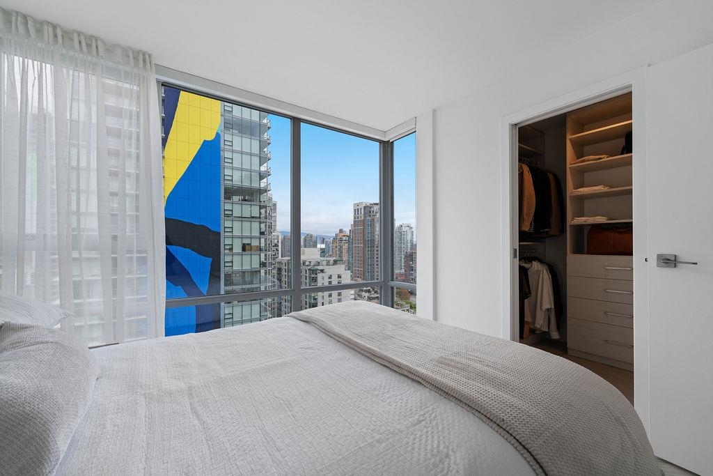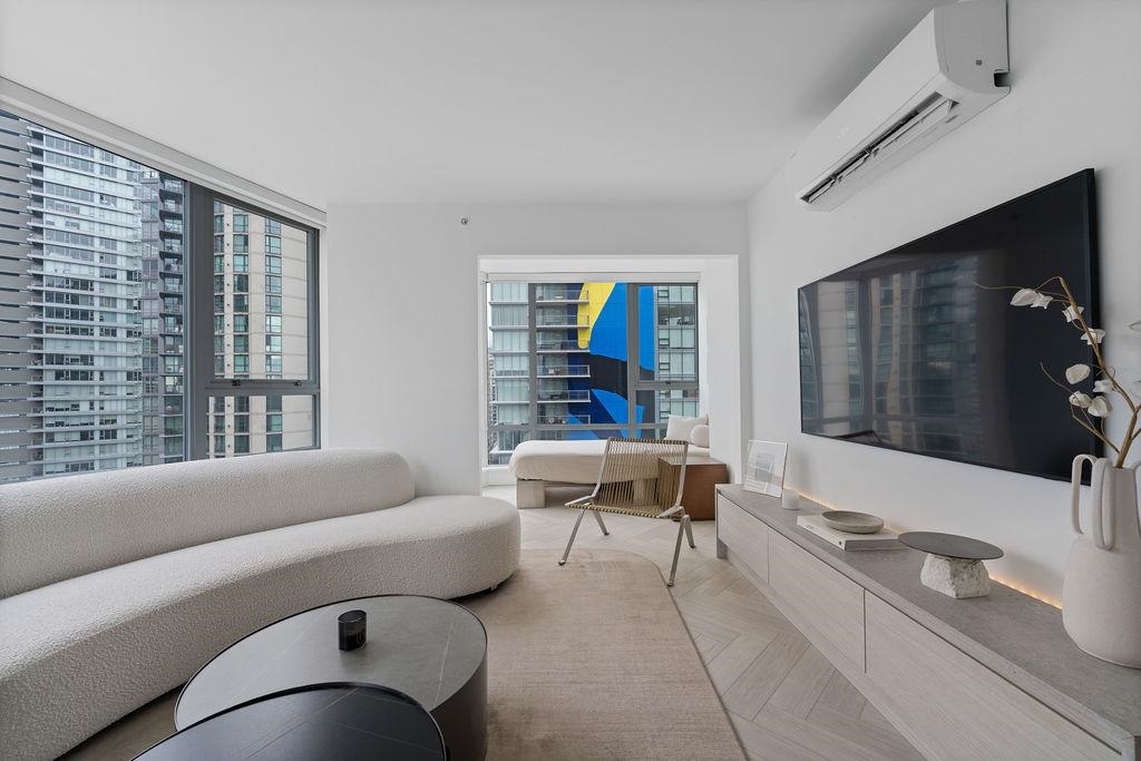 Custom renovated high-floor corner home at 'Azura 1'! Featuring permitted AC, a fantastic layout w/ flex + den, herringbone flooring, motorized blinds, & northwest exposure w/ city views. Extensive built-in millwork, ambient lighting & integrated speakers. Integrated fridge (water & ice) & dishwasher, AEG gas cooktop & oven, under counter microwave. Stone quartz counters/backsplash/waterfall & lounge-inspired banquette seating wraps into the dining area. Flex room off the kitchen is complete with built-in s...