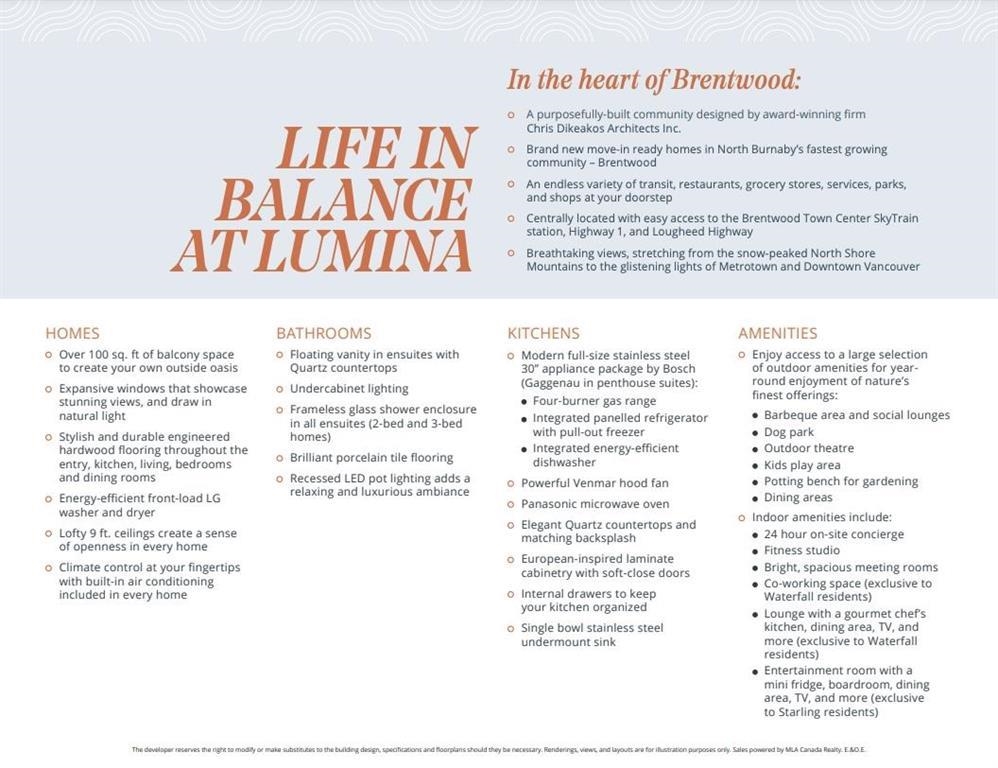NW corner unit at Lumina Waterfall in the heart of Brentwood. This spacious 2 bed, 2 bath home offers an open layout with great natural light, NW exposure, mountain views, high ceilings, and an oversized balcony. Features include a gourmet kitchen with Bosch stainless steel appliances and air conditioning for year-round comfort. Exceptional amenities include a fitness centre, yoga, games and music rooms, outdoor social space, dog run, guest suites, and 24/7 concierge. 1 parking & 1 locker included. Steps to...