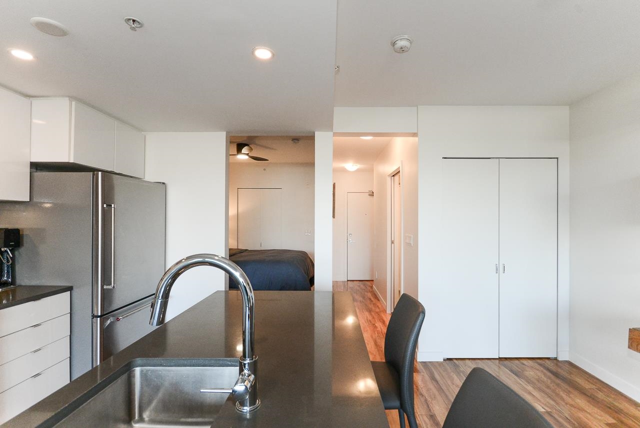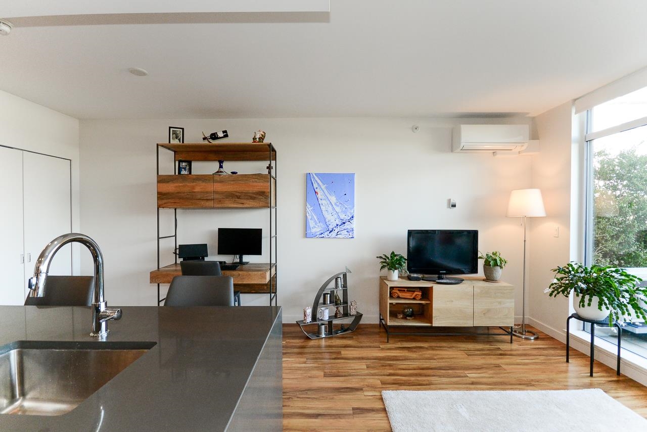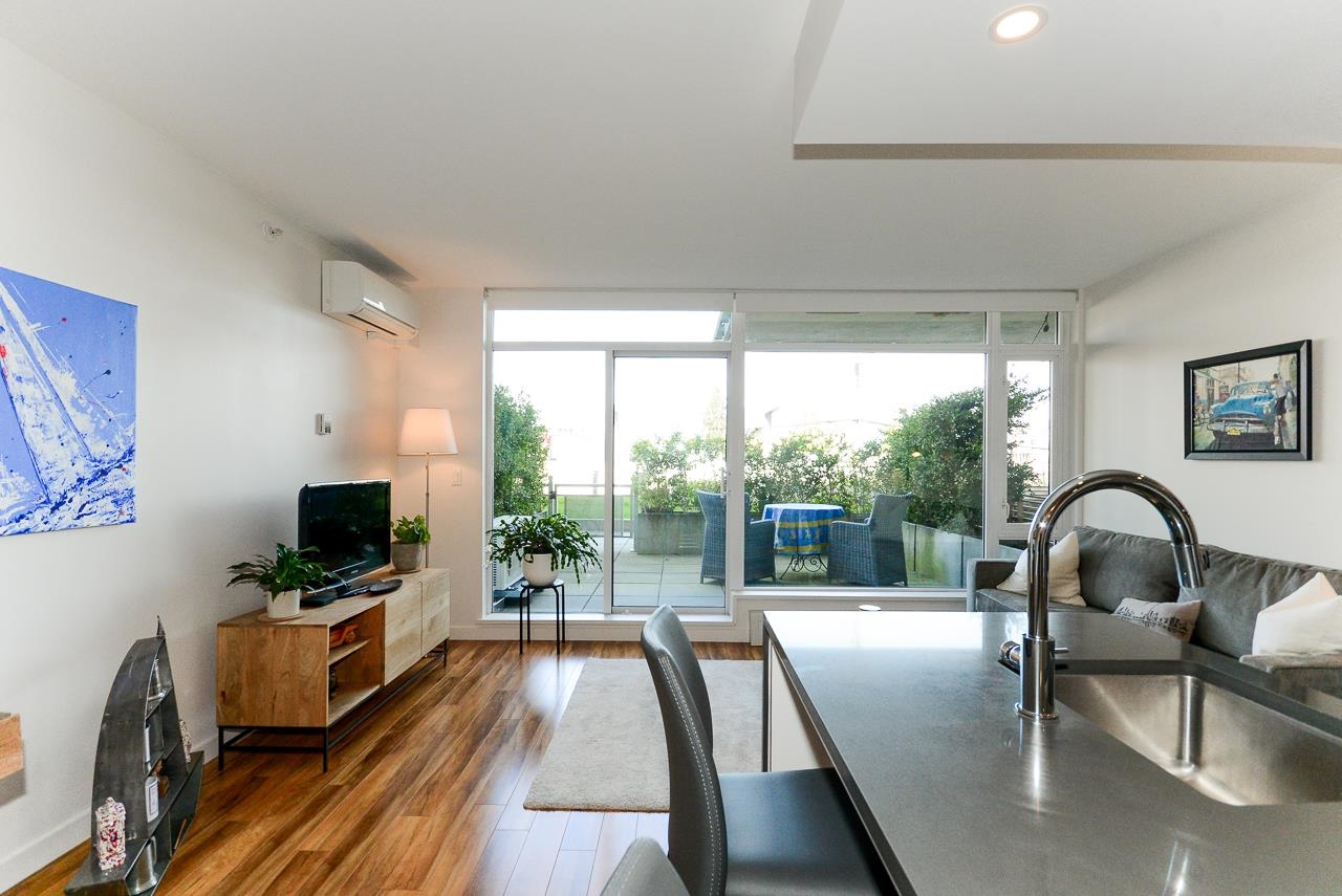 Great garden apartment in SHINE. This classy concrete low-rise is in the heart of Mount Pleasant with views of the North Shore Mountains. Nicer than new this spotless 1 bedroom boasts the "Great Room" living with a bright white kitchen, quartz counters, big island & wall to wall windows overlooking the private 175 sq. ft. patio. This outdoor space extends your living area and overlooks a secure garden. heat & hot water are included in the maintenance fee. There is a new refrigerator, remote control bli...