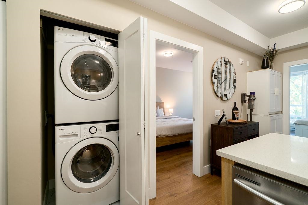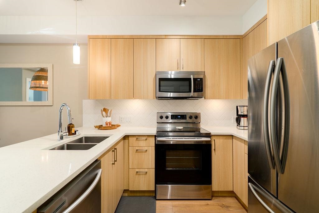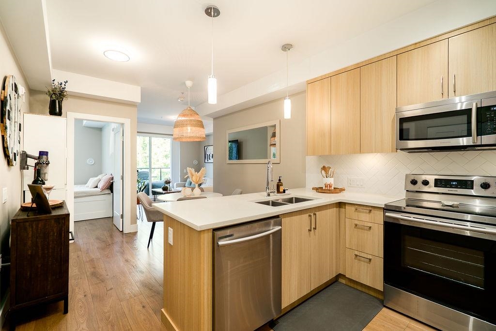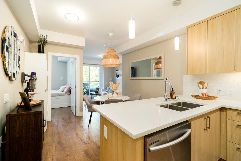 Welcome to The Orion - a sleek, West Coast development located in the heart of Pitt Meadows. Ideally situated within walking distance to amenities, transit, shopping & WCE. Commuter friendly with quick access to Langley & tri-cities. This tranquil and bright west facing unit has a covered patio for all seasons and near serene walking trails, parks, schools & childcare. Featuring high quality laminate flooring throughout, in floor heating with non slip tiles in both bathrooms, upgraded kitchen backsplash & q...