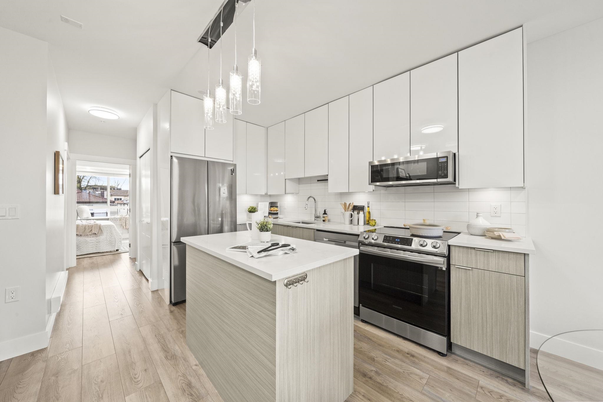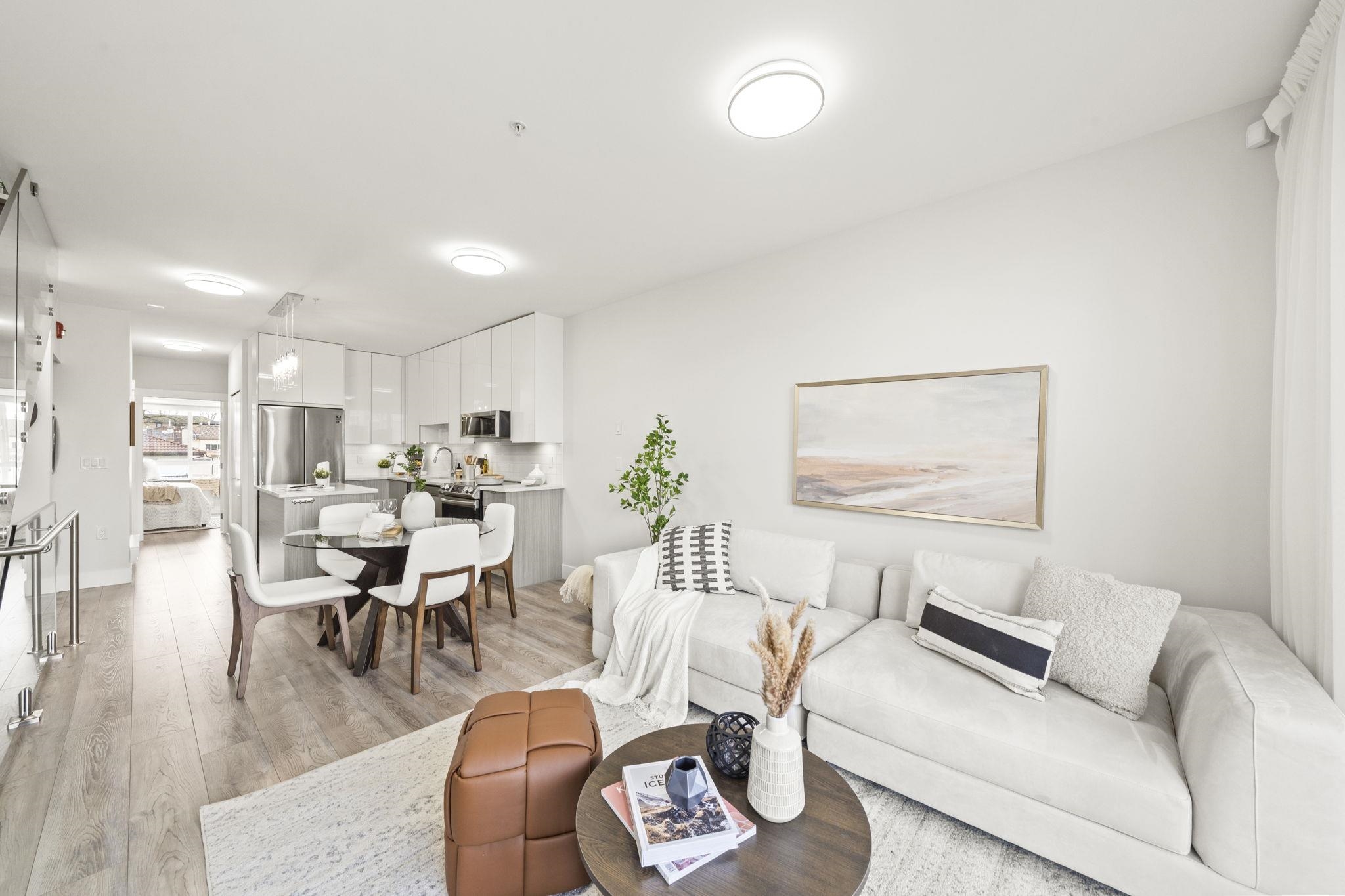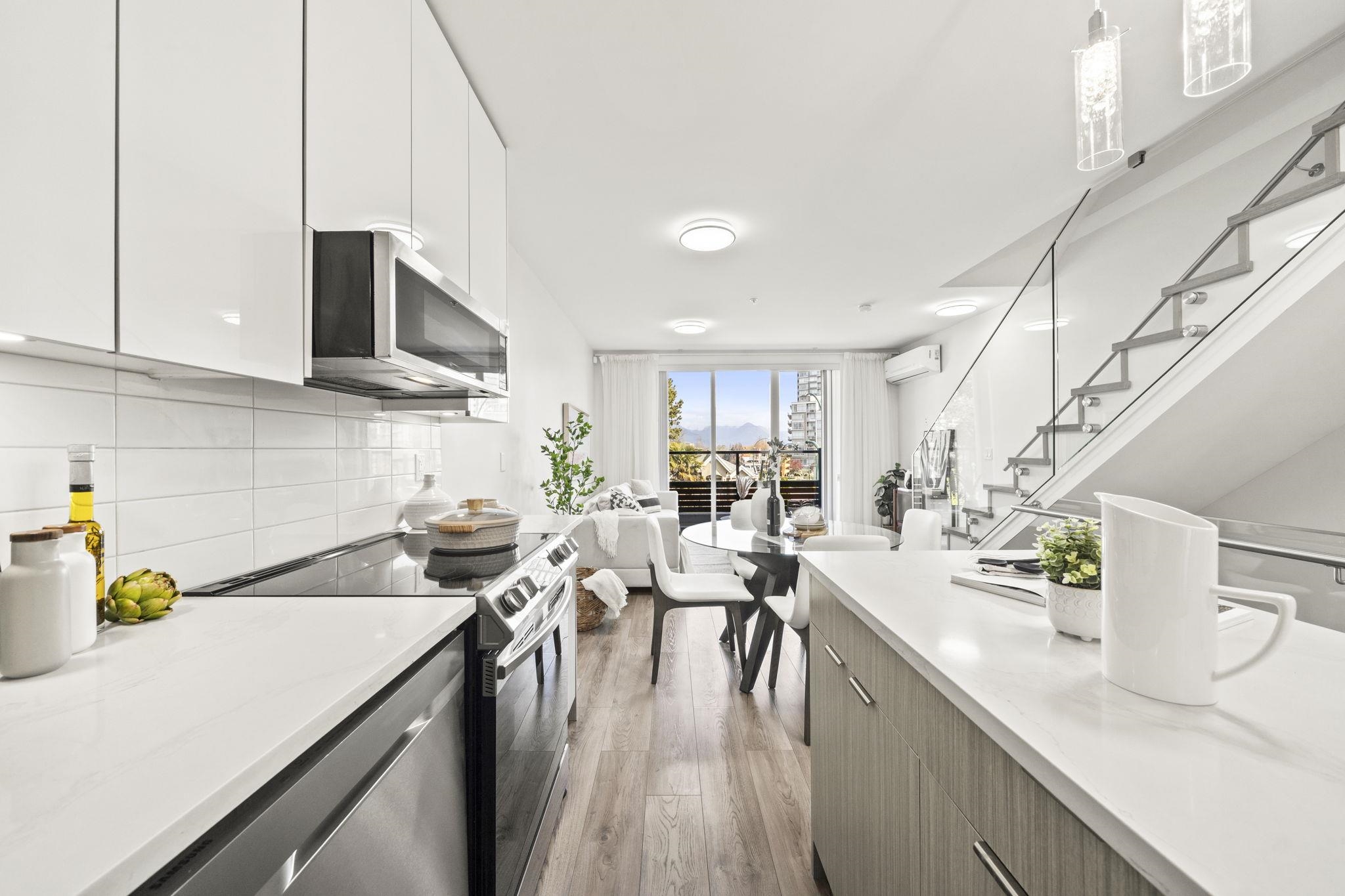 Modern, sun-filled 3-bedroom townhouse offering over 1,200 sqft of thoughtfully designed living space plus an impressive 300 sqft of outdoor space across three decks. Recently refreshed with new paint, this home features a heat pump for year-round comfort with A/C, an open-concept kitchen with a pantry closet, flowing seamlessly into a dedicated dining area and a bright, airy living room that opens onto a BBQ balcony. All 3 bedrooms are generously sized, while the upper level showcases two expansive rooftop...