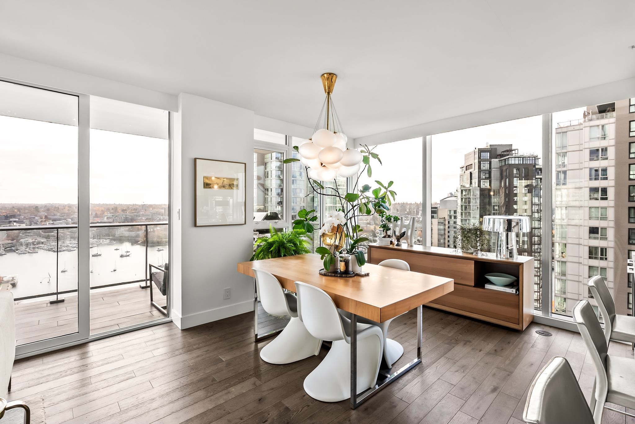 Unparalleled luxury on the 25th floor at The Charleson. This designer suite spans over 1643 sft with a view that will take your breath away. Featuring engineered hardwood throughout the home & numerous upgrades including tasteful designer lighting, wallpaper, herringbone wood floors, walk in closet & marble fireplace. An open plan chef's kitchen overlooks the expansive LR & DR, w/ sweeping views overlooking David Lam Park, False Creek, City Hall & beyond. The Primary suite offers plenty of space for your ki...