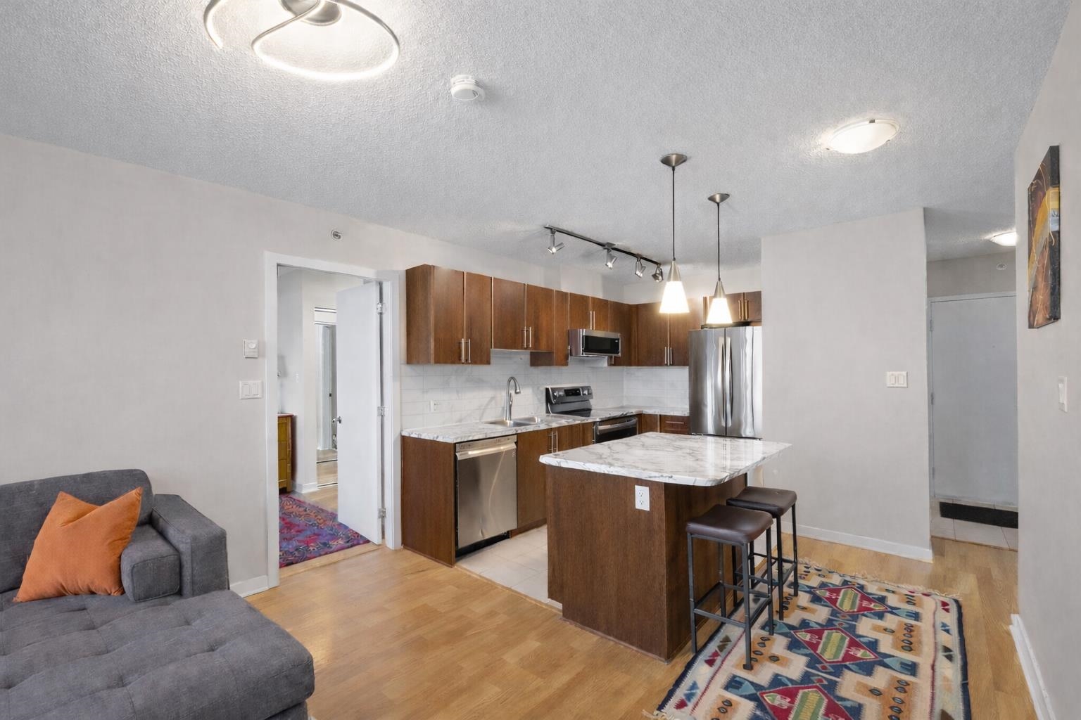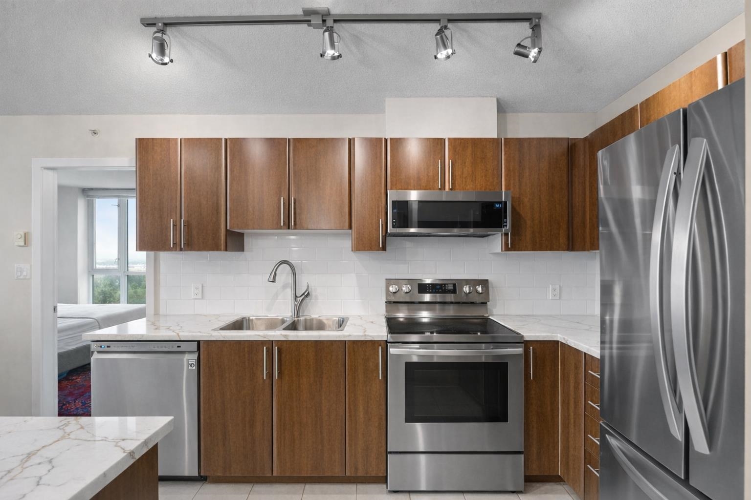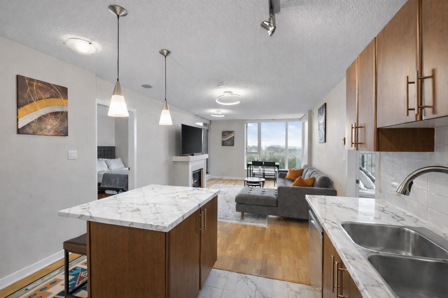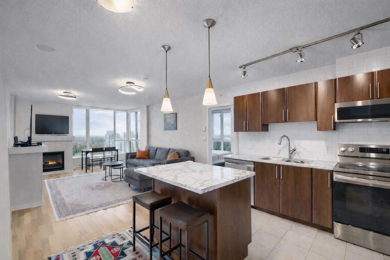 Welcome to Obelisk! This modern 2-Bed + Den home sits on the quiet side of the building, offering unobstructed views of Mount Baker and the city skyline. The bright, open layout features floor-to-ceiling windows, a chef-inspired kitchen with abundant cabinetry, counter-tops upgraded January 2026, and a spacious Den that can function as a 3rd bedroom or home office. Both bathrooms are tastefully updated. Enjoy unmatched convenience- just minutes to SkyTrain, Douglas College, Coquitlam Centre, Lafarge Lake, s...