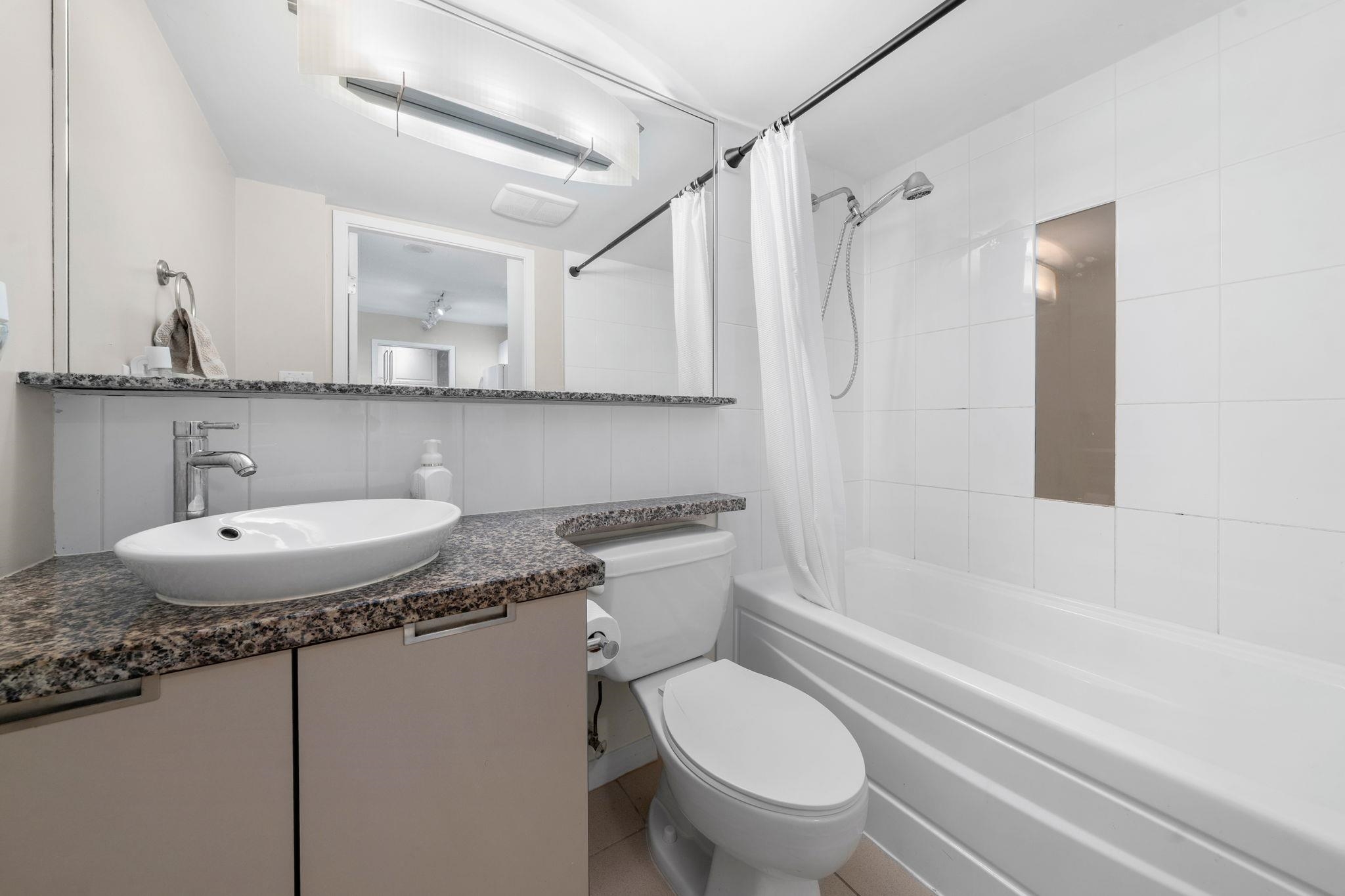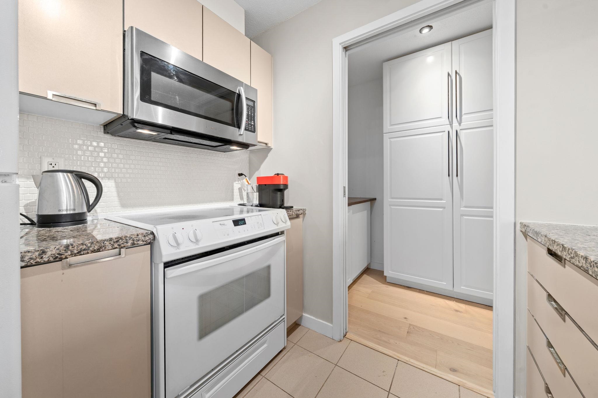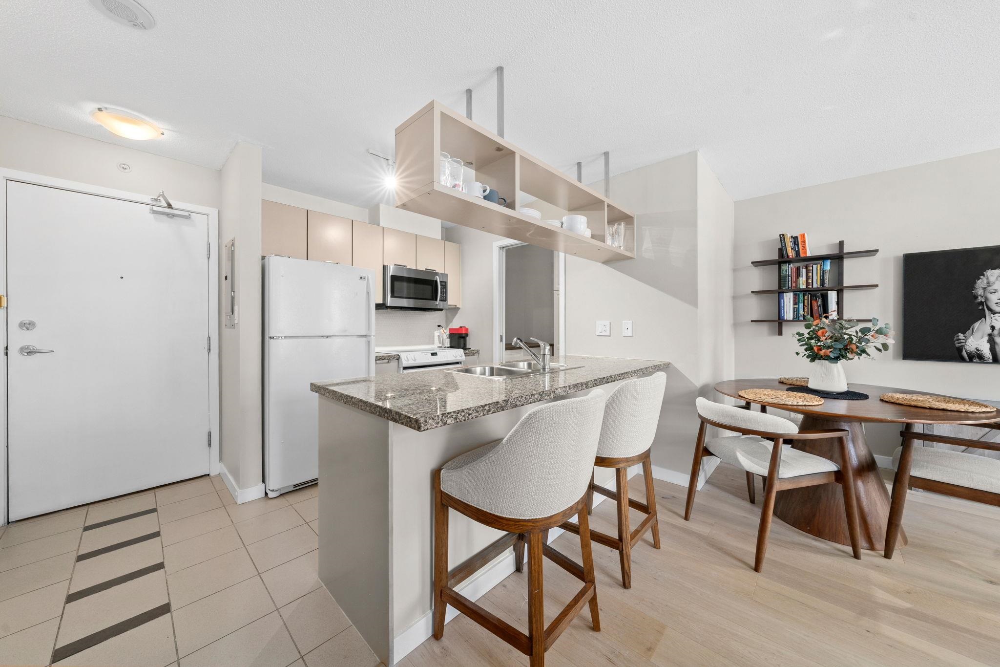 Well maintained and updated Owner Occupied one bedroom home in the well run Freesia building. This suite features floor-to-ceiling windows throughout, upgraded Oak hardwood floors, and open concept dining and living rooms. The bedroom is well sized and comfortably fits a king-sized bed. The kitchen has plenty of storage and features granite counters with bar seating. There is also a large pantry with ample built in storage. The home also features a deck overlooking the streetscape and has in suite laundry. ...